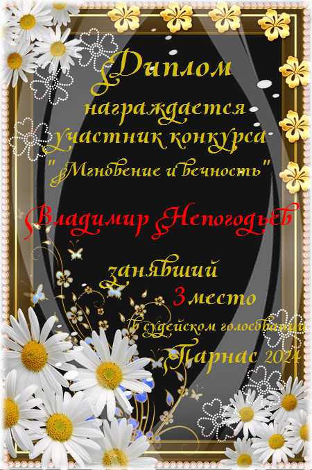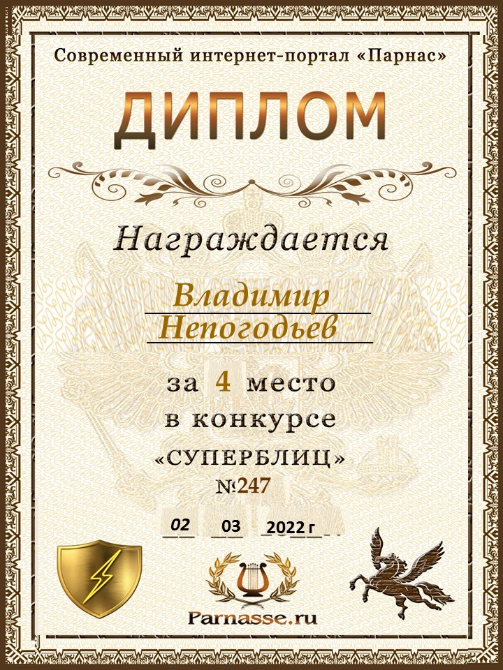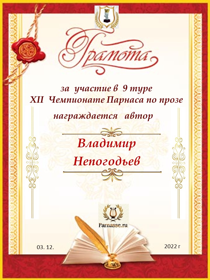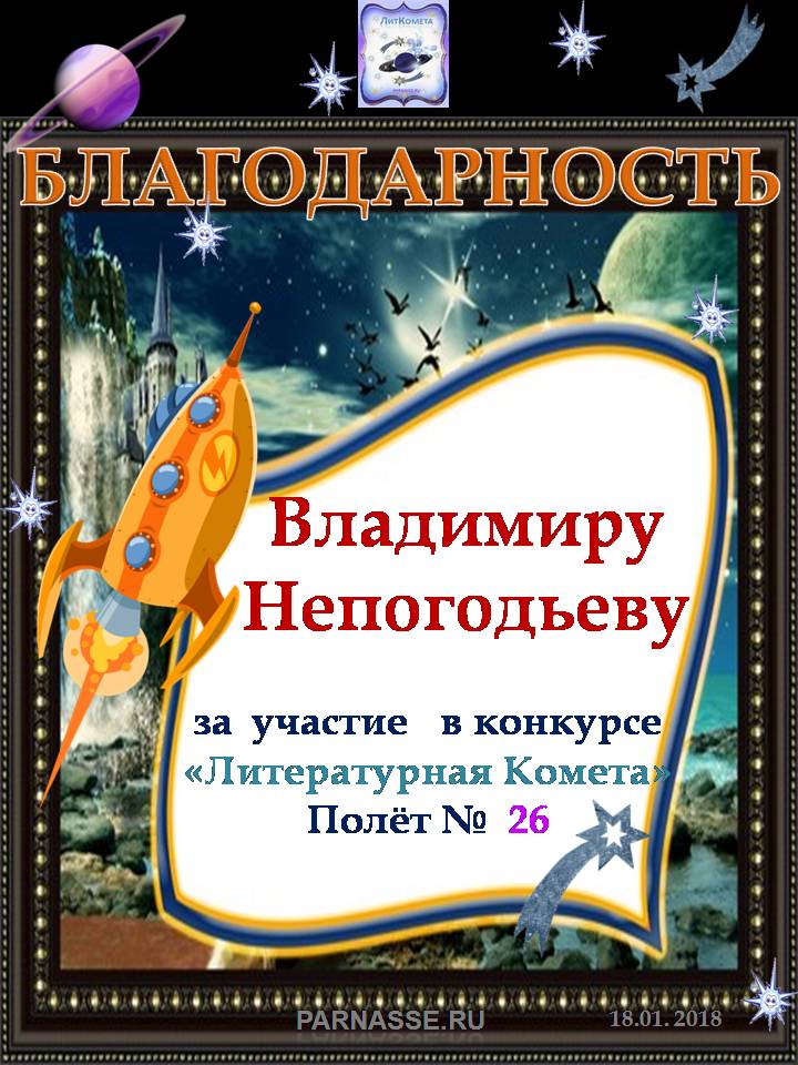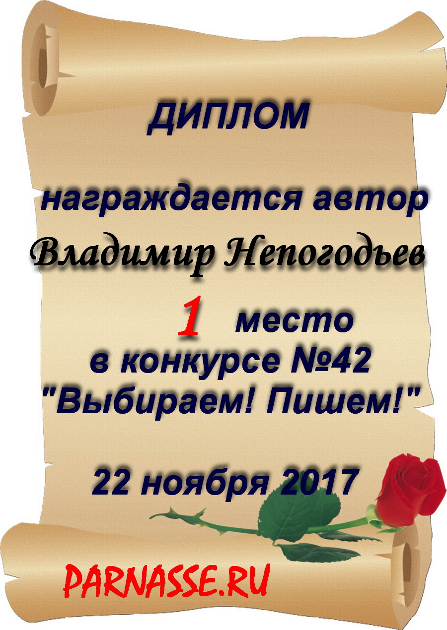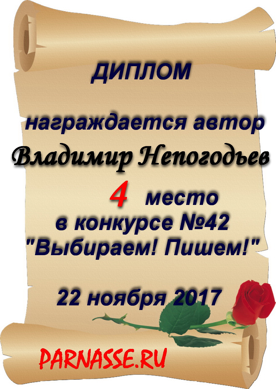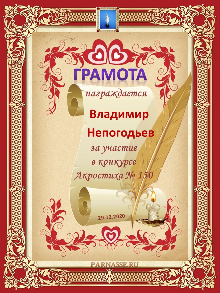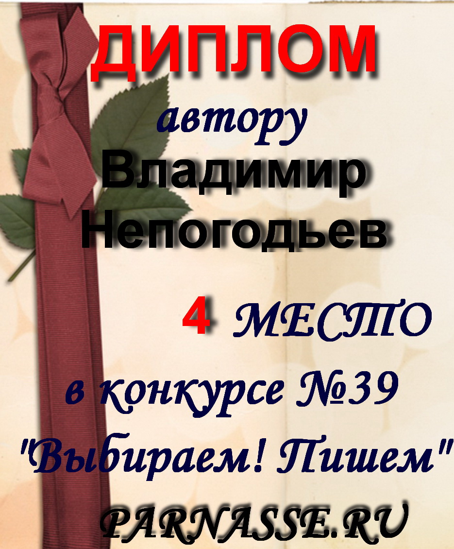 Номинация "Лучшее поздравление Парнасу в прозе".Искренне и от всего сердца благодарим Вас, ВЛАДИМИР, за участие в юбилейном конкурсе, за Ваши прекрасные, ярчайшие слова благодарности нашему порталу! Мы желаем Вам крепкого здоровья, жизнелюбия, творческой Музы и исполнения самых заветных желаний, которые только у Вас есть!