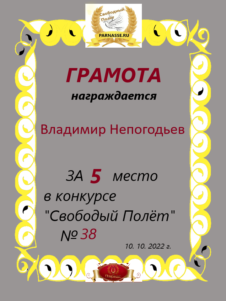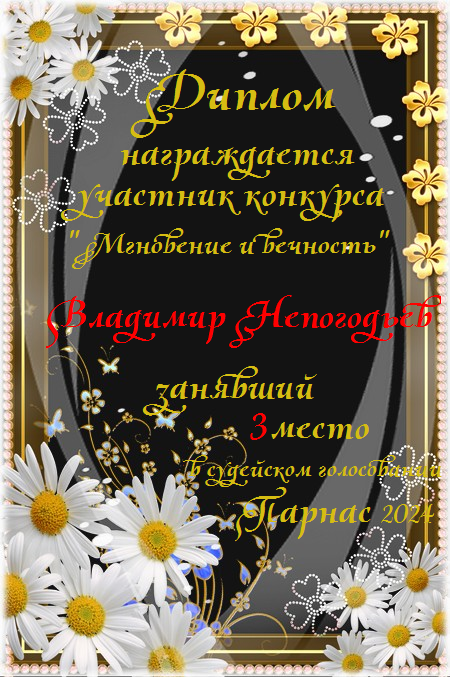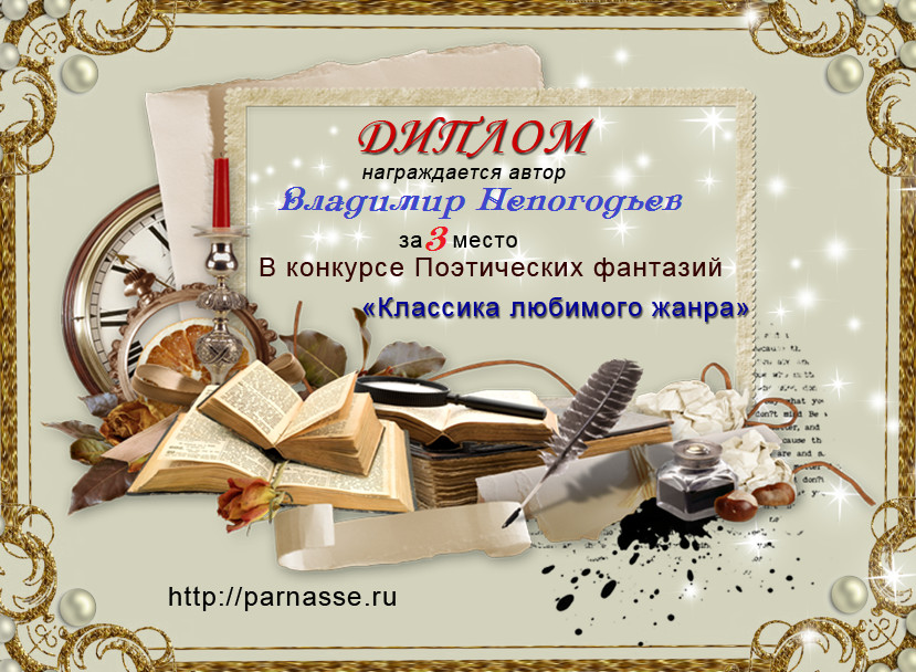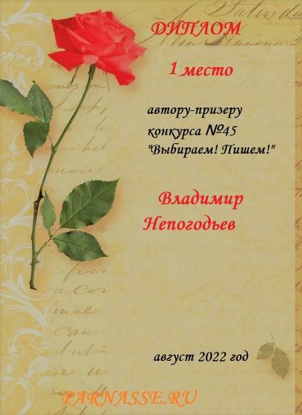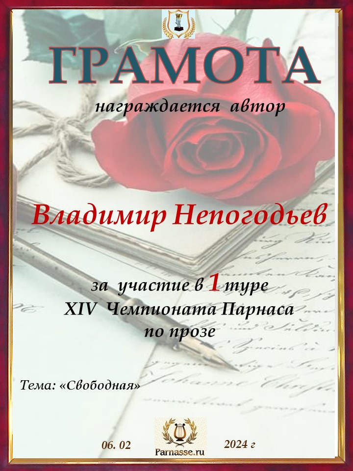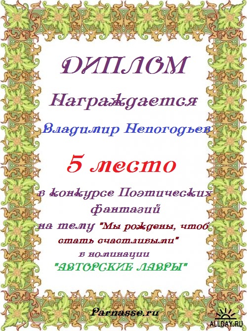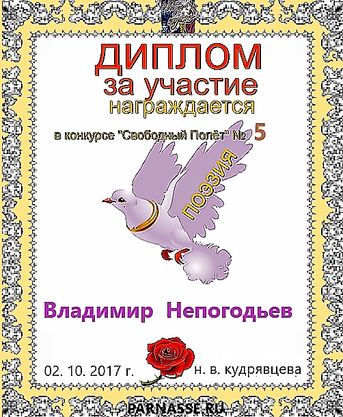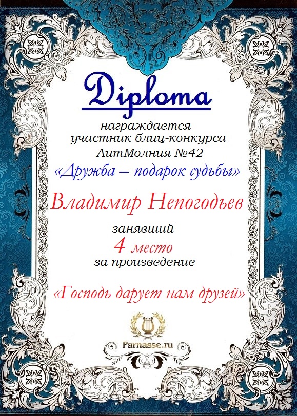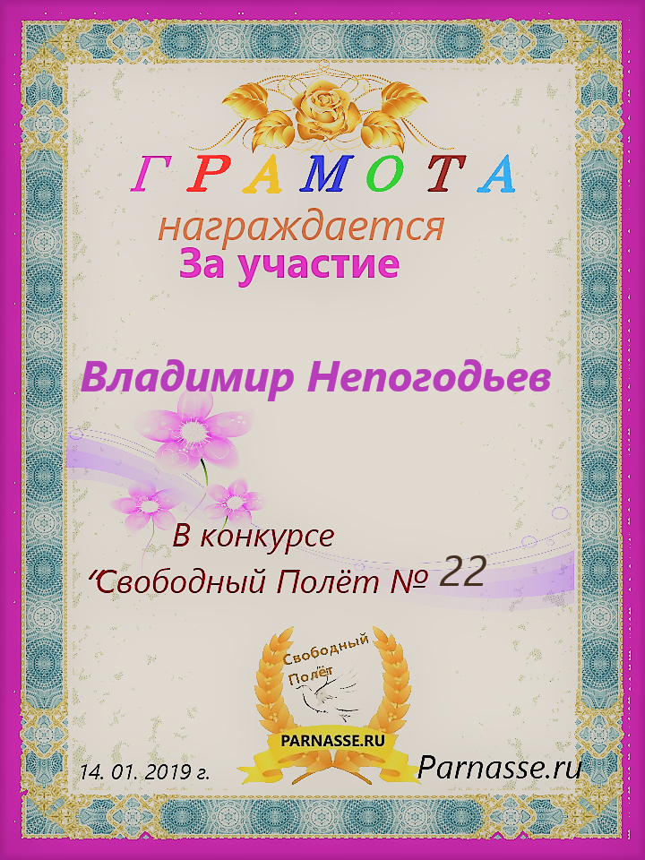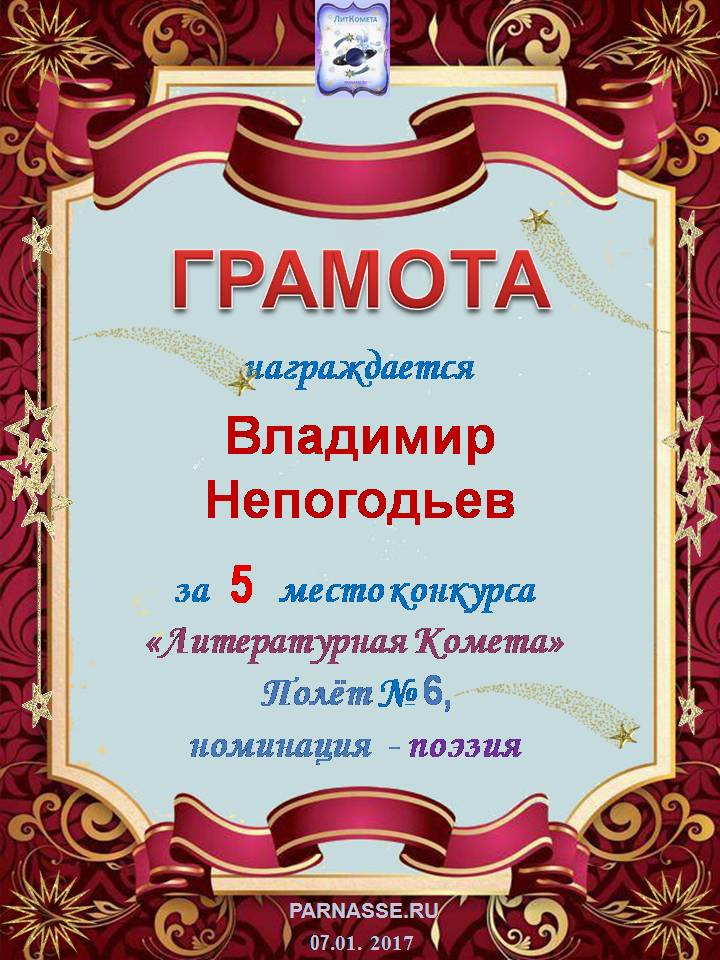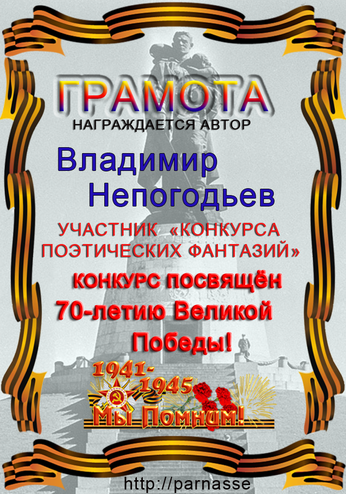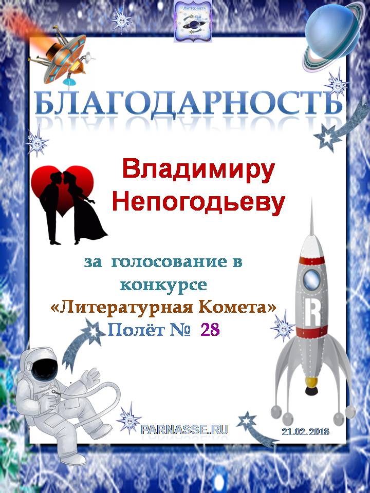 Номинация "Лучшее поздравление Парнасу в прозе".Искренне и от всего сердца благодарим Вас, ВЛАДИМИР, за участие в юбилейном конкурсе, за Ваши прекрасные, ярчайшие слова благодарности нашему порталу! Мы желаем Вам крепкого здоровья, жизнелюбия, творческой Музы и исполнения самых заветных желаний, которые только у Вас есть!