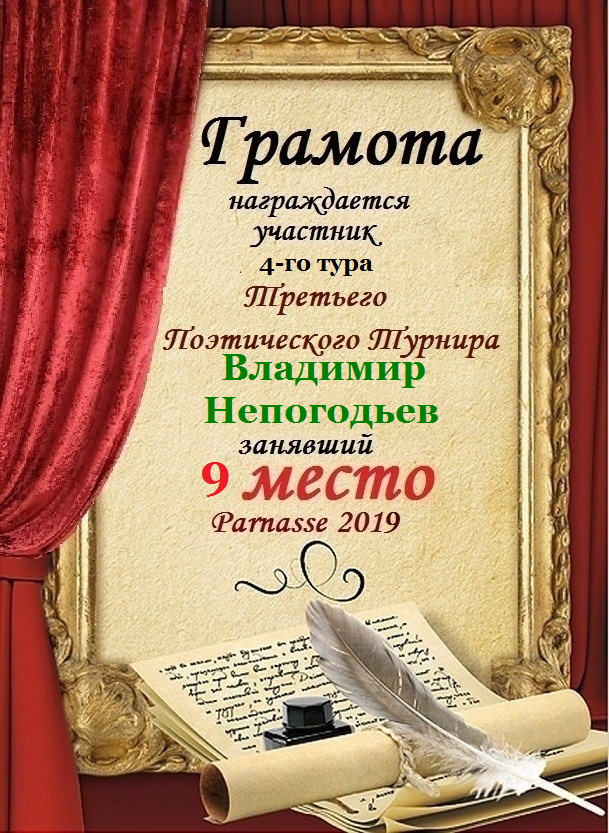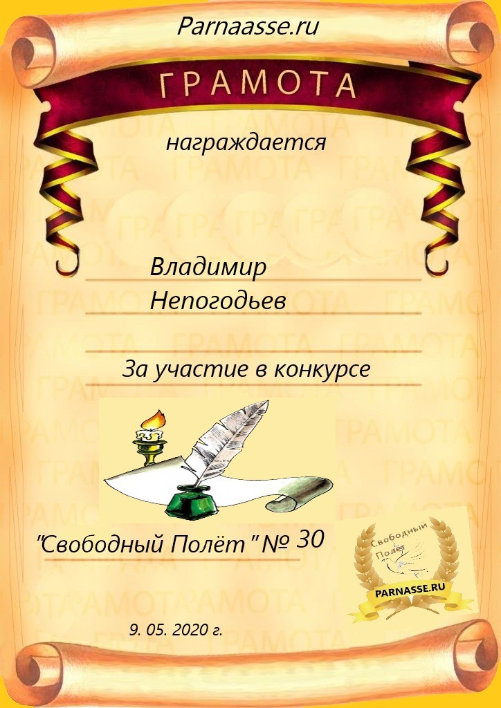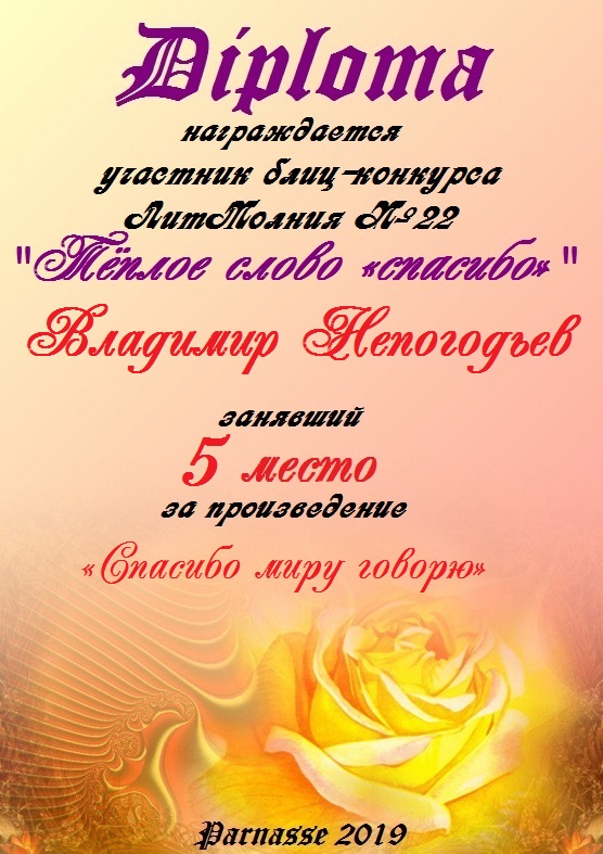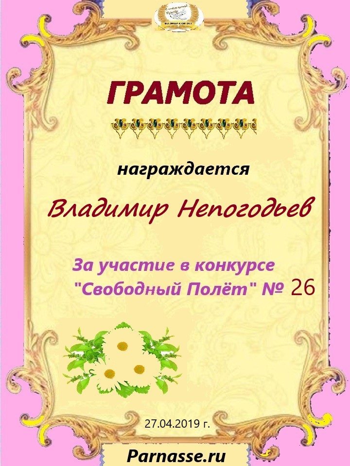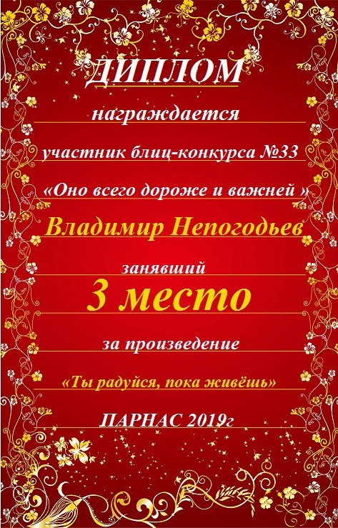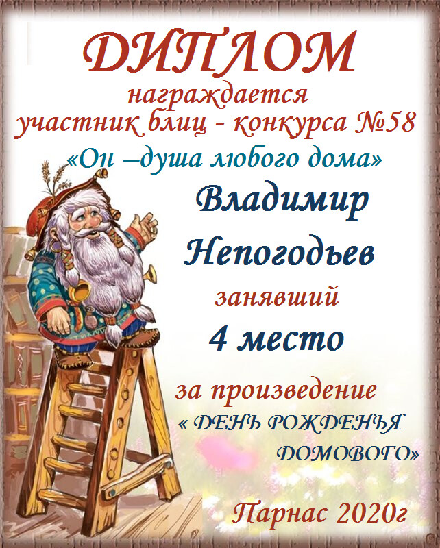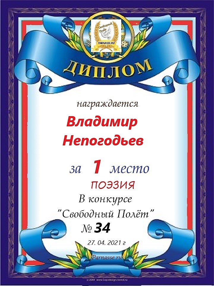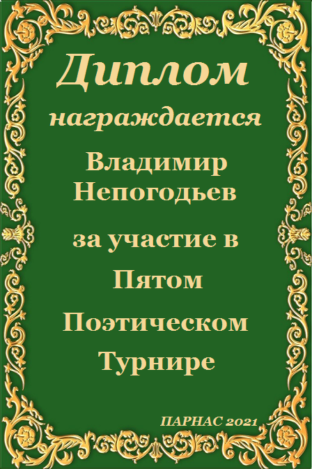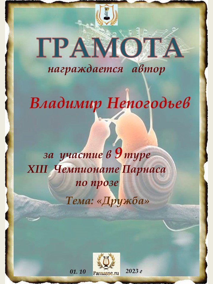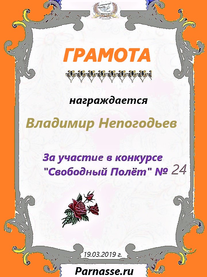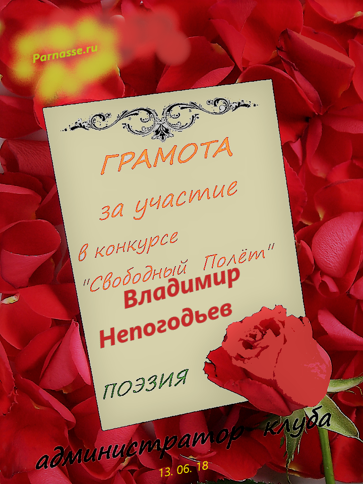 Номинация "Лучшее поздравление Парнасу в прозе".Искренне и от всего сердца благодарим Вас, ВЛАДИМИР, за участие в юбилейном конкурсе, за Ваши прекрасные, ярчайшие слова благодарности нашему порталу! Мы желаем Вам крепкого здоровья, жизнелюбия, творческой Музы и исполнения самых заветных желаний, которые только у Вас есть!