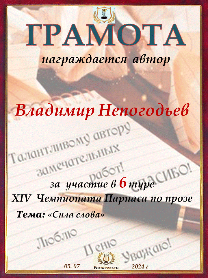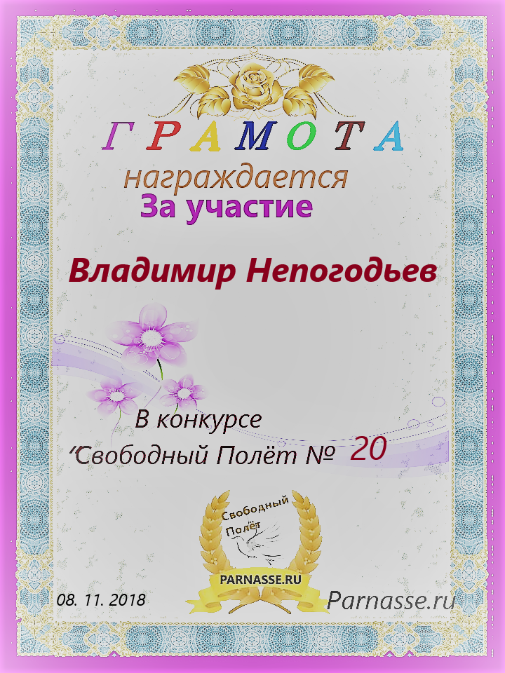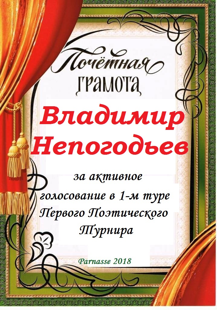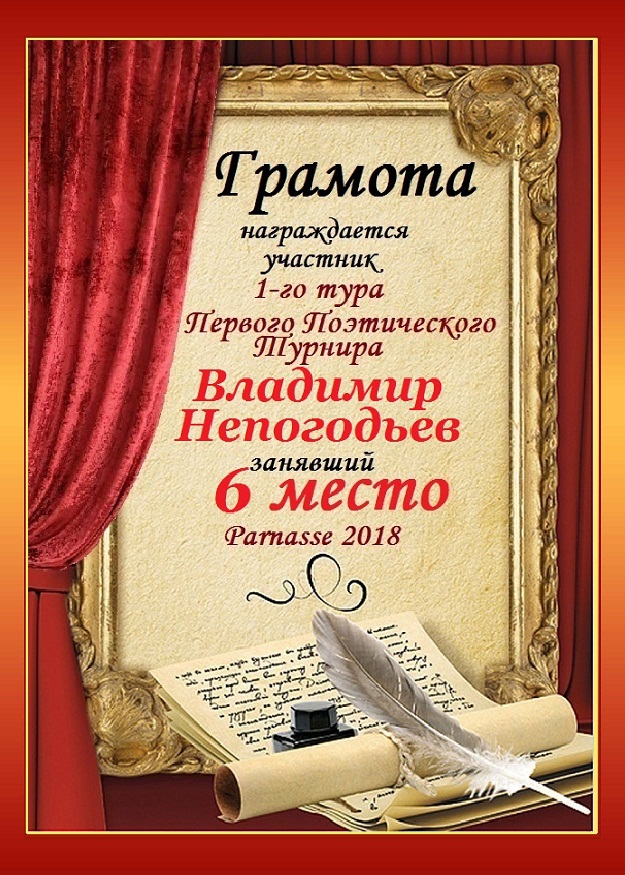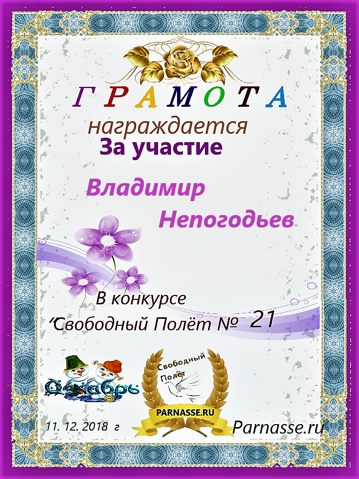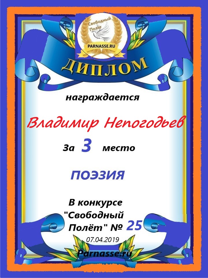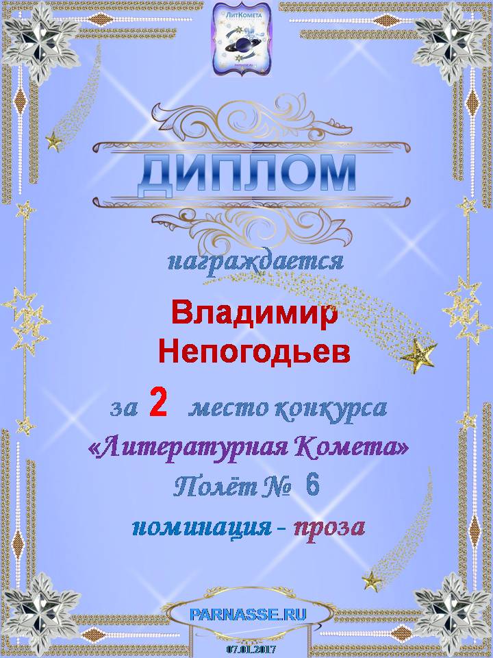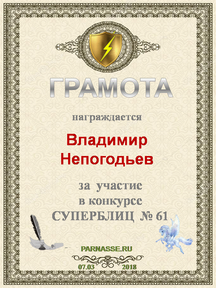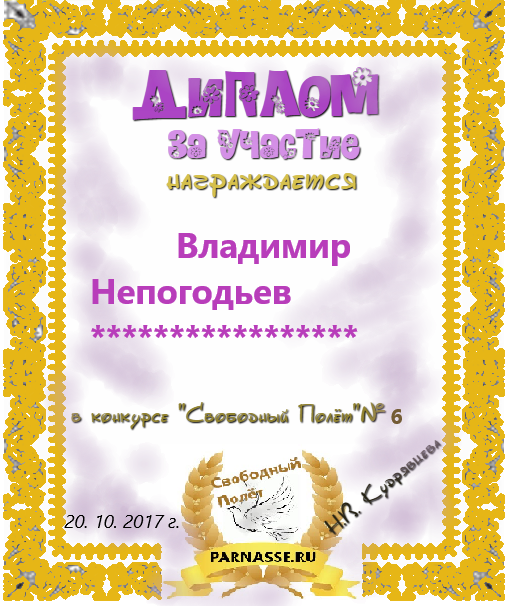 Номинация "Лучшее поздравление Парнасу в прозе".Искренне и от всего сердца благодарим Вас, ВЛАДИМИР, за участие в юбилейном конкурсе, за Ваши прекрасные, ярчайшие слова благодарности нашему порталу! Мы желаем Вам крепкого здоровья, жизнелюбия, творческой Музы и исполнения самых заветных желаний, которые только у Вас есть!