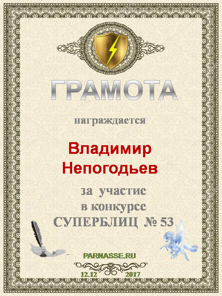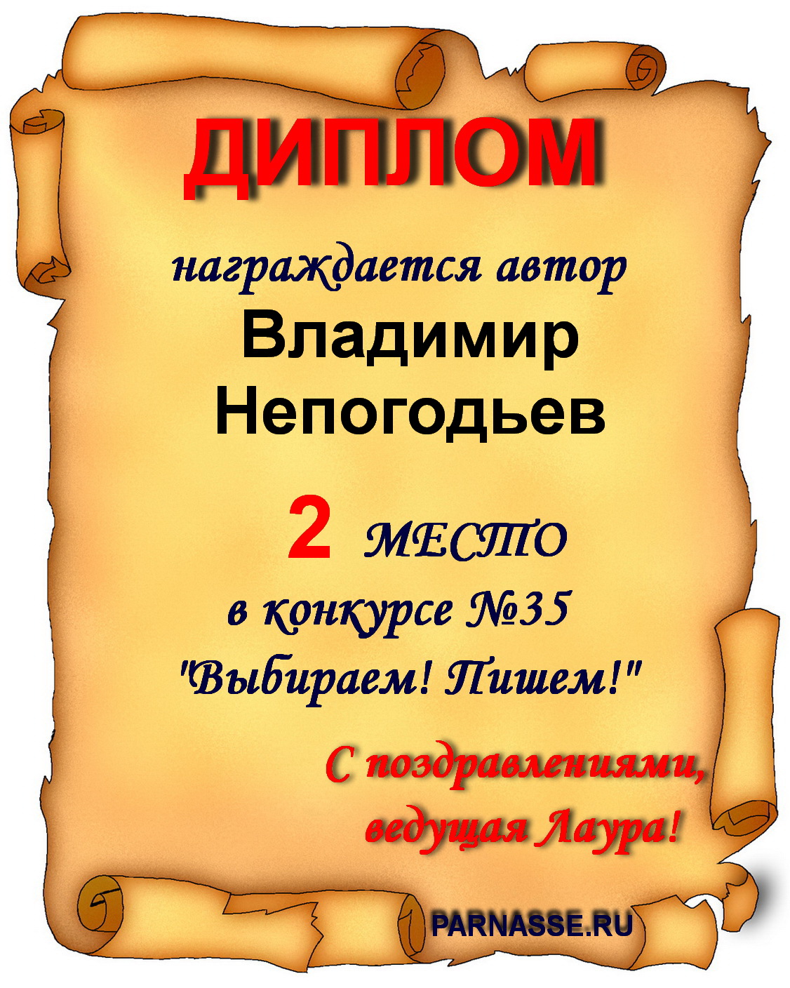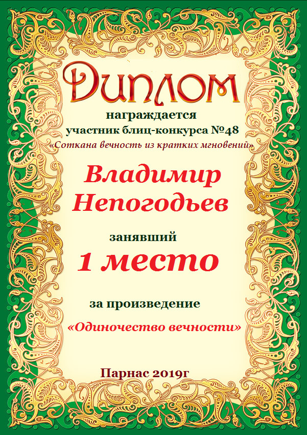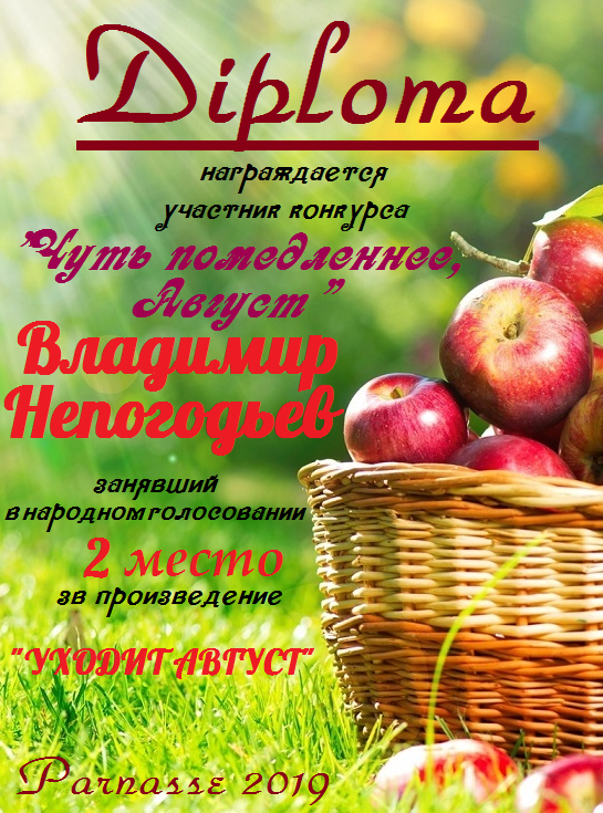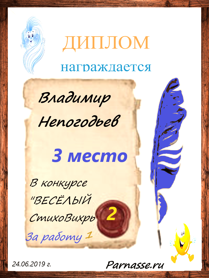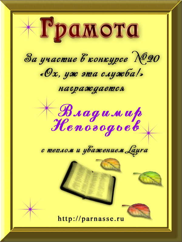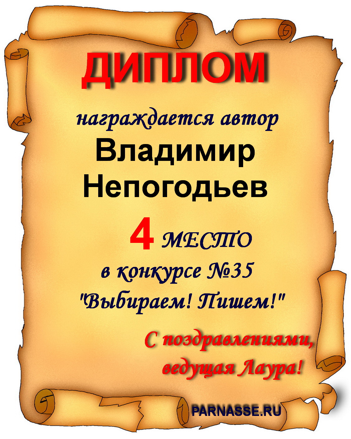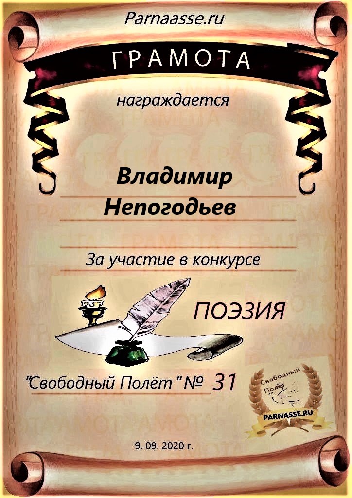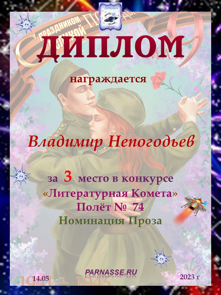 Номинация "Лучшее поздравление Парнасу в прозе".Искренне и от всего сердца благодарим Вас, ВЛАДИМИР, за участие в юбилейном конкурсе, за Ваши прекрасные, ярчайшие слова благодарности нашему порталу! Мы желаем Вам крепкого здоровья, жизнелюбия, творческой Музы и исполнения самых заветных желаний, которые только у Вас есть!