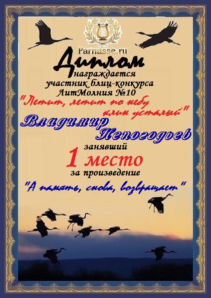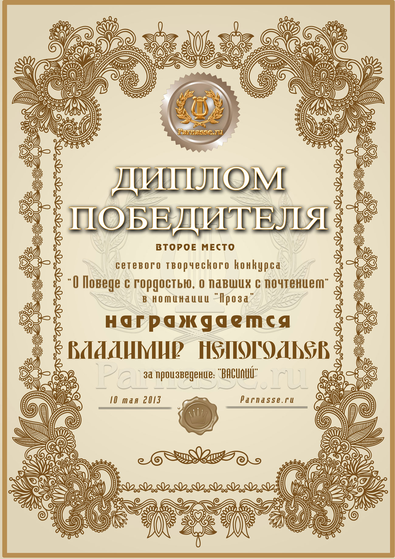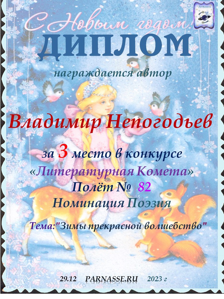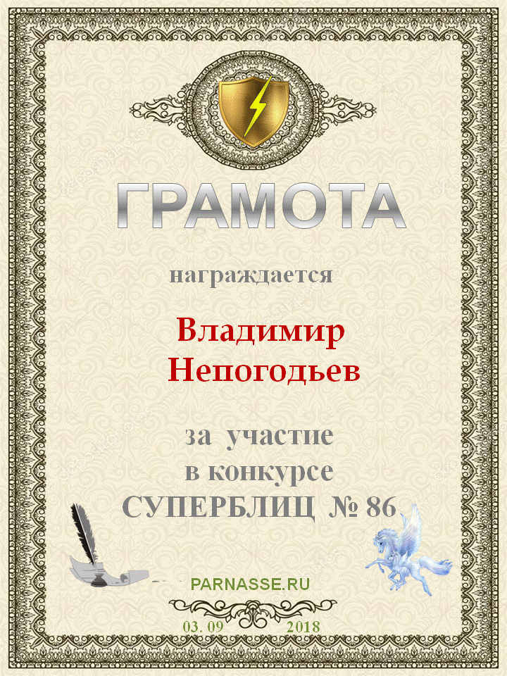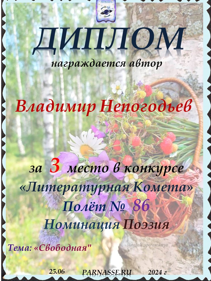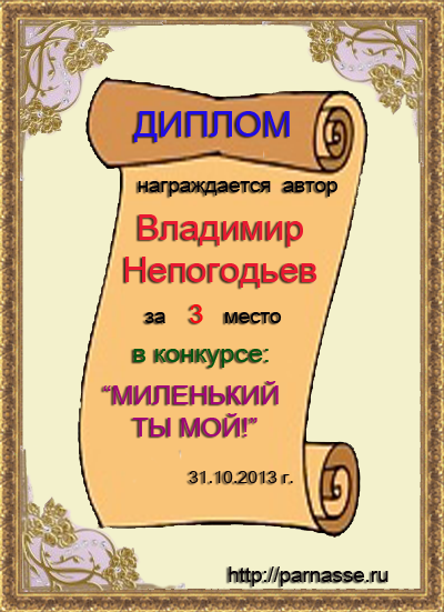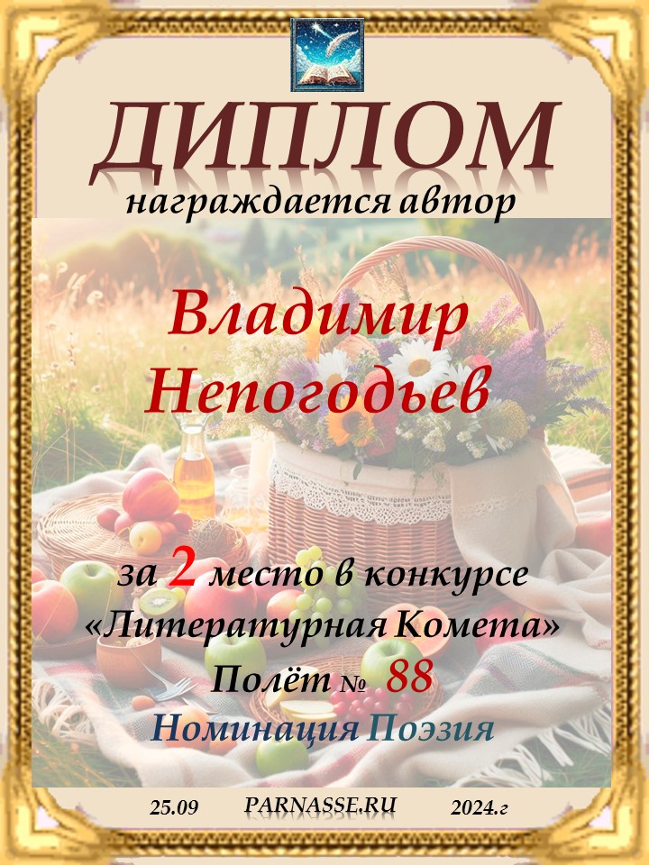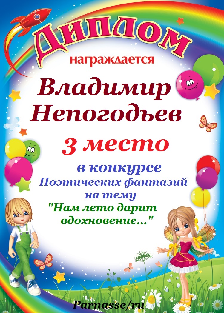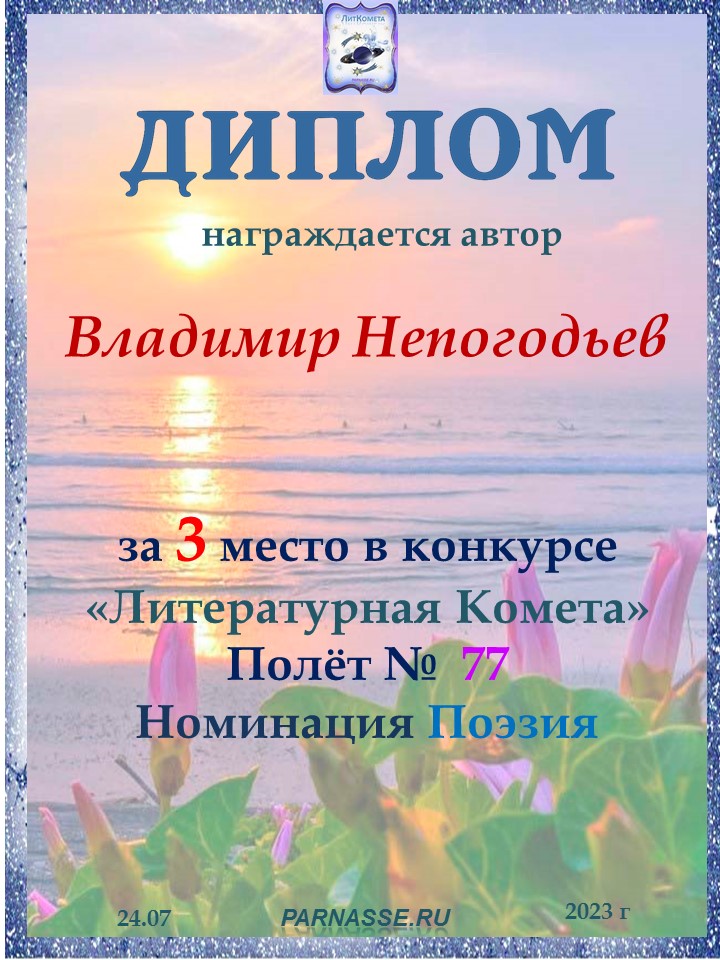 Номинация "Лучшее поздравление Парнасу в прозе".Искренне и от всего сердца благодарим Вас, ВЛАДИМИР, за участие в юбилейном конкурсе, за Ваши прекрасные, ярчайшие слова благодарности нашему порталу! Мы желаем Вам крепкого здоровья, жизнелюбия, творческой Музы и исполнения самых заветных желаний, которые только у Вас есть!