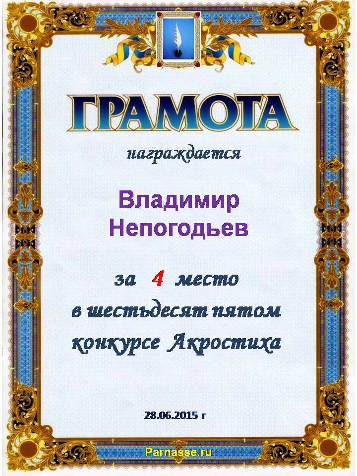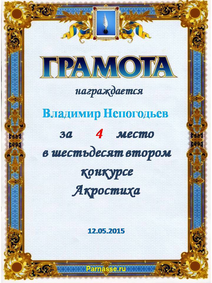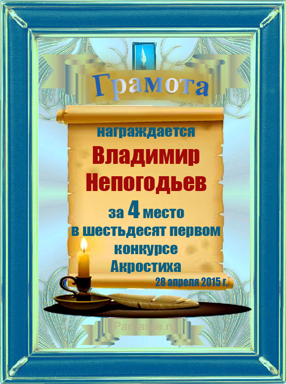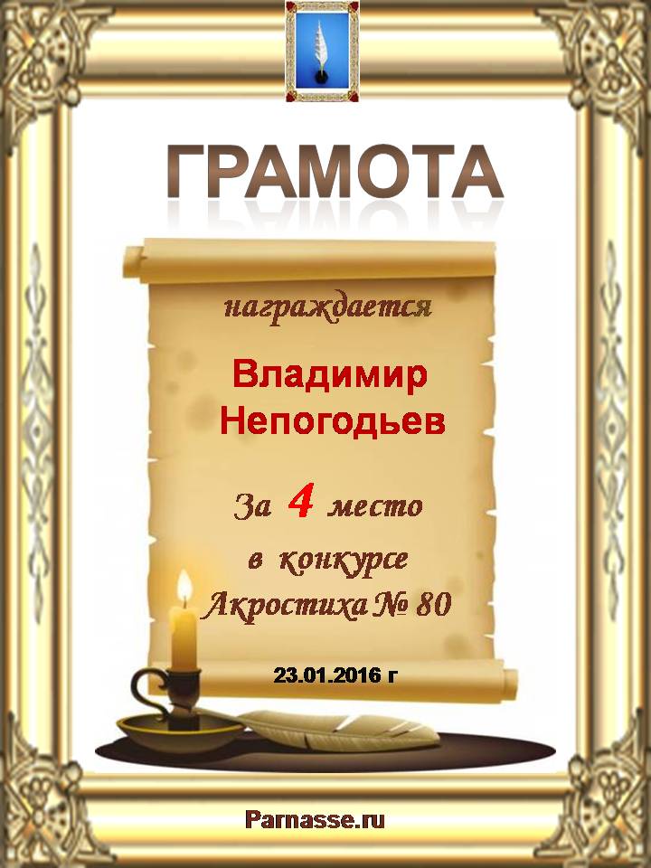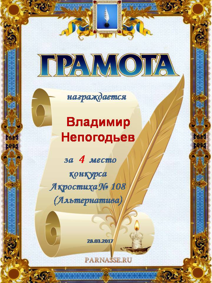 Грамота за 4 место в 108 конкурсе АКРОСТИХА (Альтернатива)! ПОЗДРАВЛЯЮ!