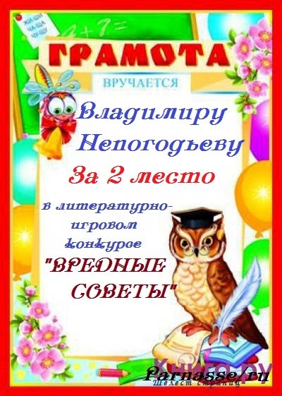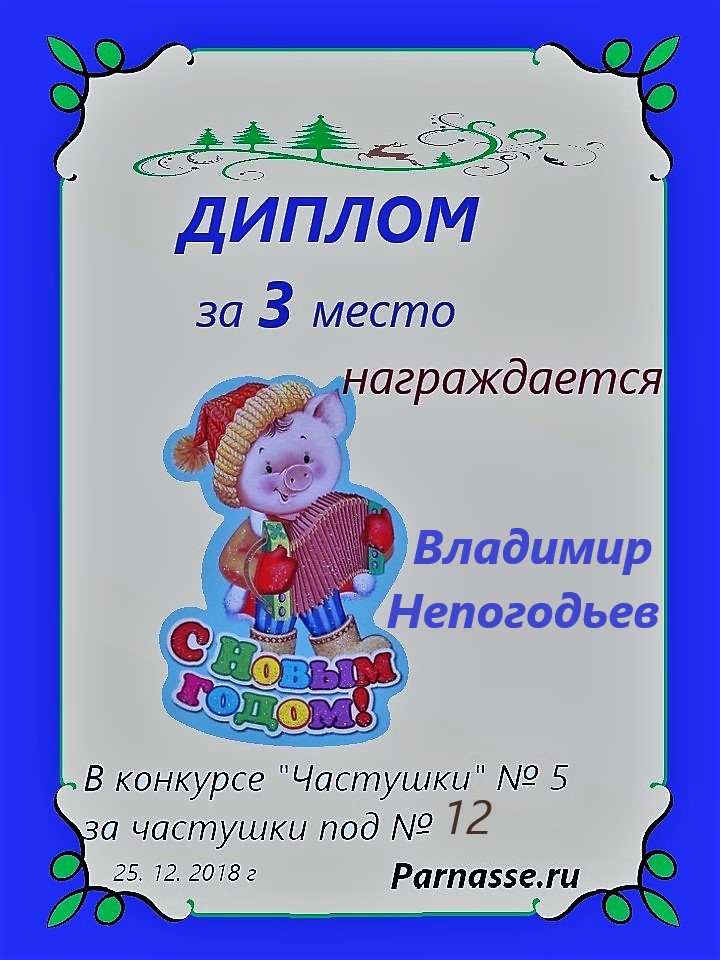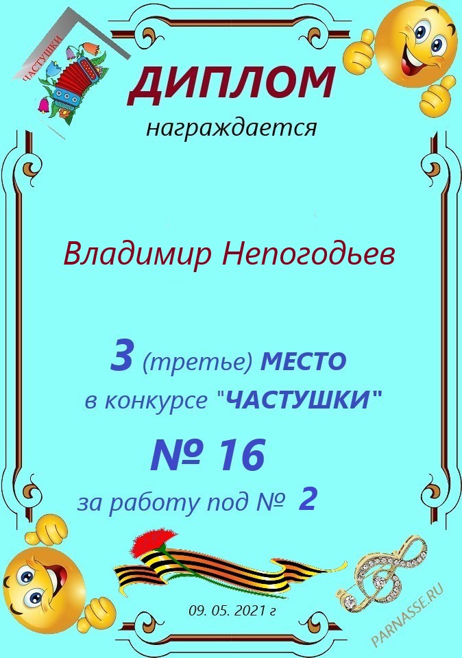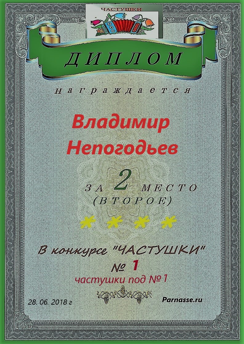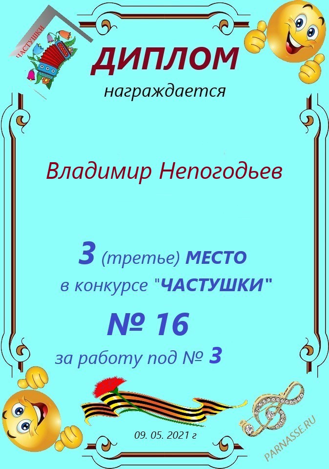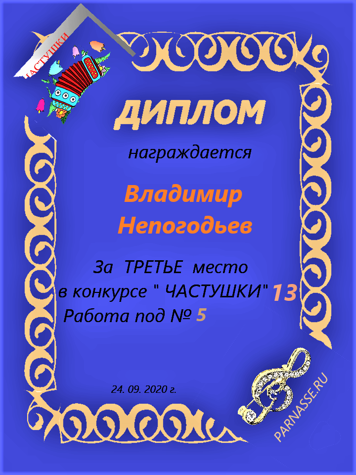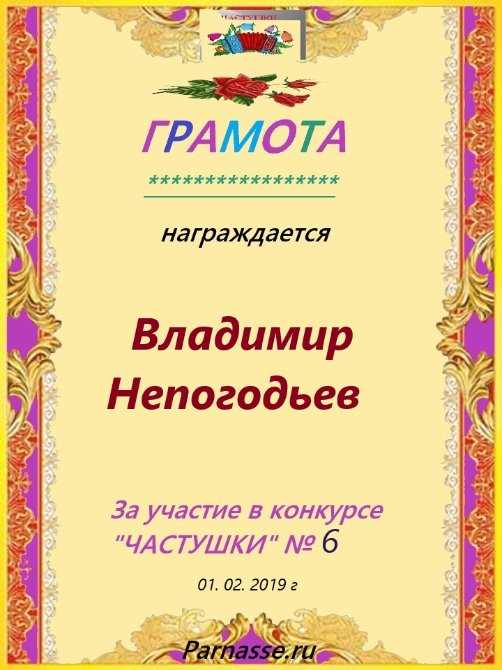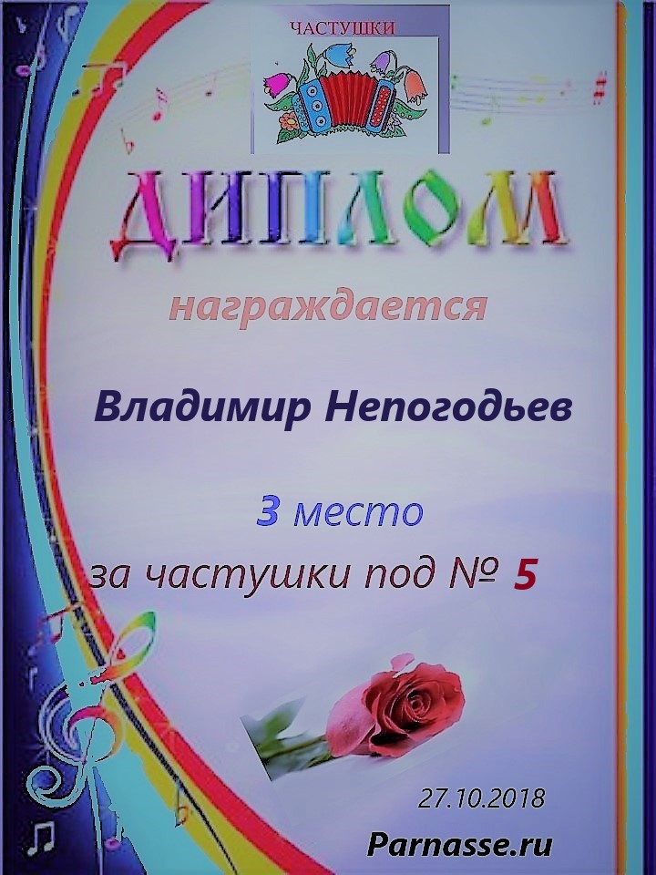 Грамота за 5 место в конкурсе частушек № 8++. Поздравляю, Владимир!