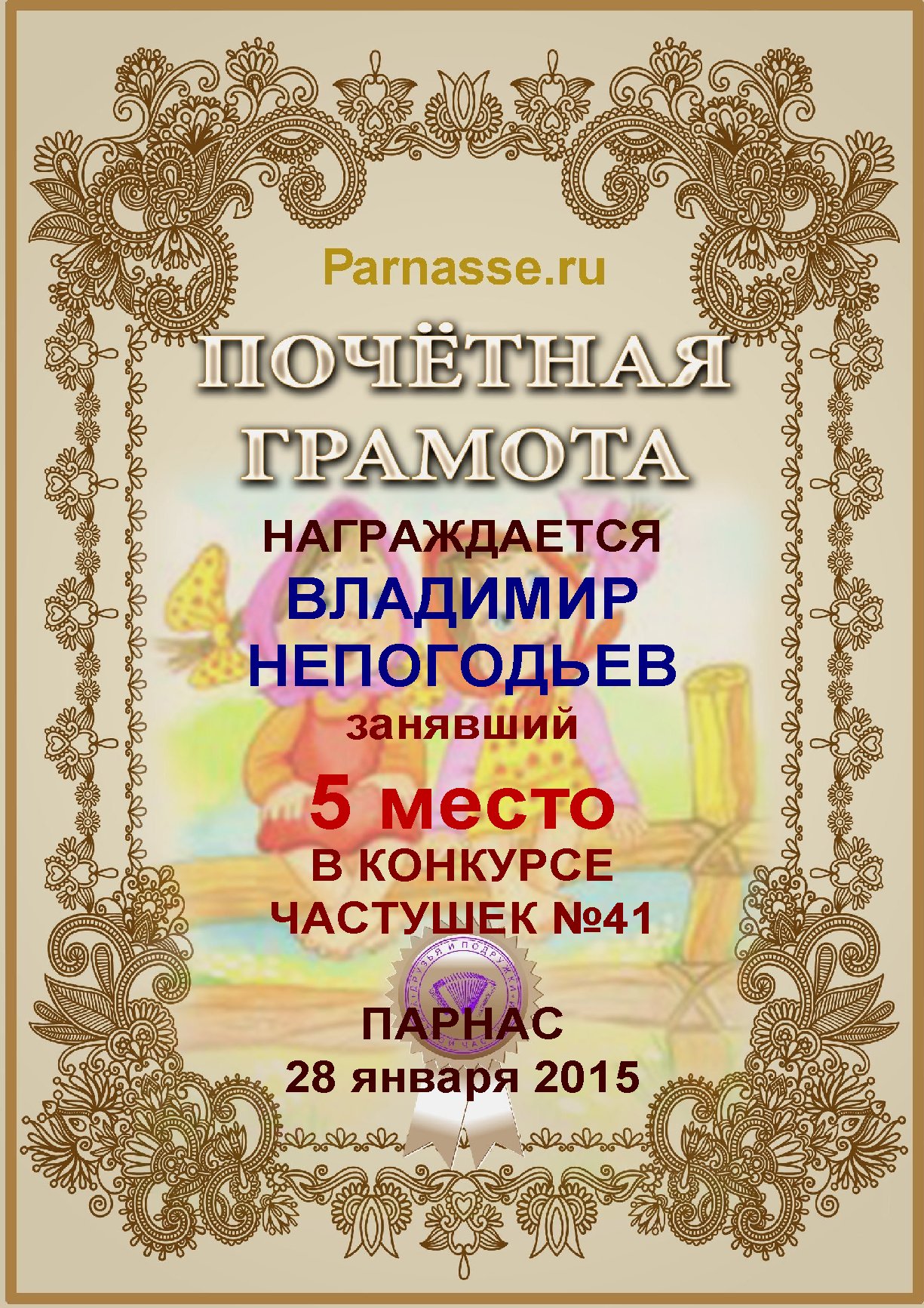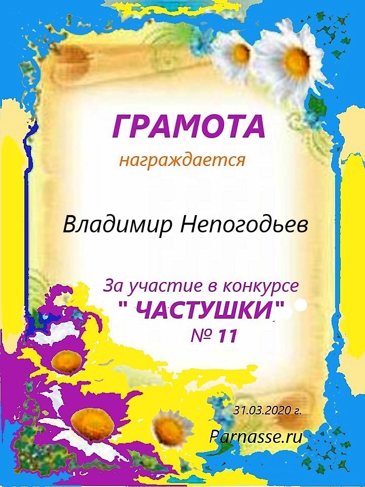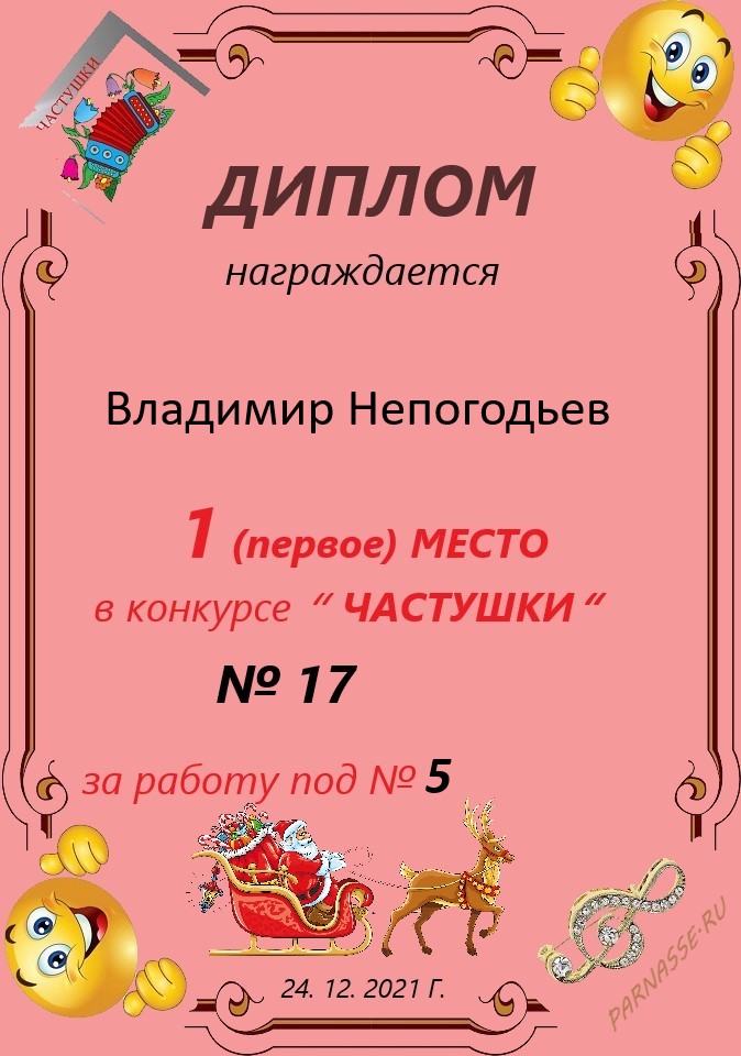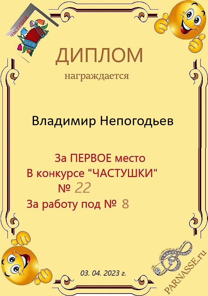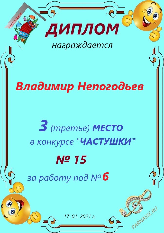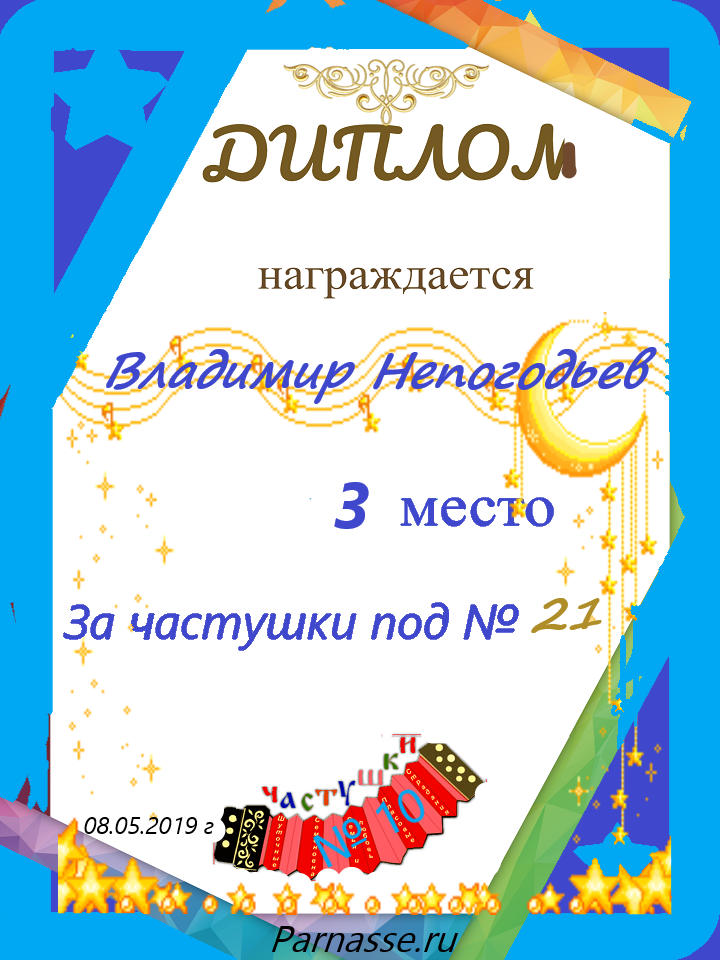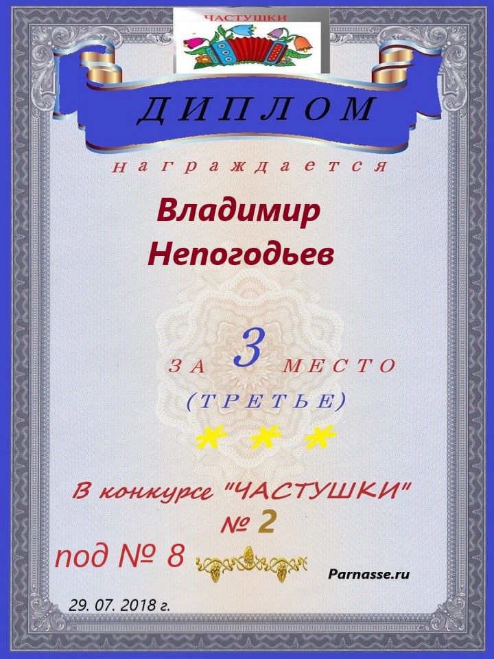 Грамота за 5 место в конкурсе частушек № 8++. Поздравляю, Владимир!