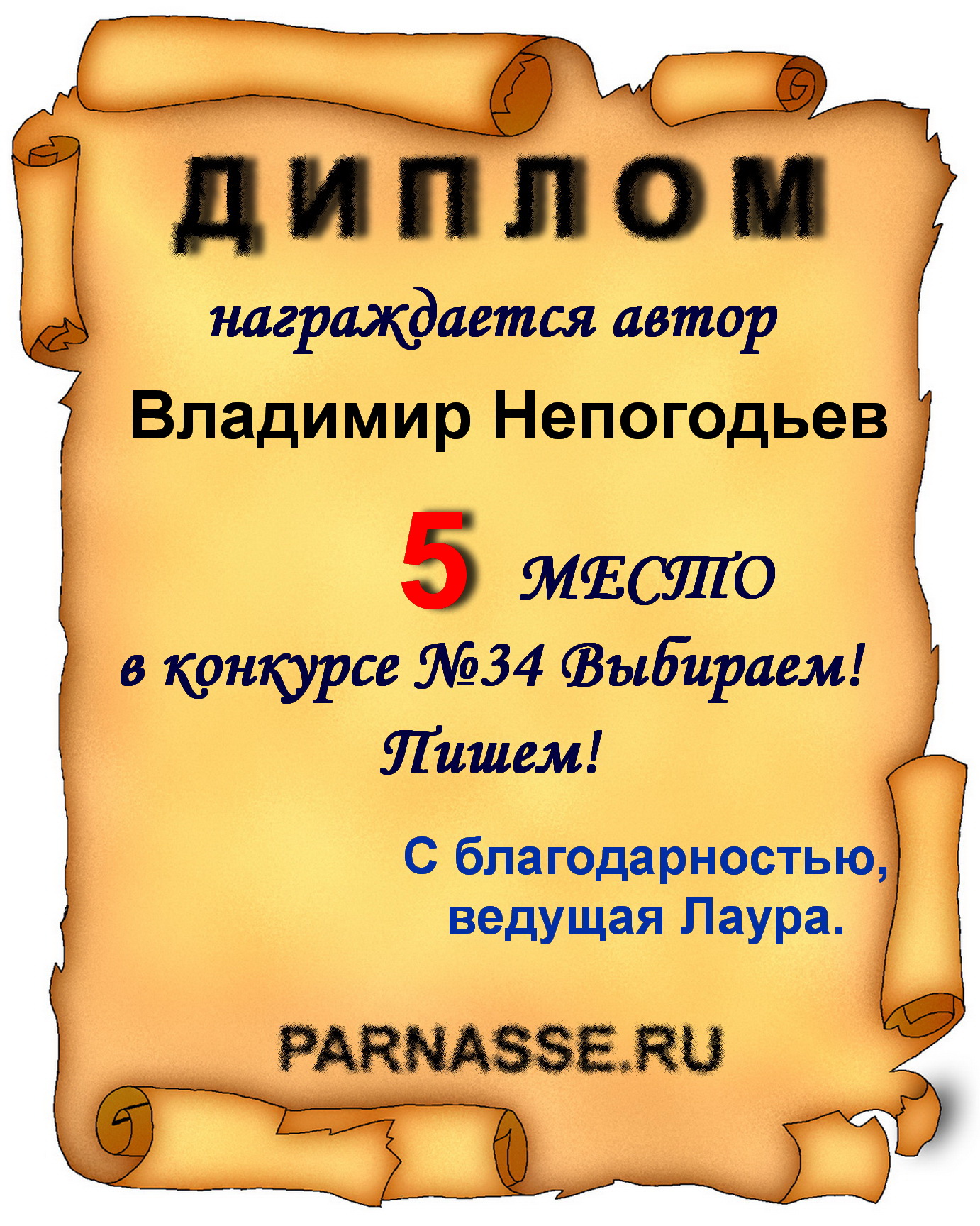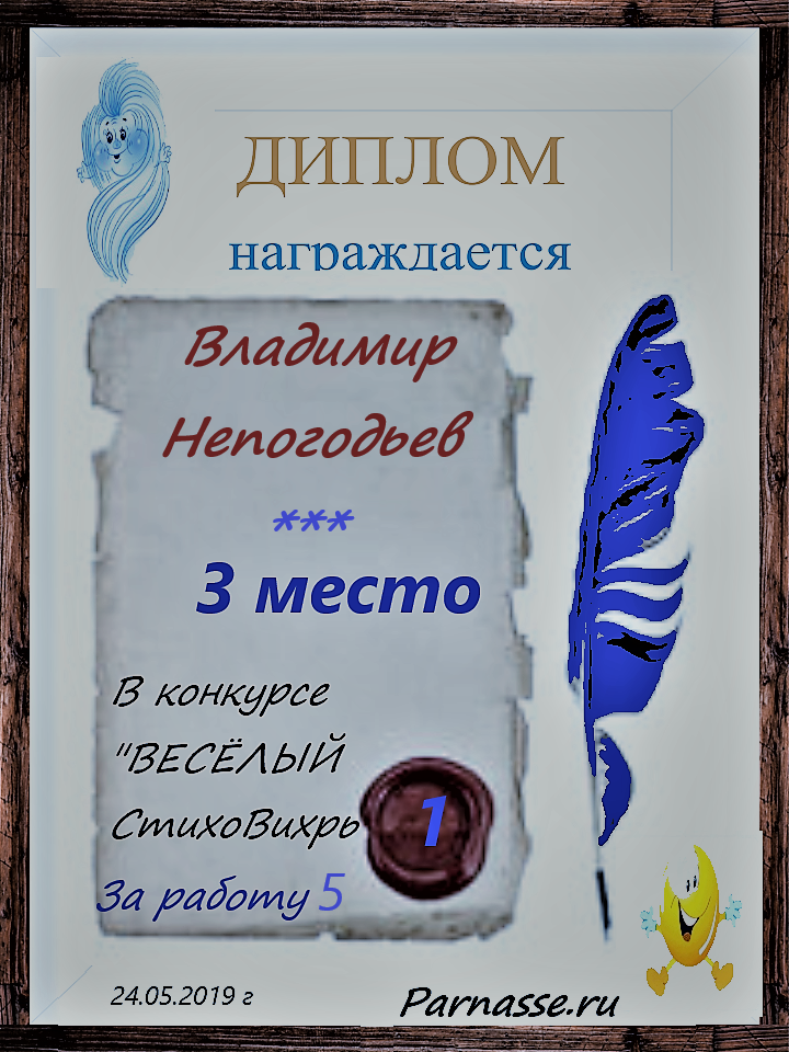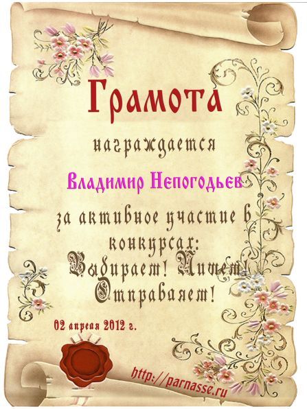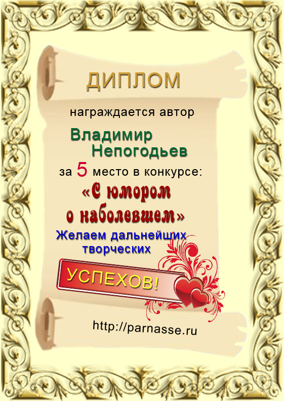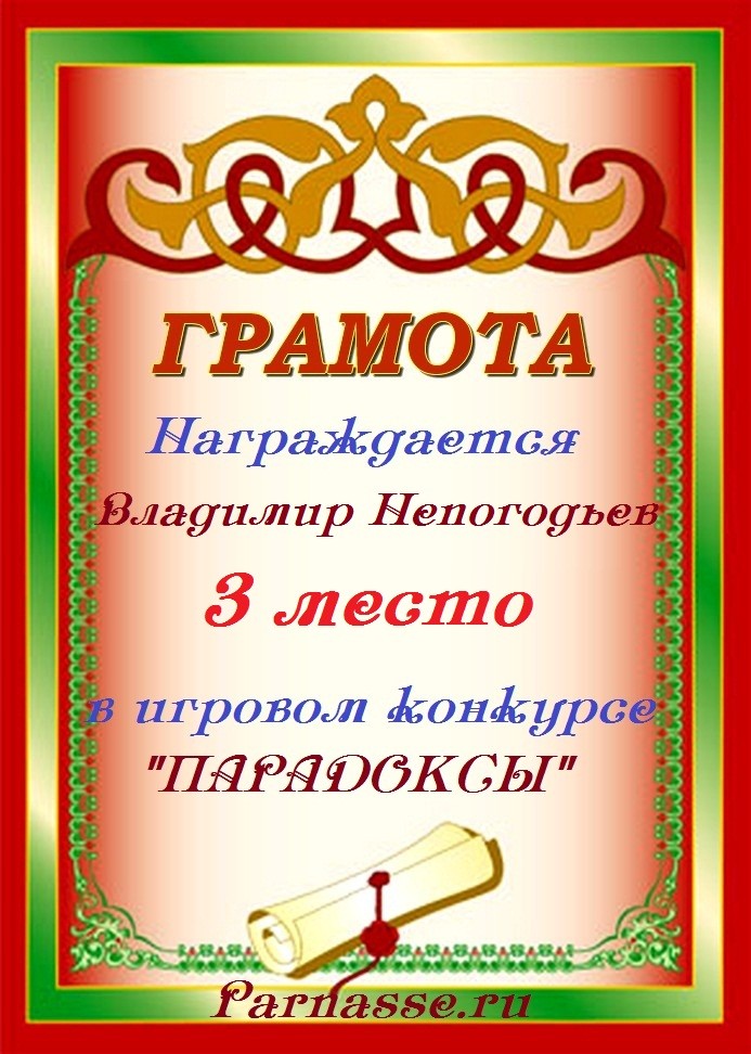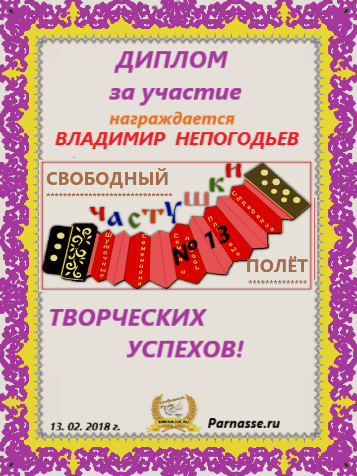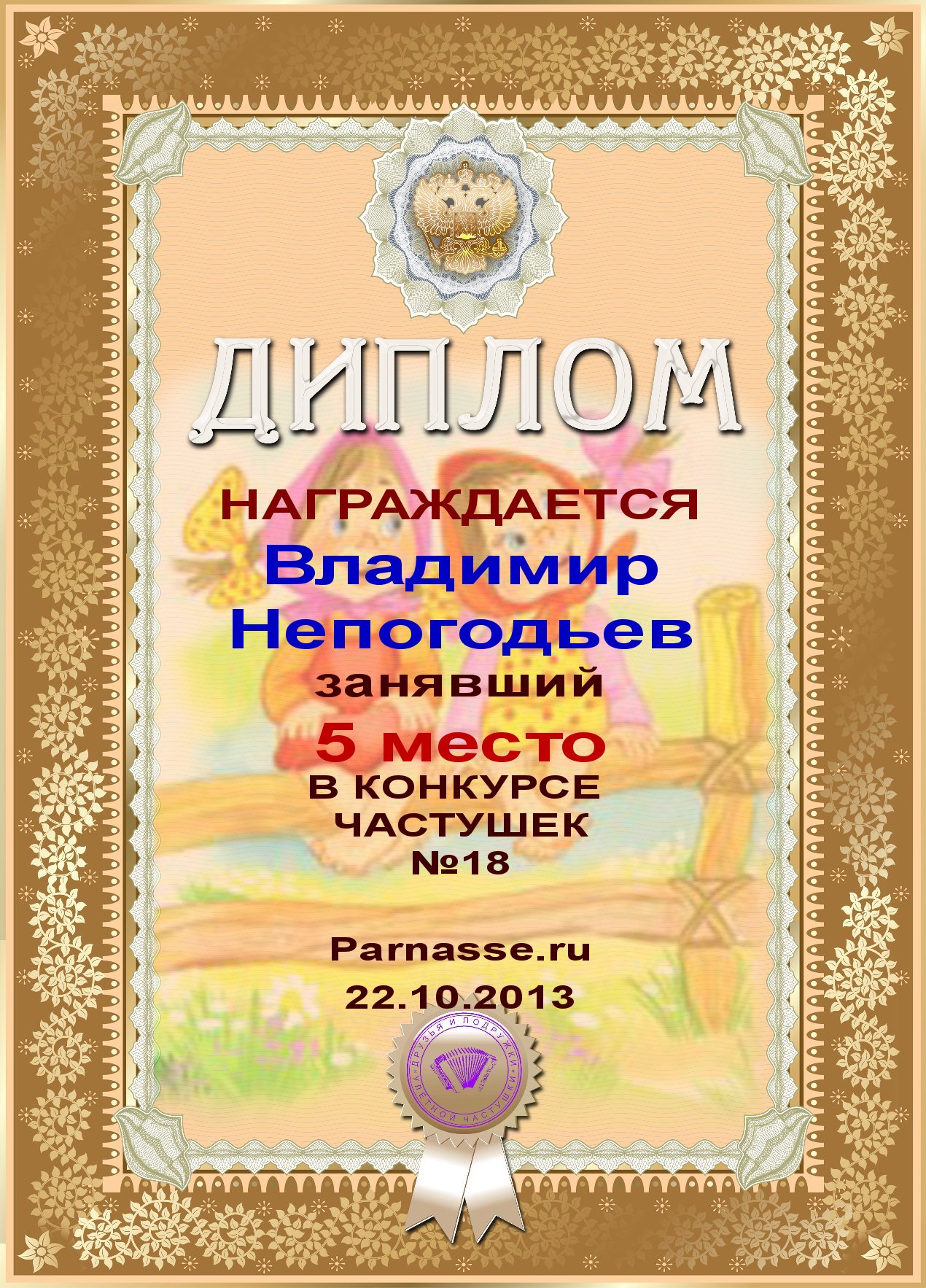 Грамота за 5 место в конкурсе частушек № 8++. Поздравляю, Владимир!