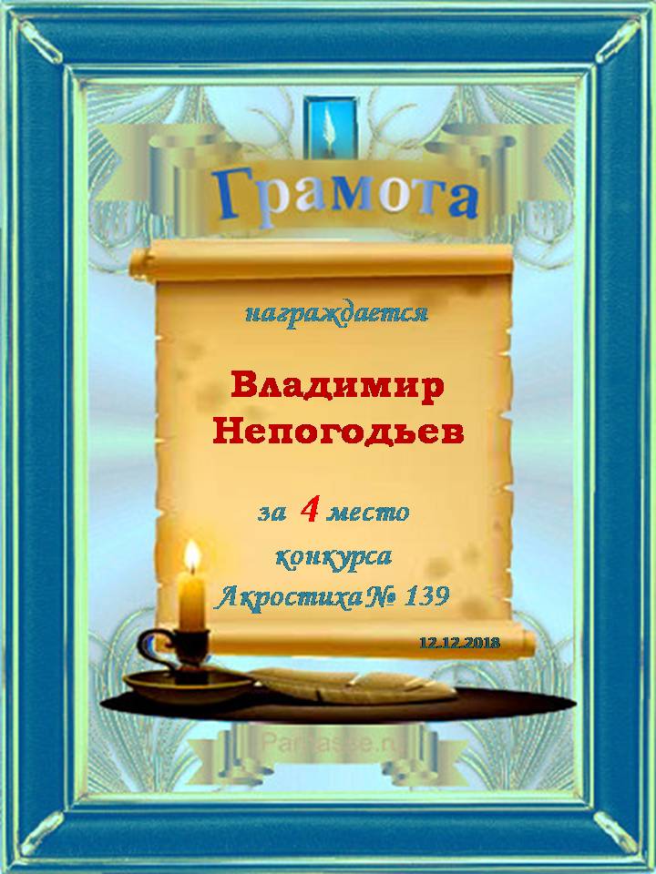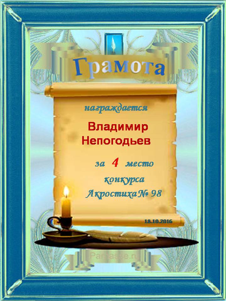 Грамота за 4 место в 117 конкурсе АКРОСТИХА (Альтернатива)! ПОЗДРАВЛЯЮ!