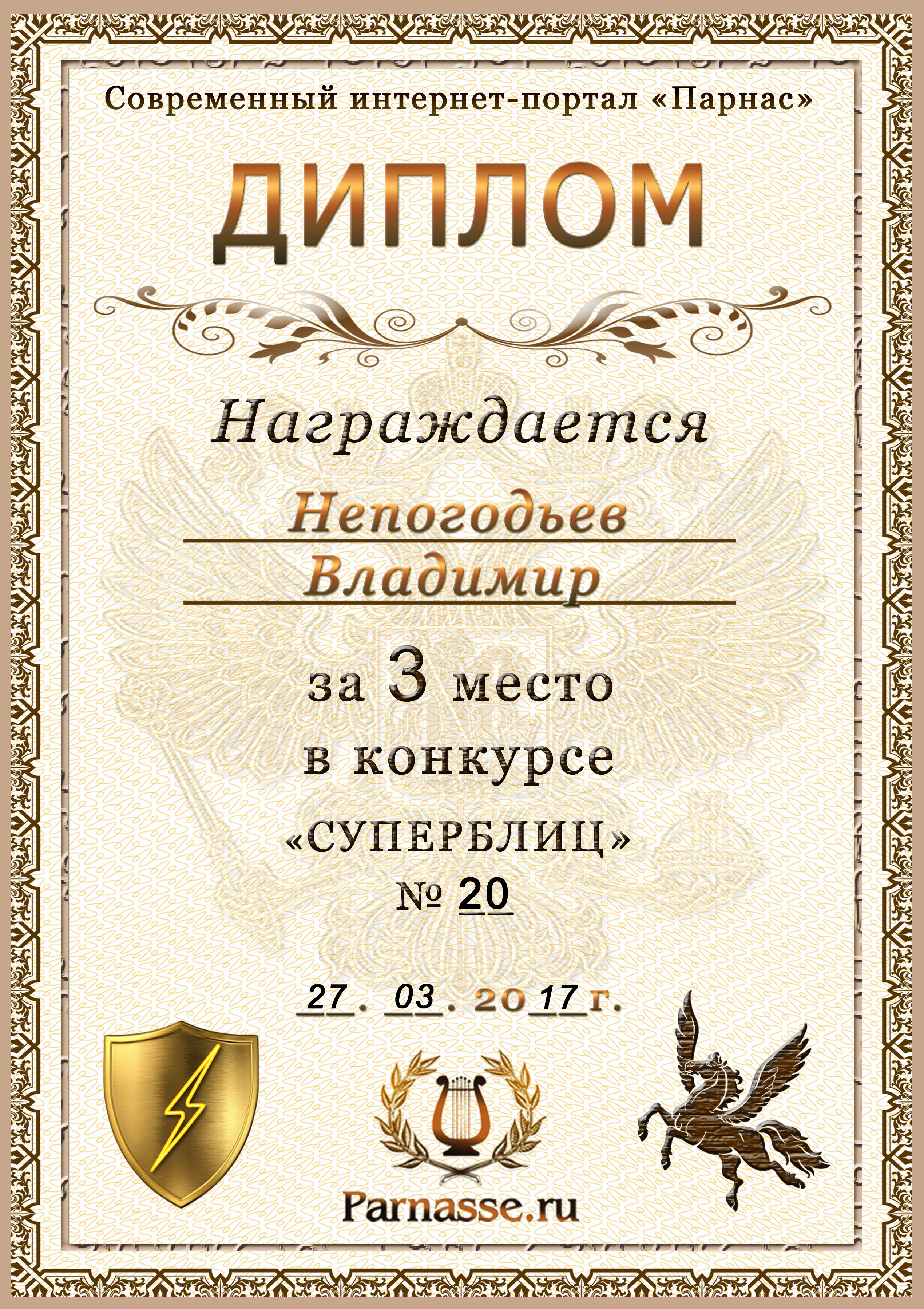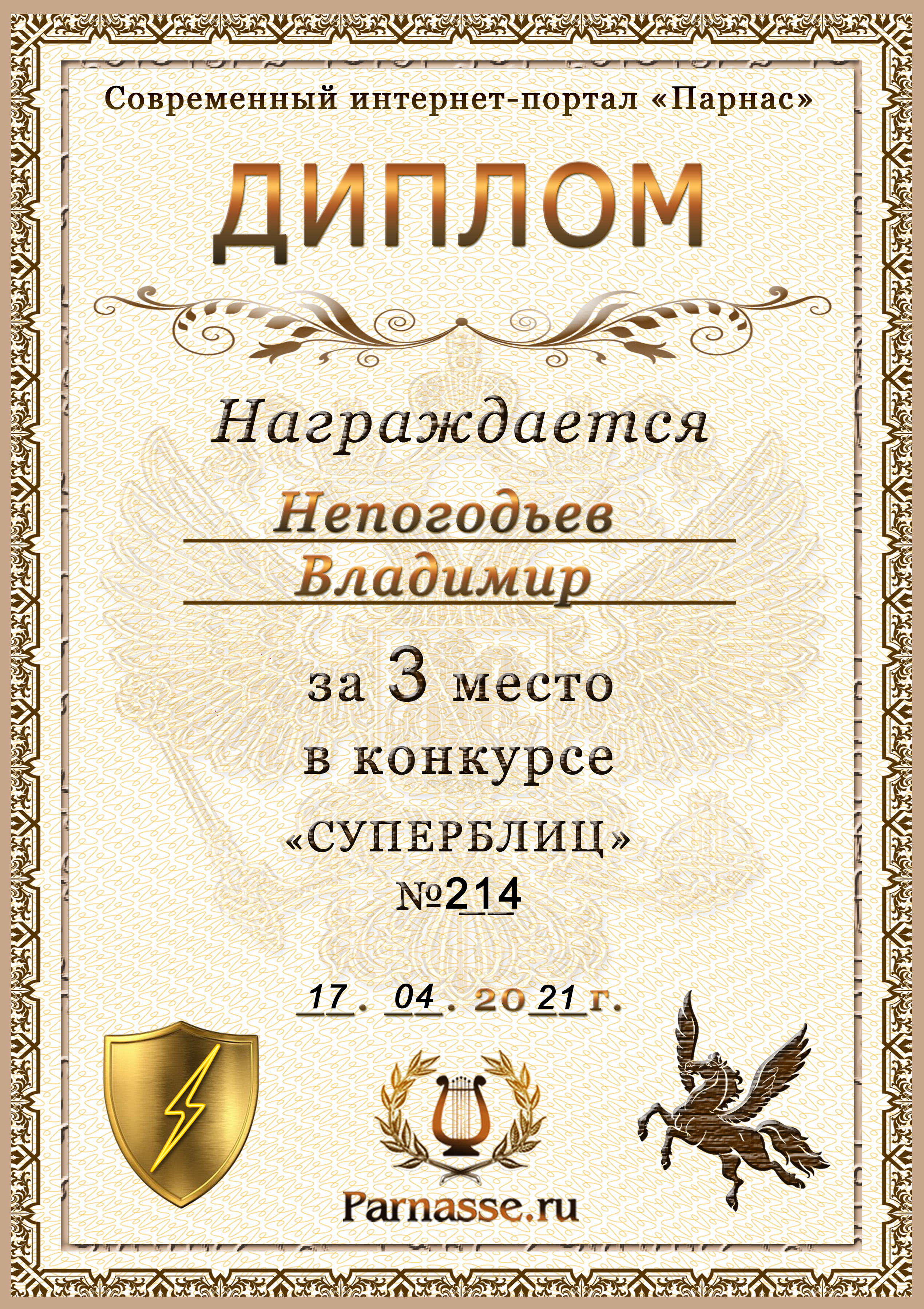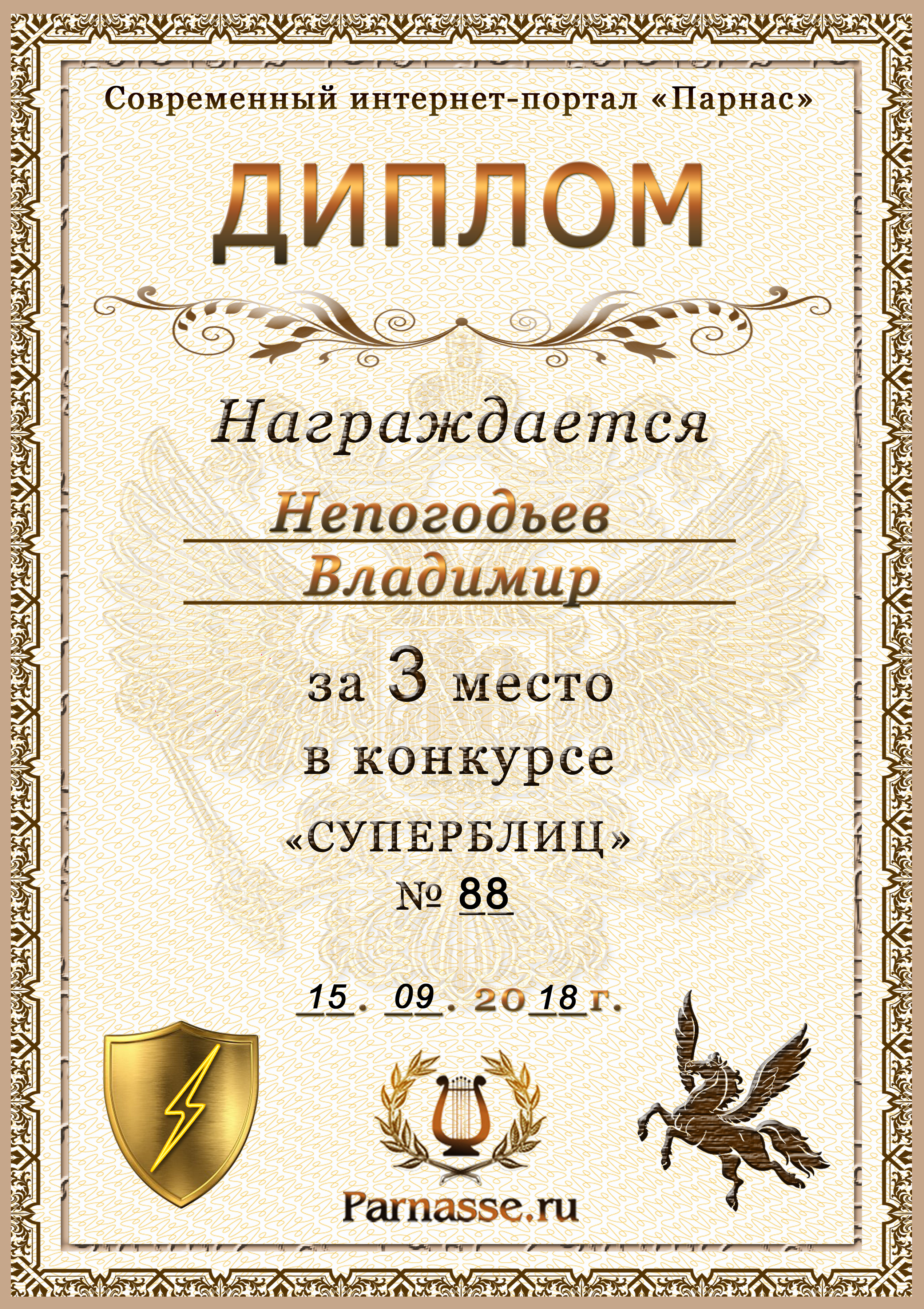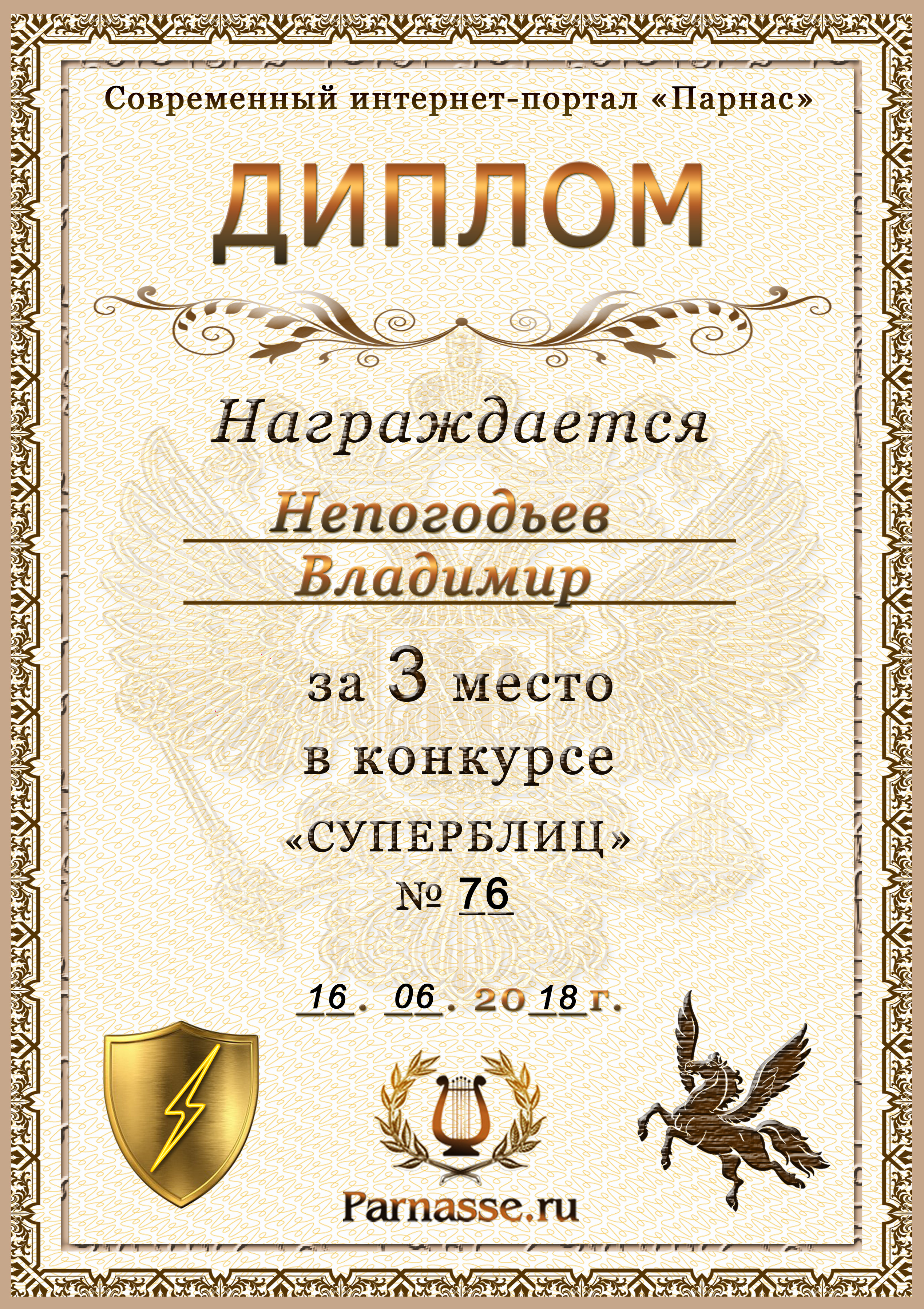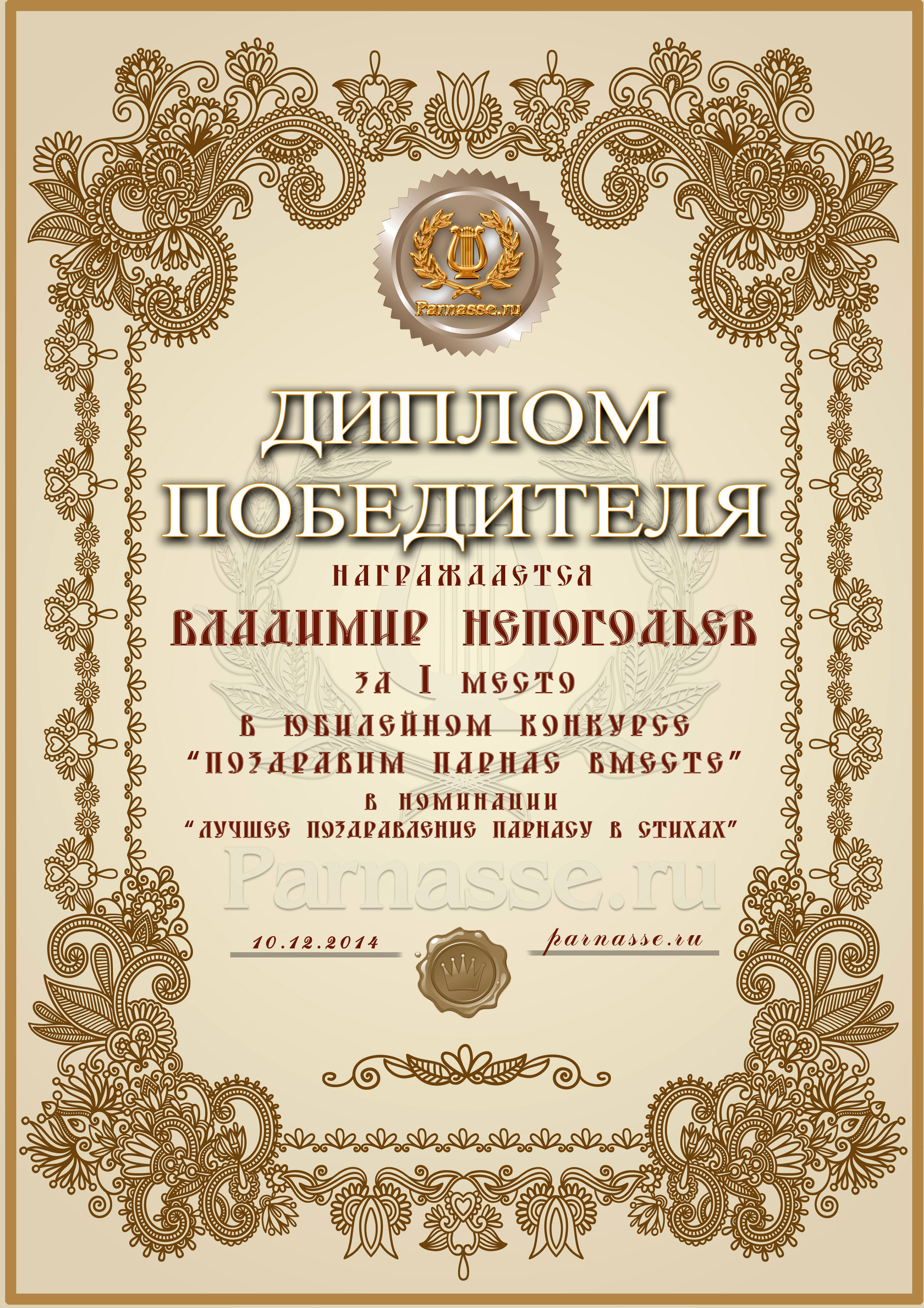 Диплом Победителя за 1 место в праздничном конкурсе "Поздравим Парнас с трёхлетием вместе!"