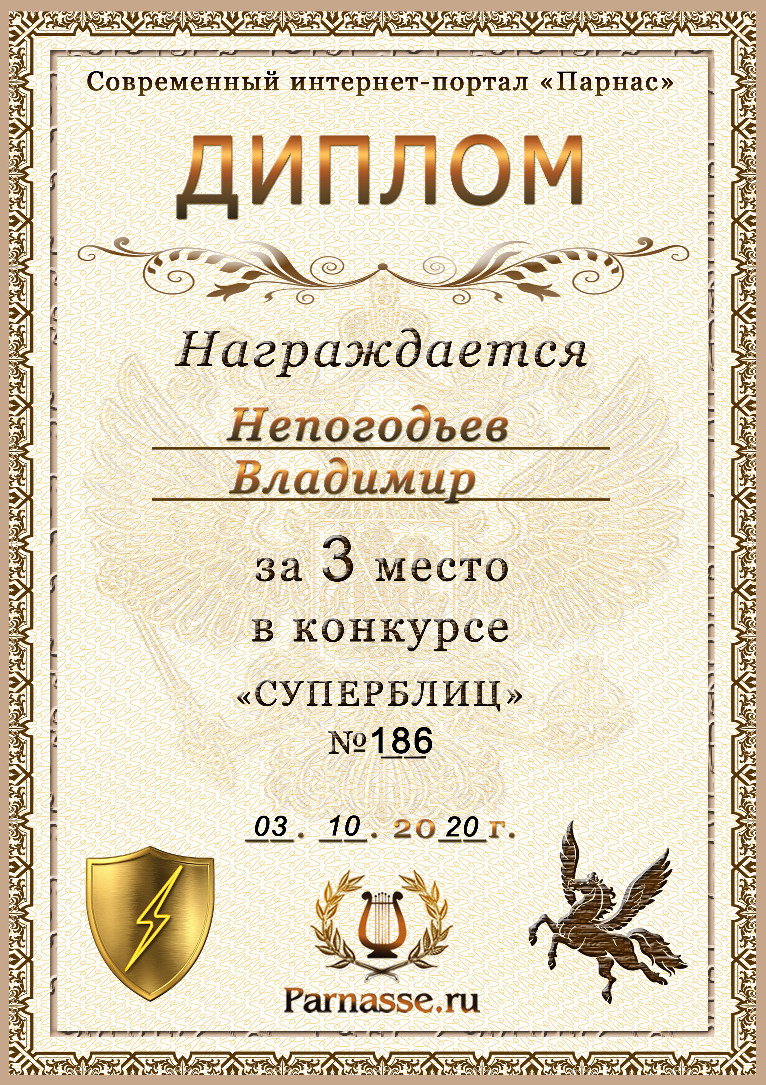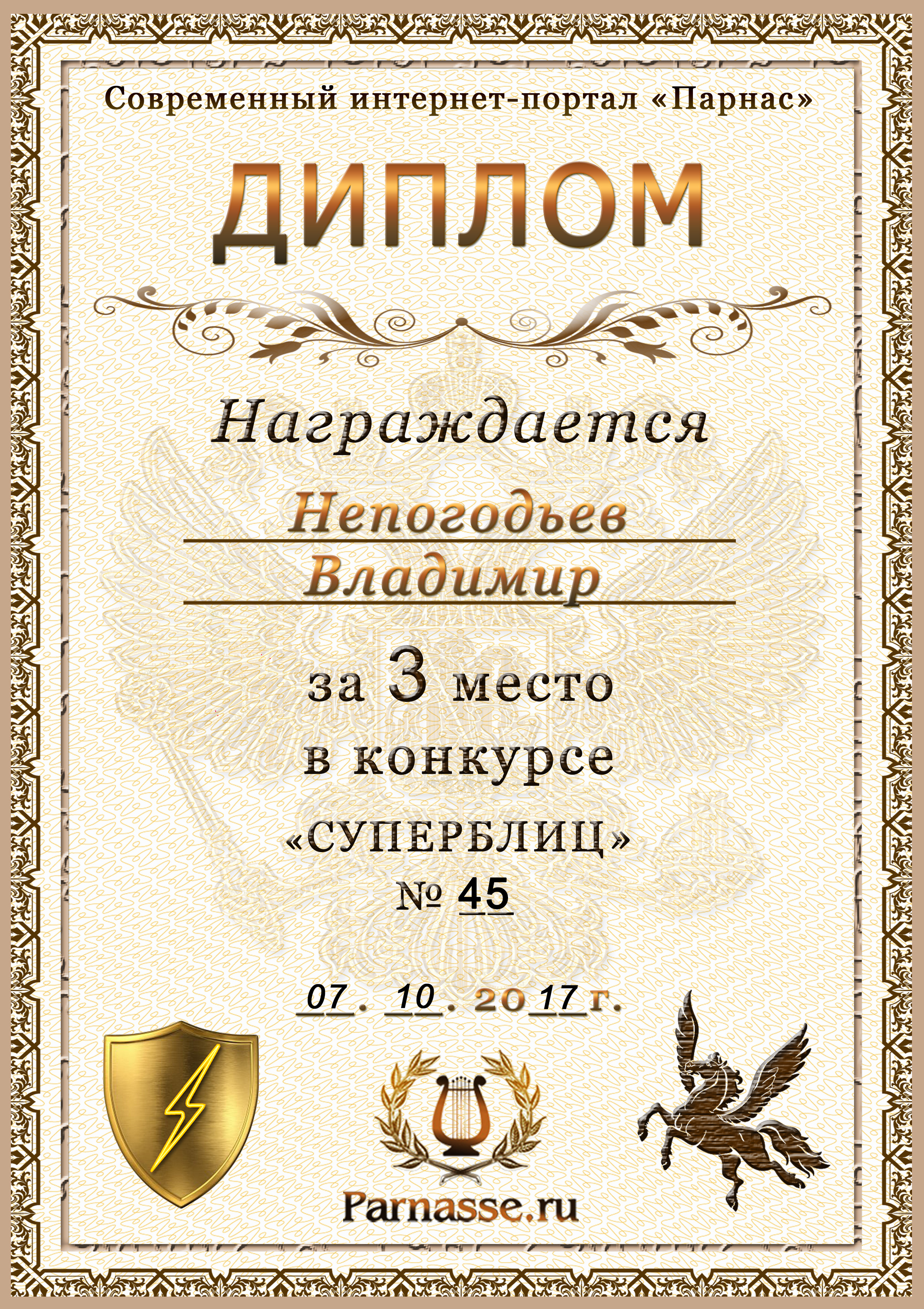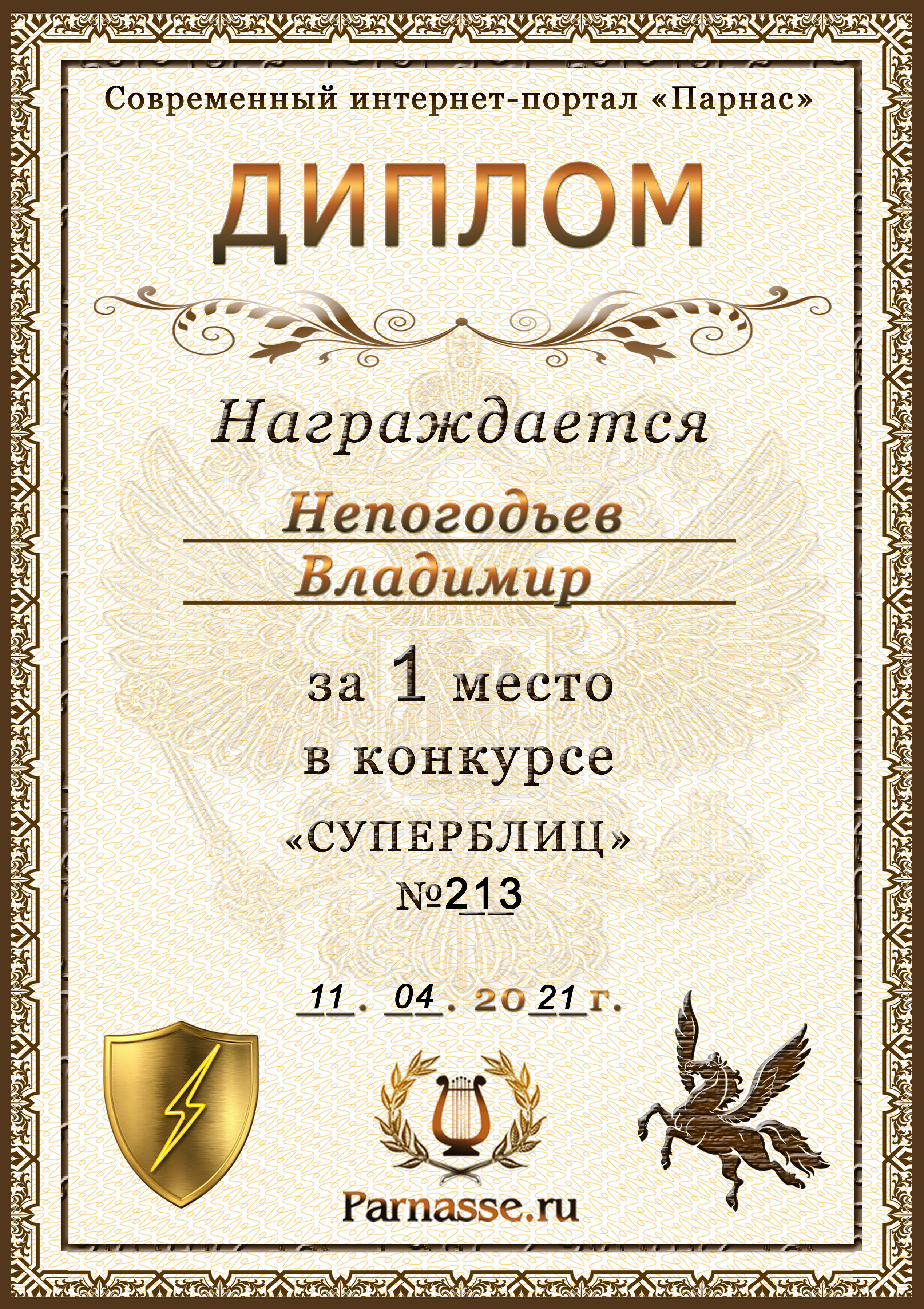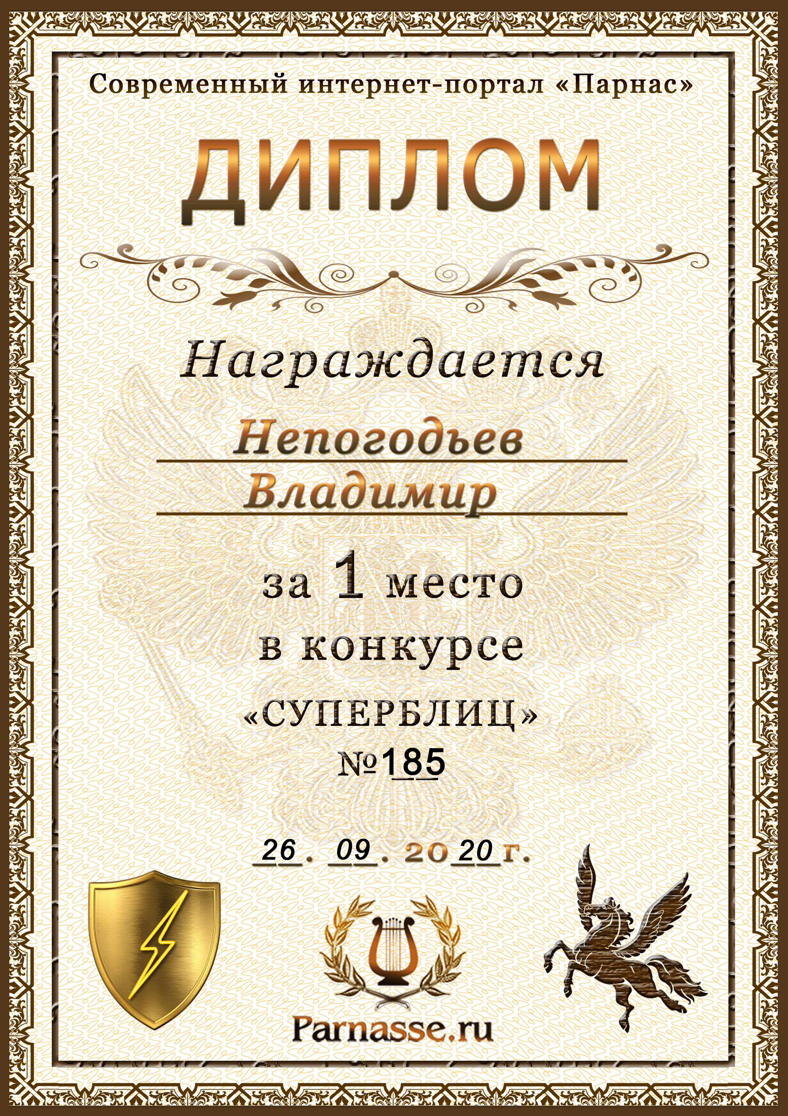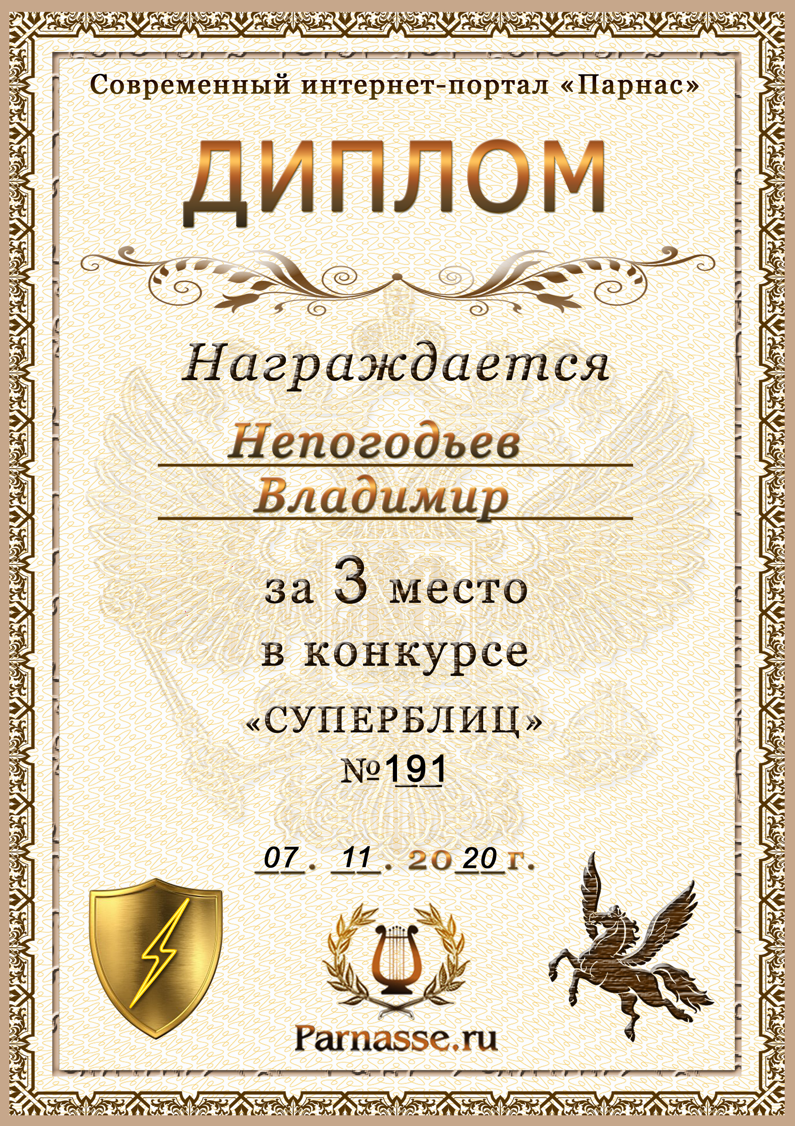 Диплом Победителя за 1 место в праздничном конкурсе "Поздравим Парнас с трёхлетием вместе!"