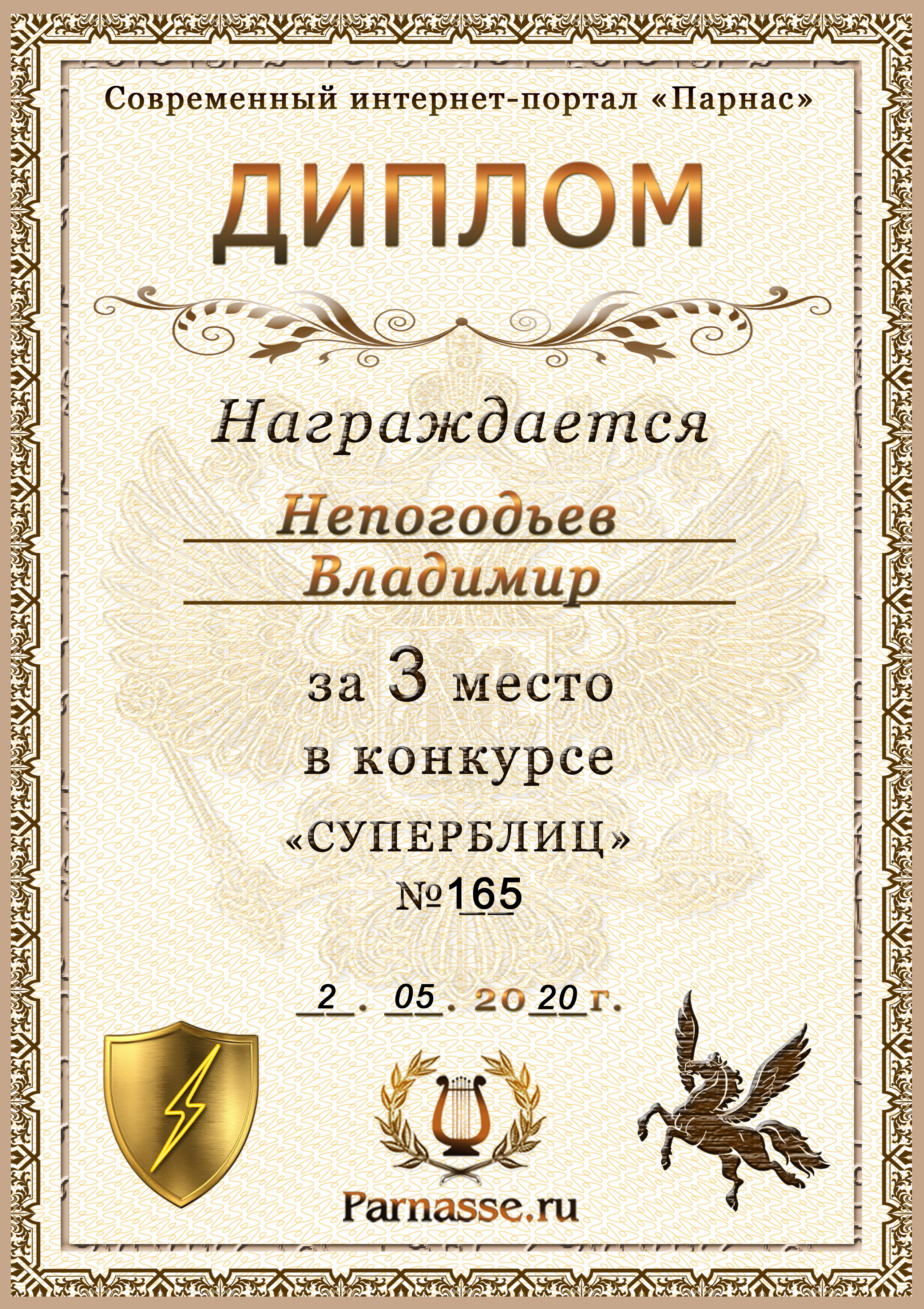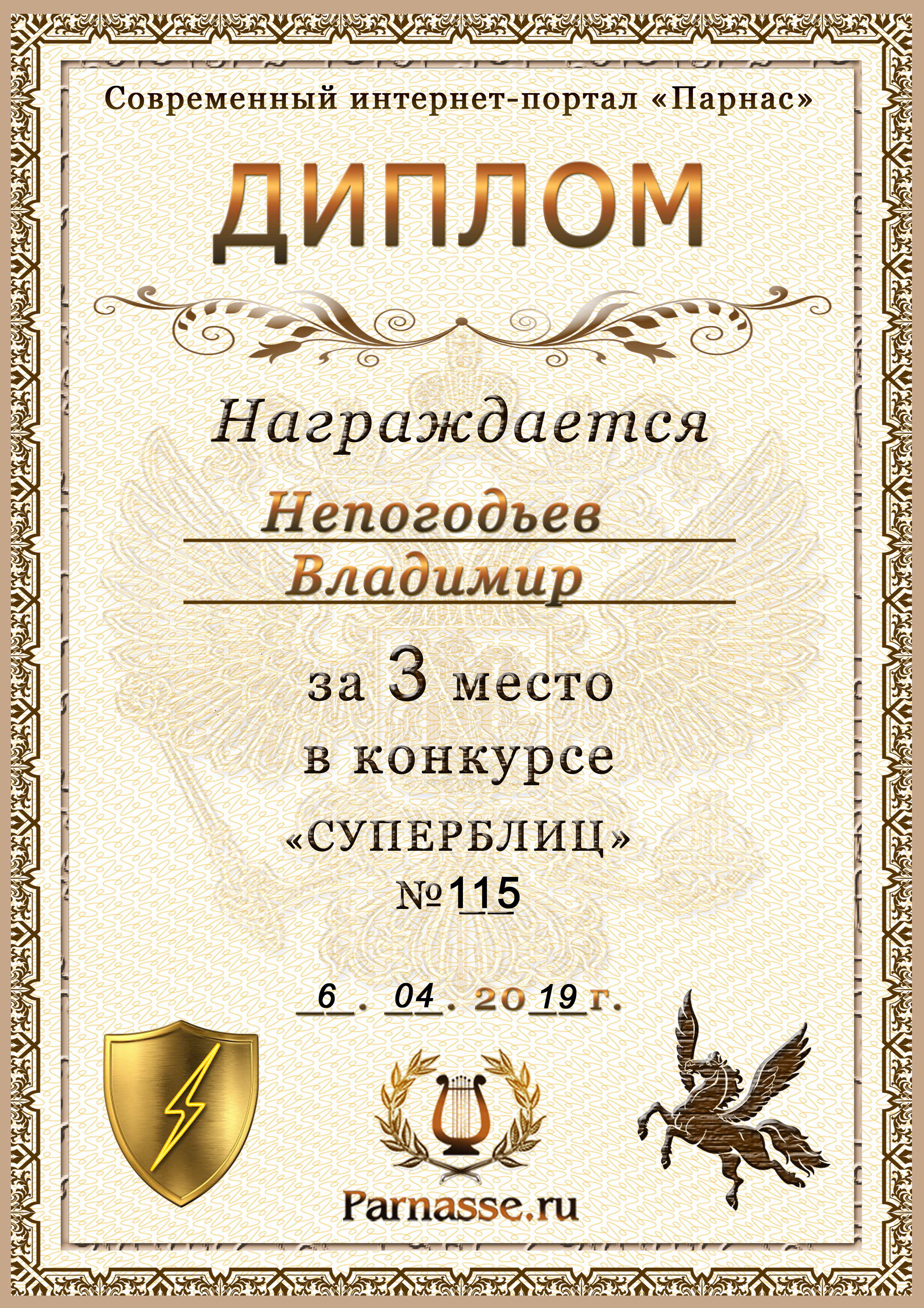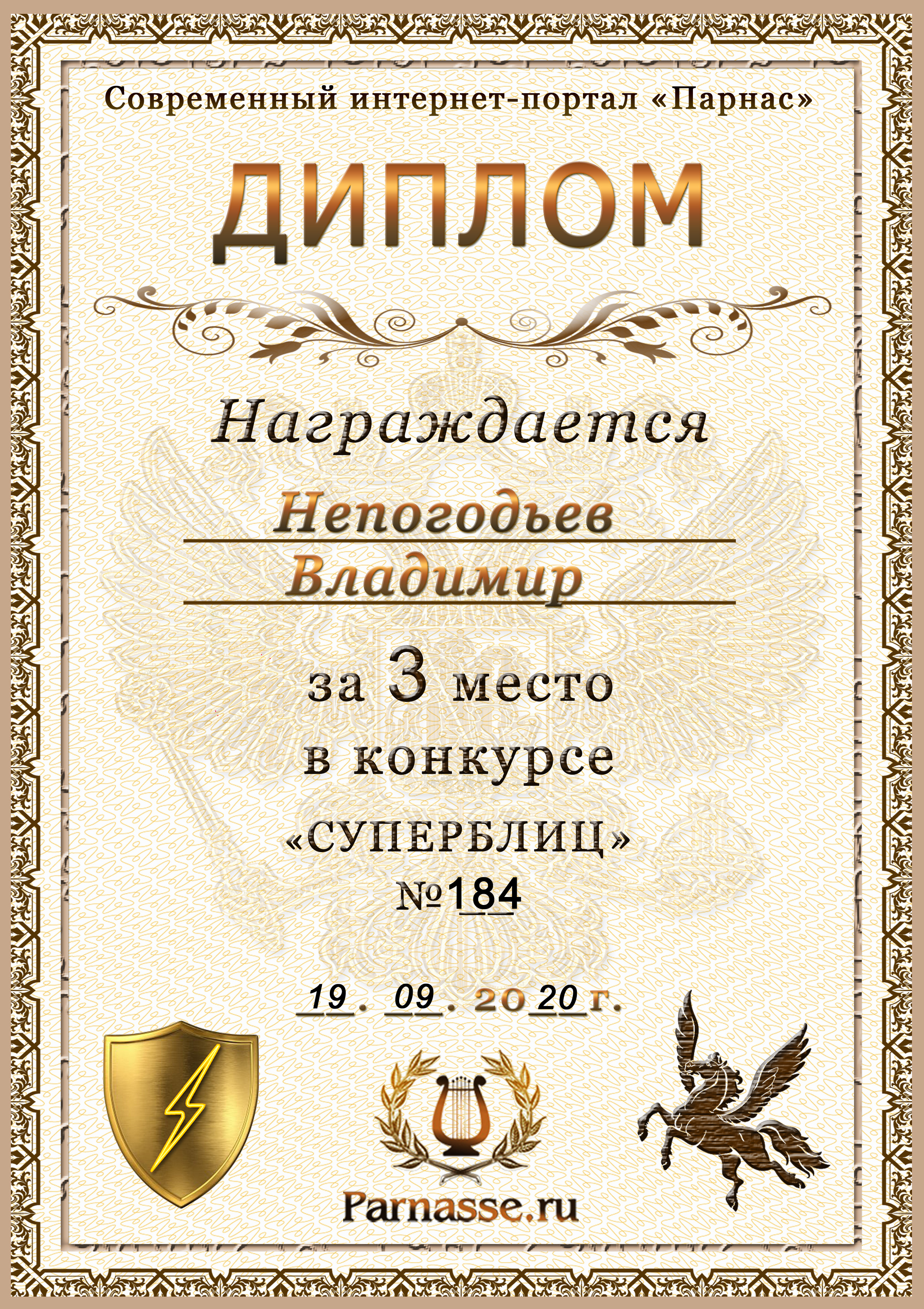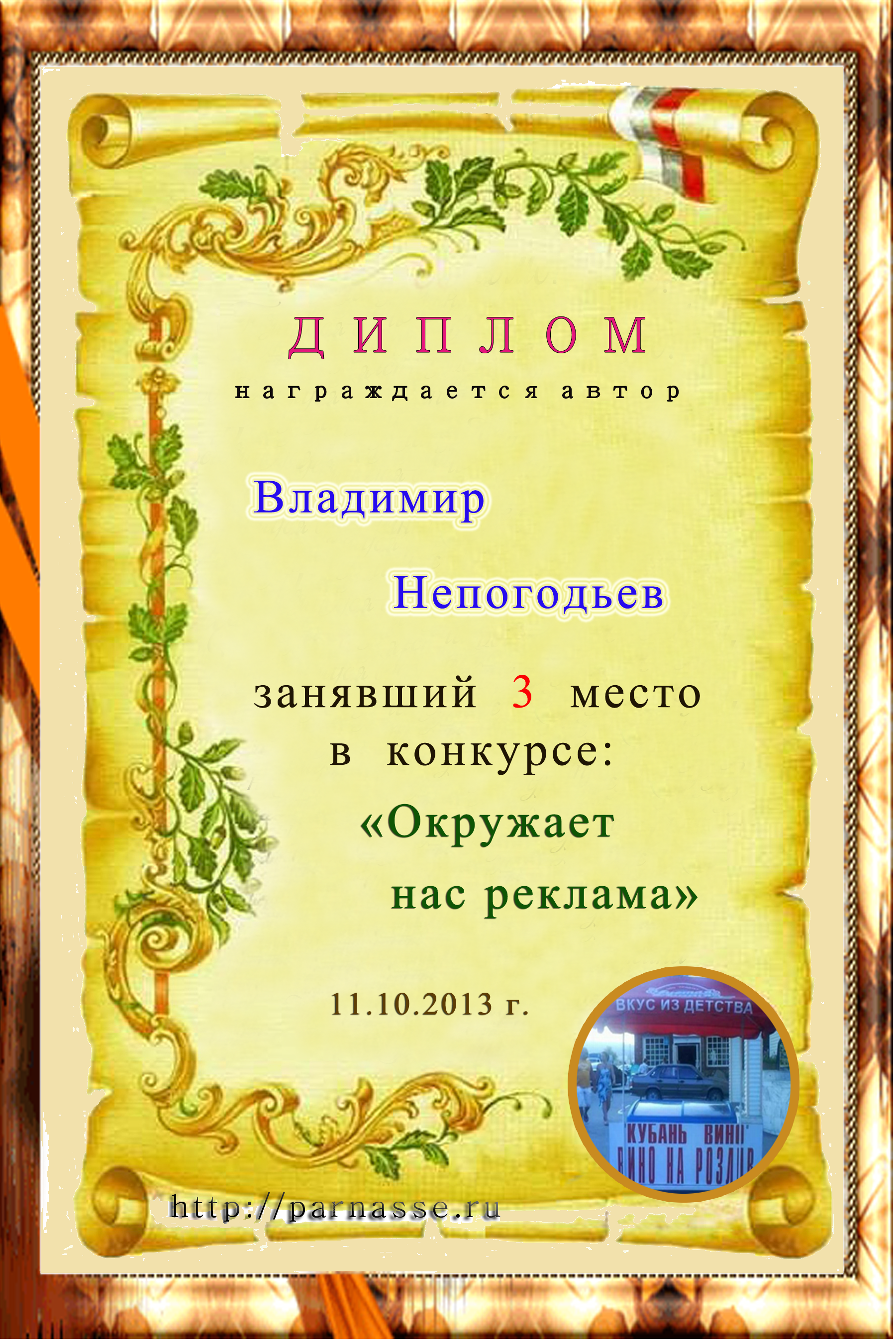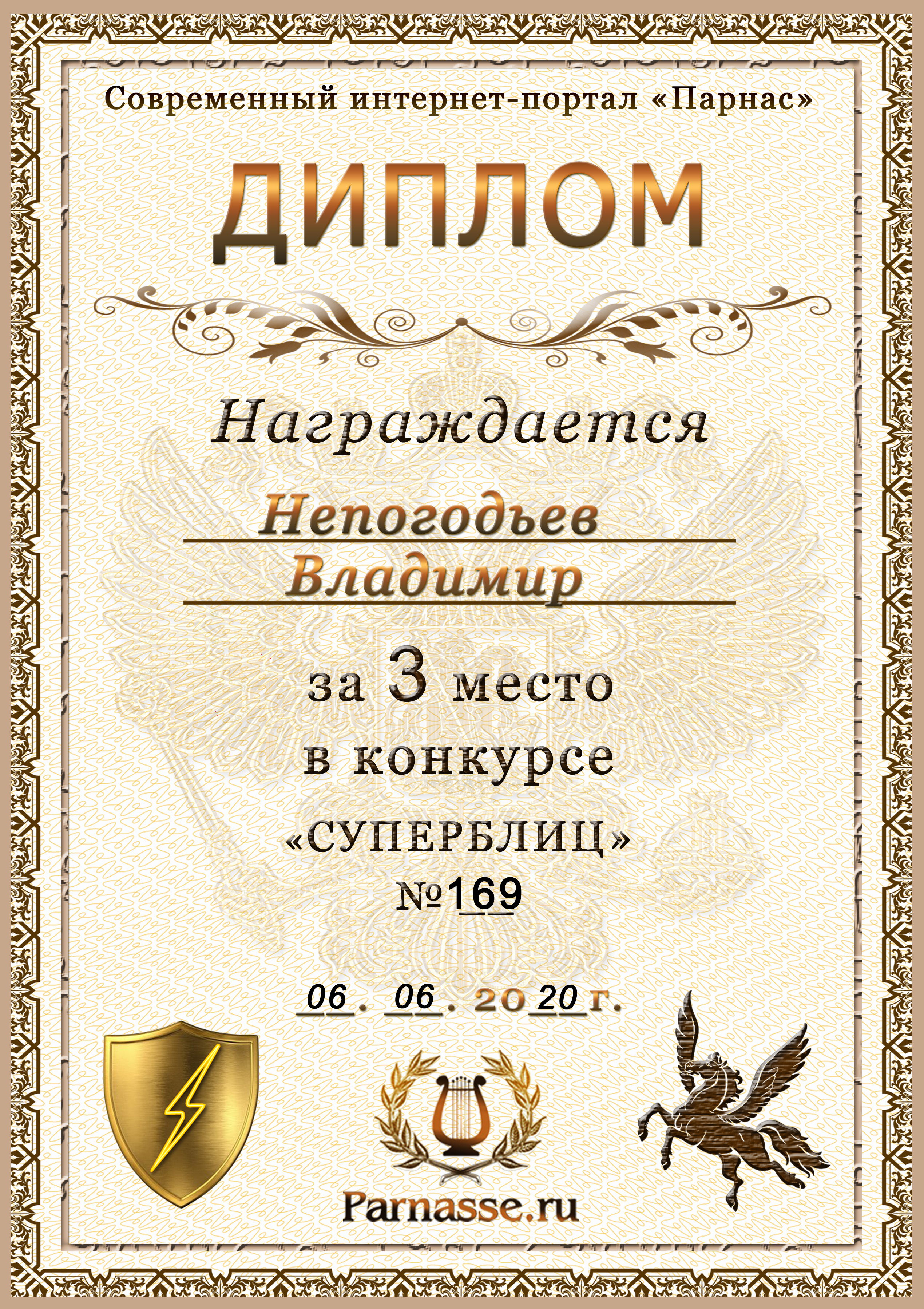 Диплом Победителя за 1 место в праздничном конкурсе "Поздравим Парнас с трёхлетием вместе!"