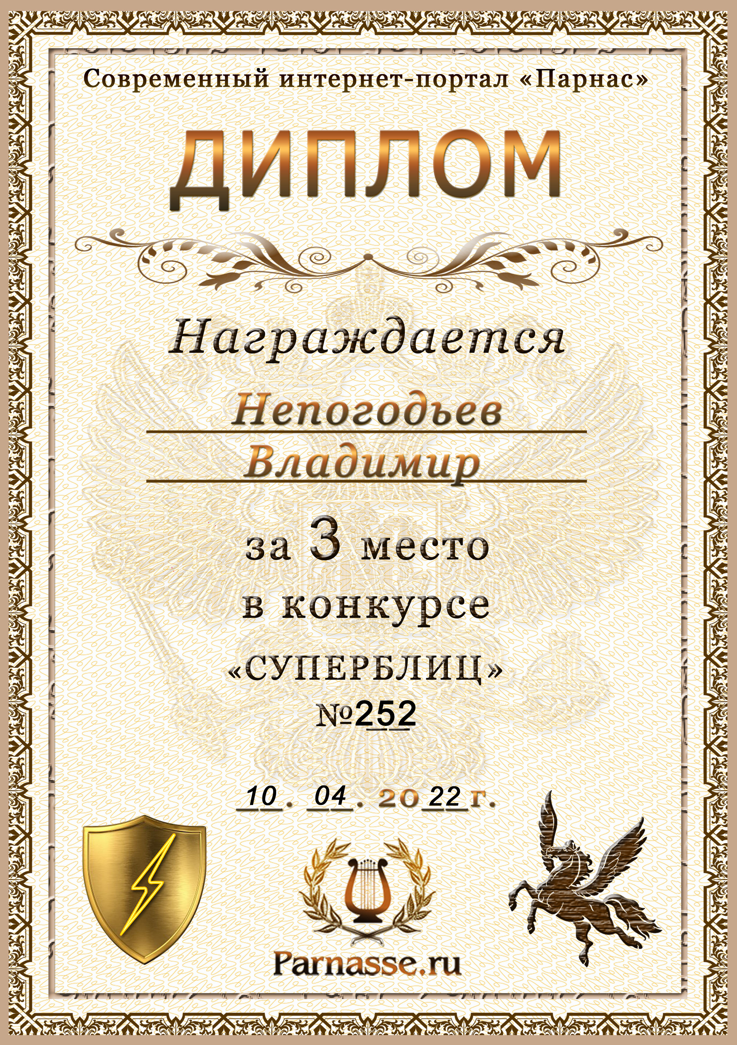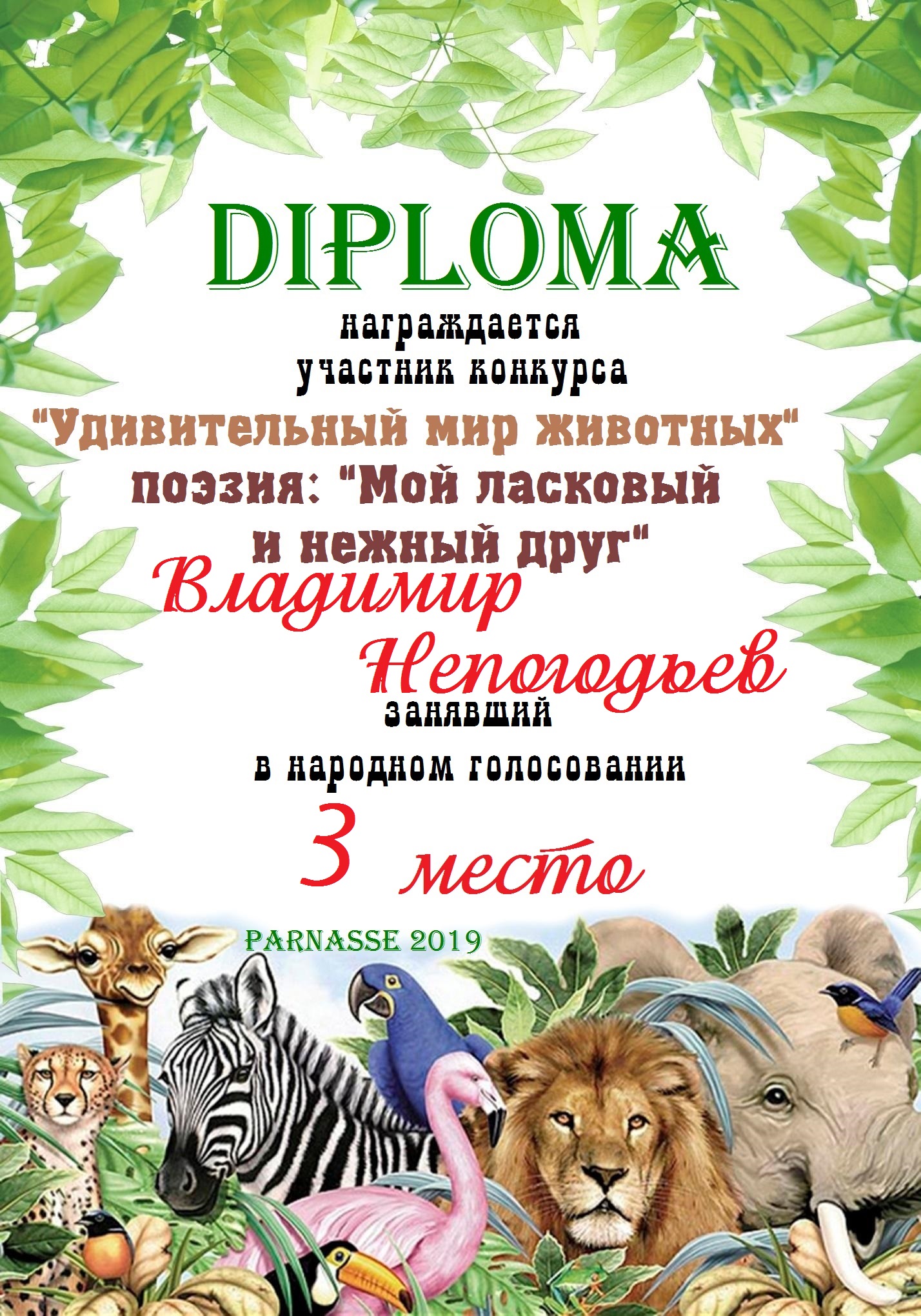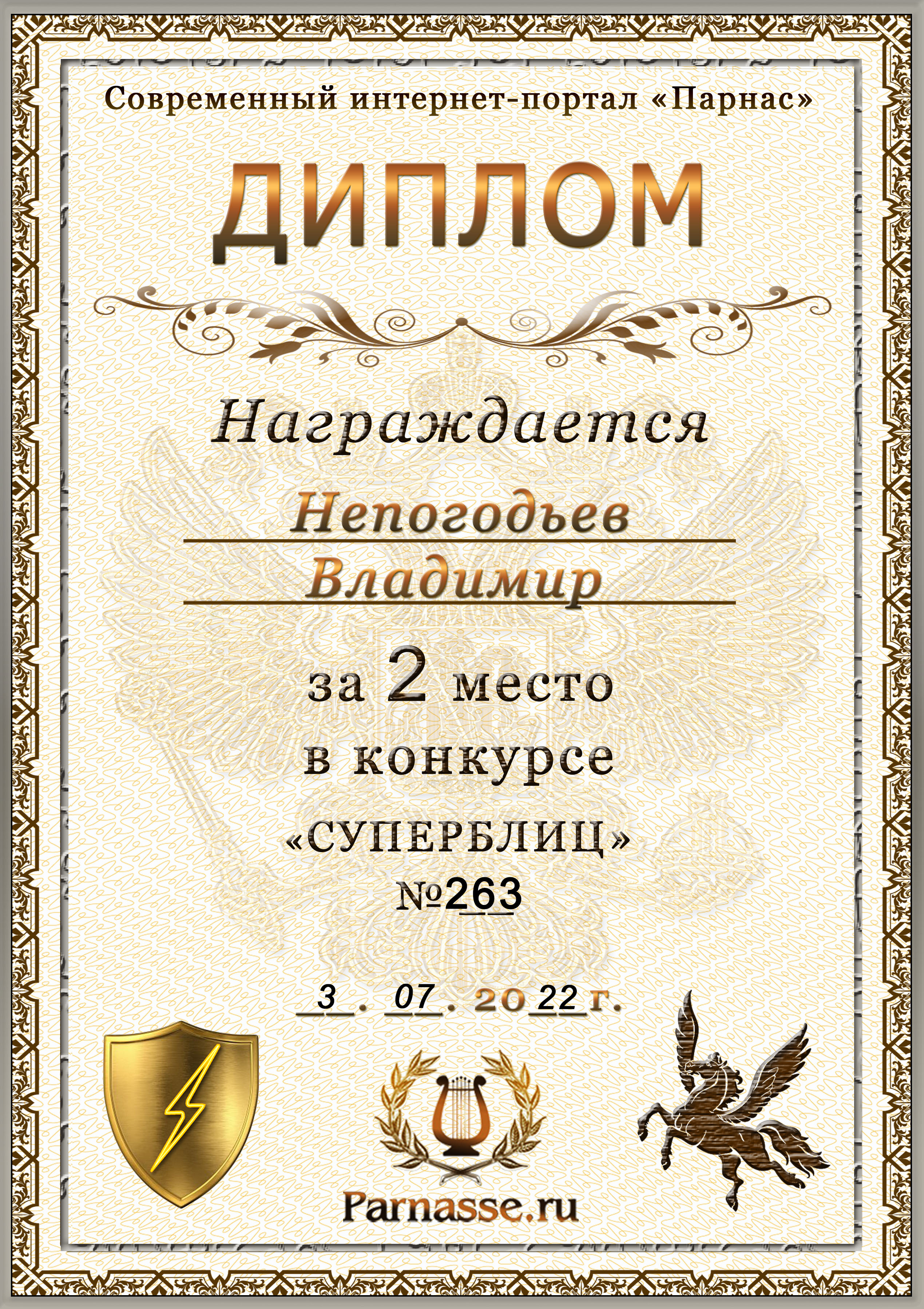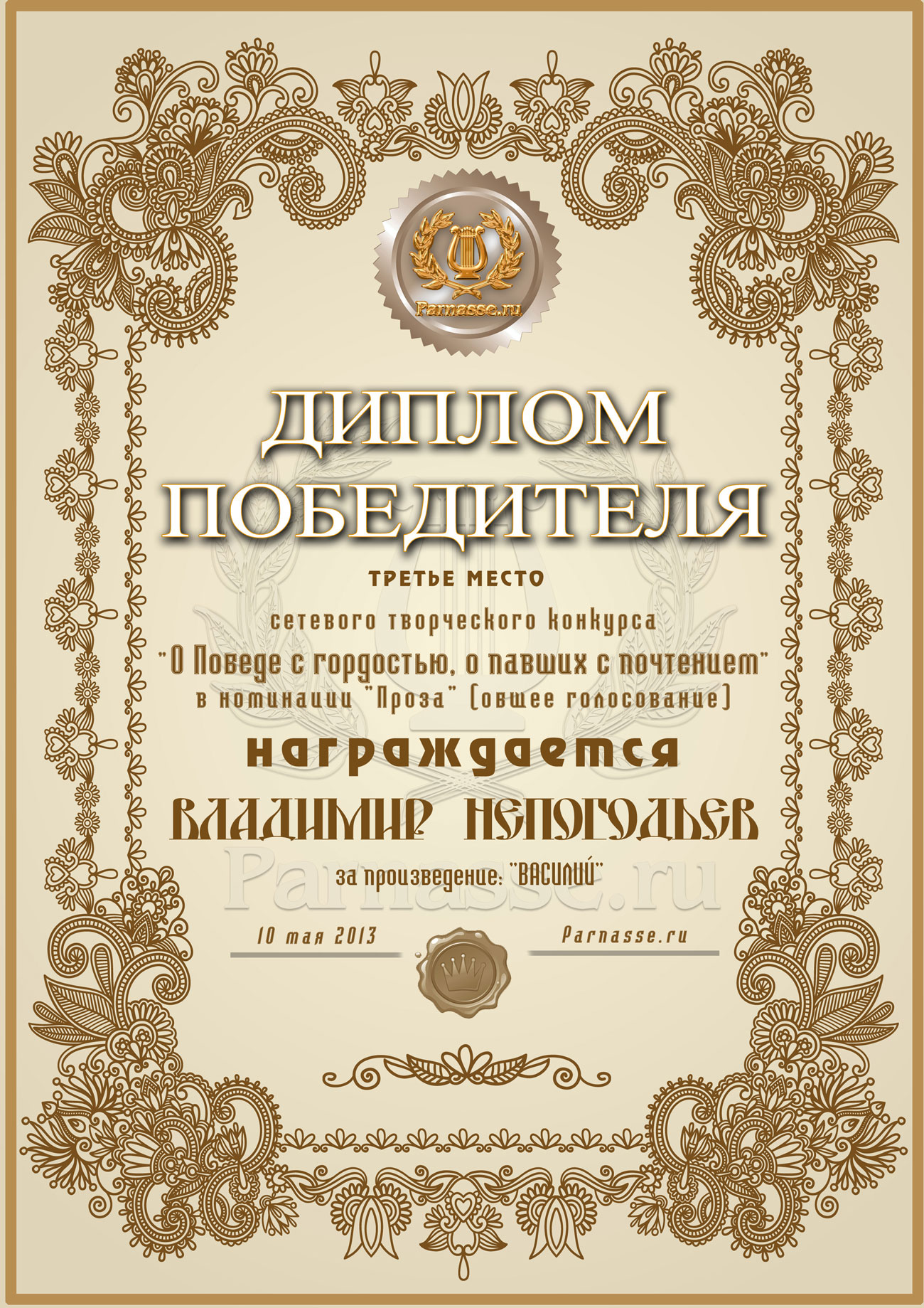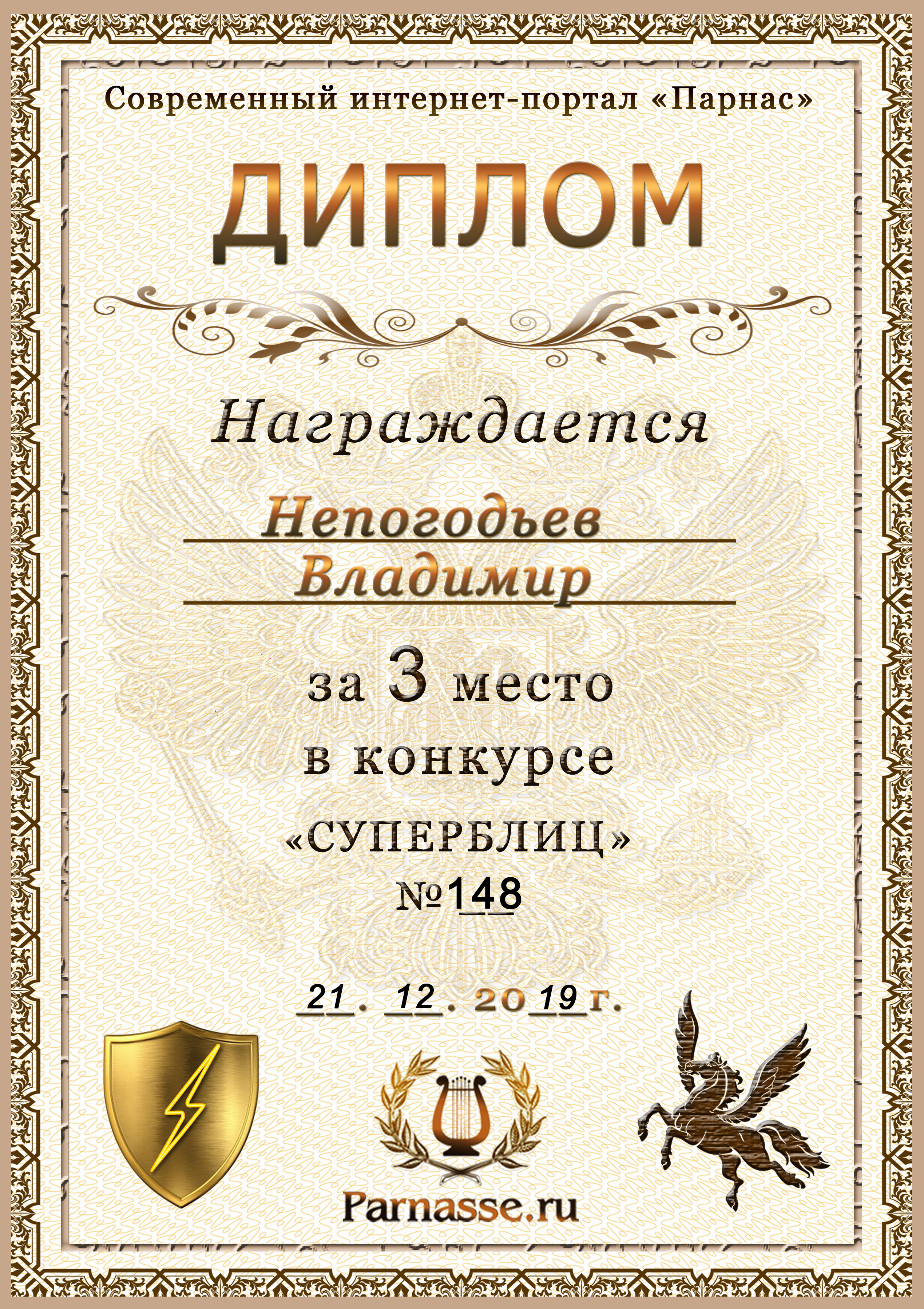 Диплом Победителя за 1 место в праздничном конкурсе "Поздравим Парнас с трёхлетием вместе!"