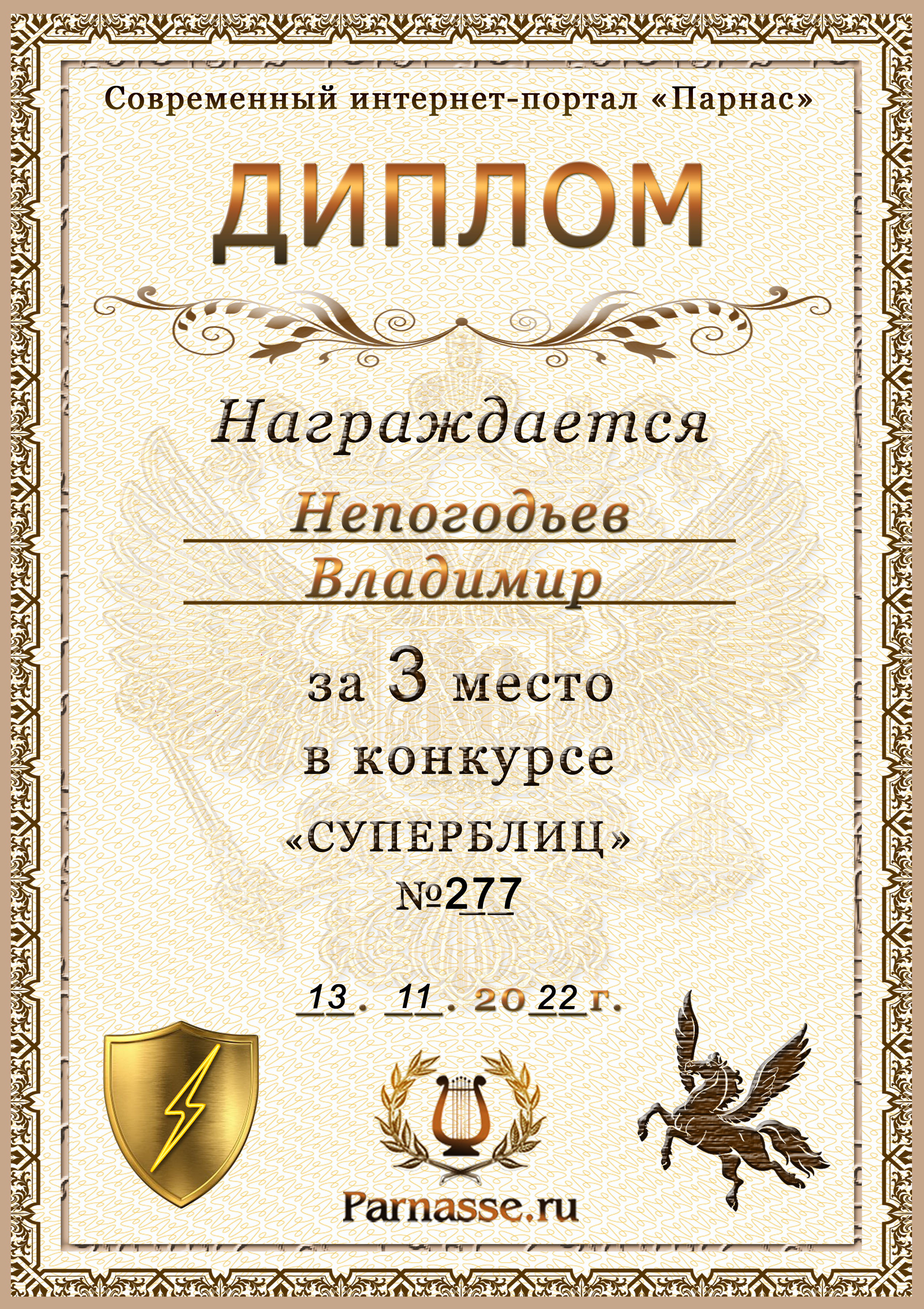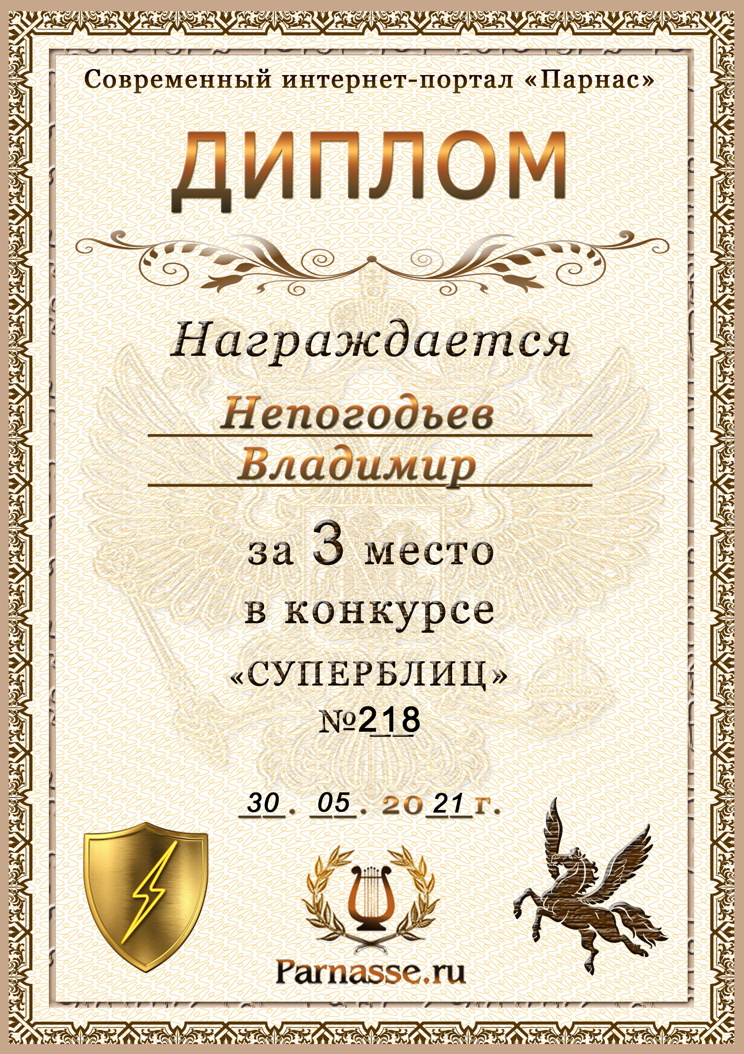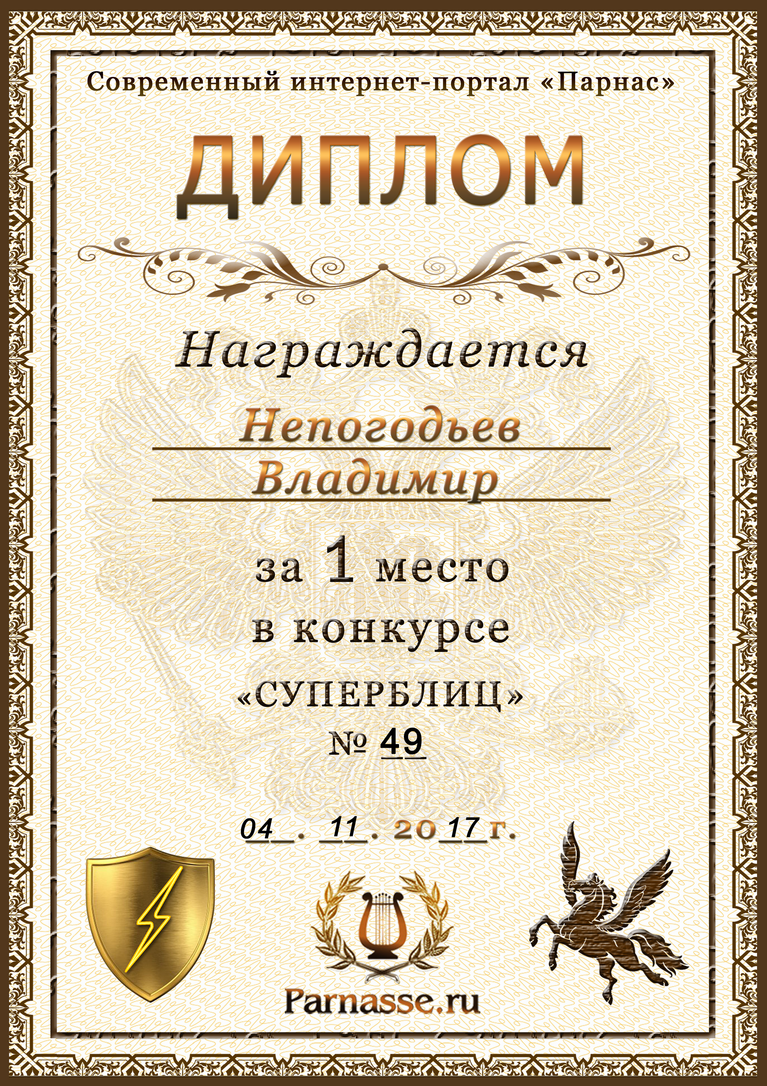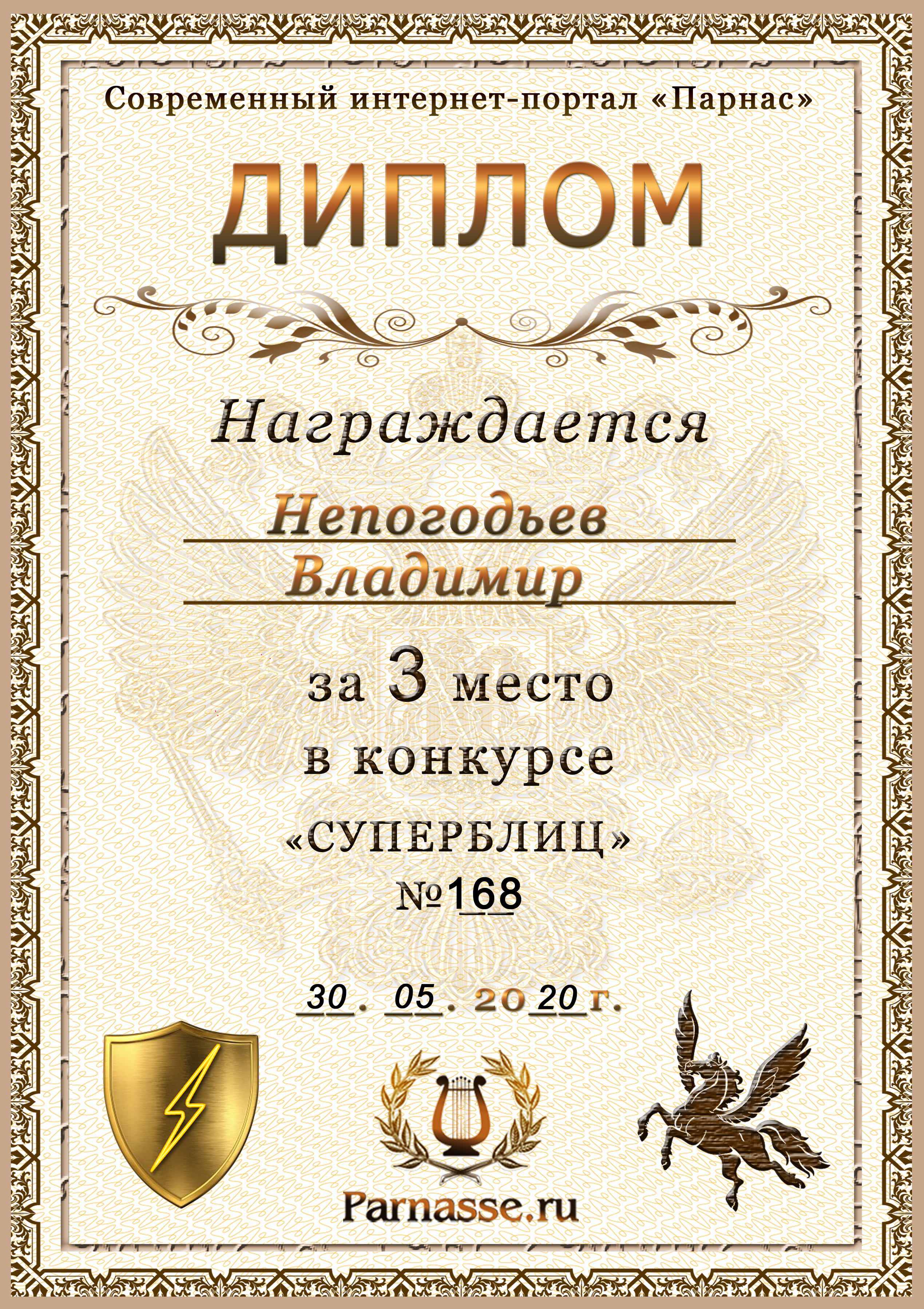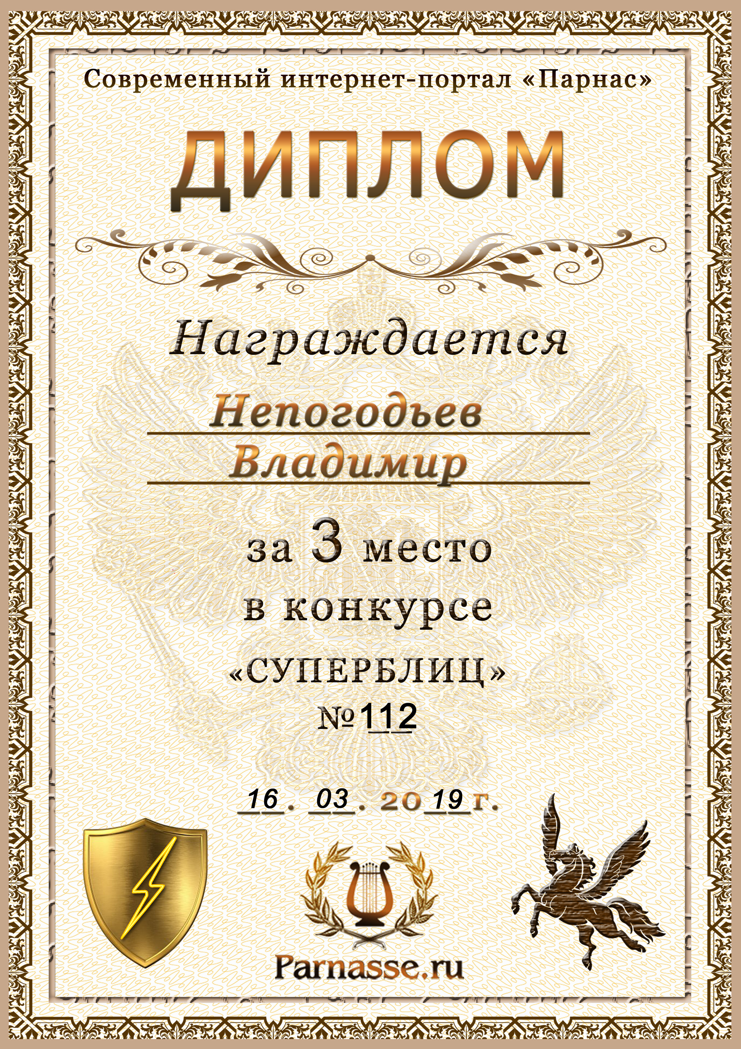Диплом Победителя за 1 место в праздничном конкурсе "Поздравим Парнас с трёхлетием вместе!"