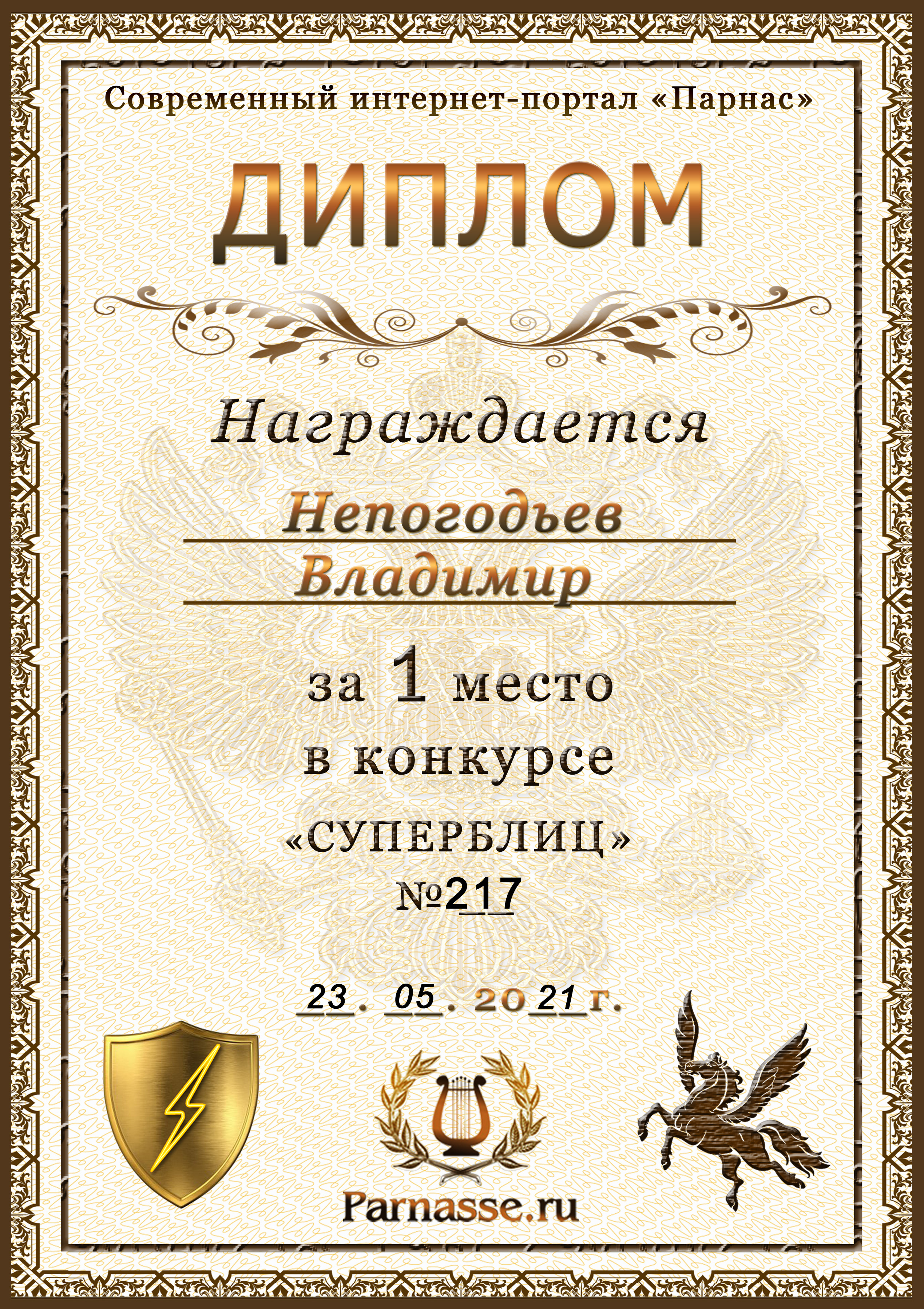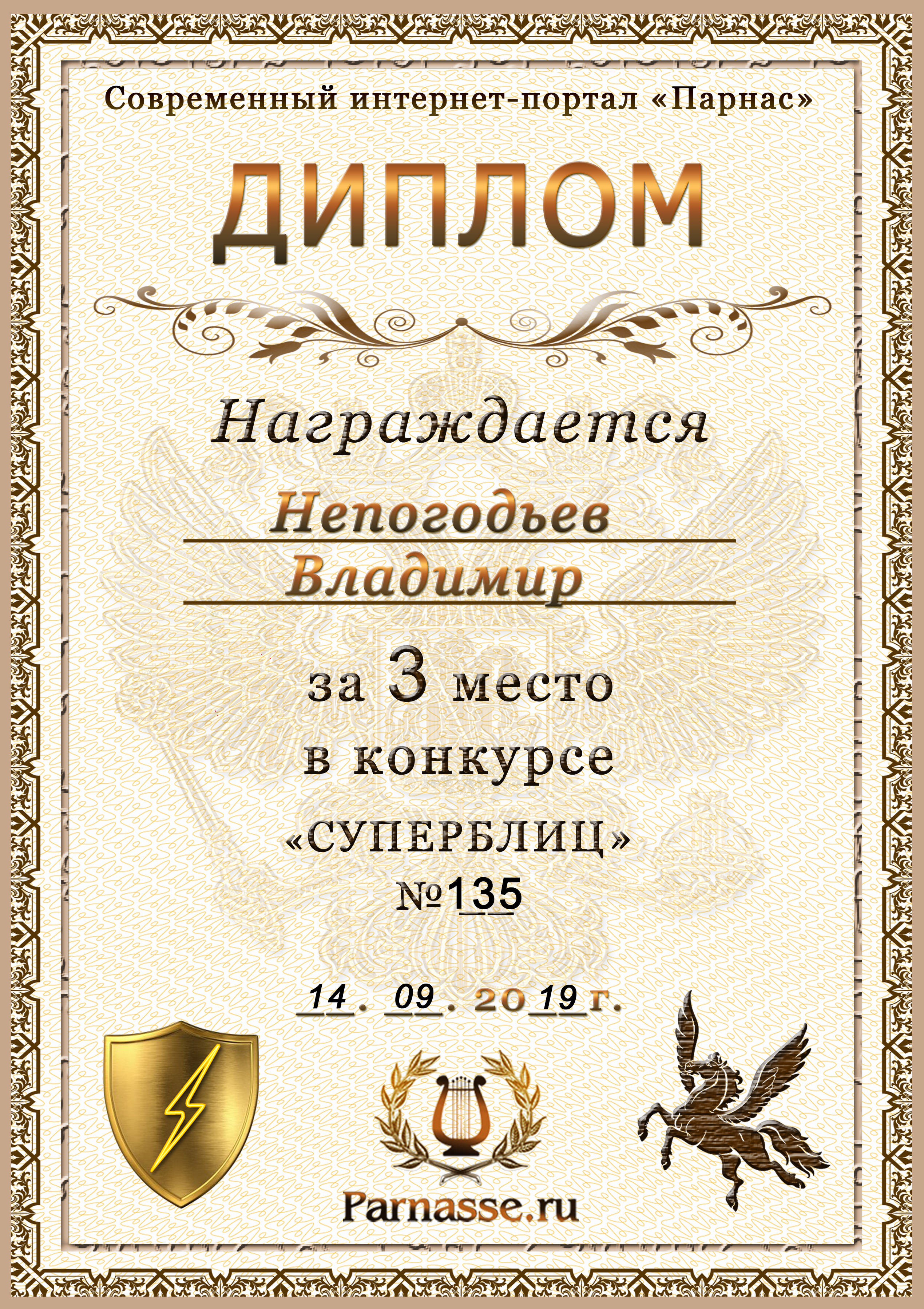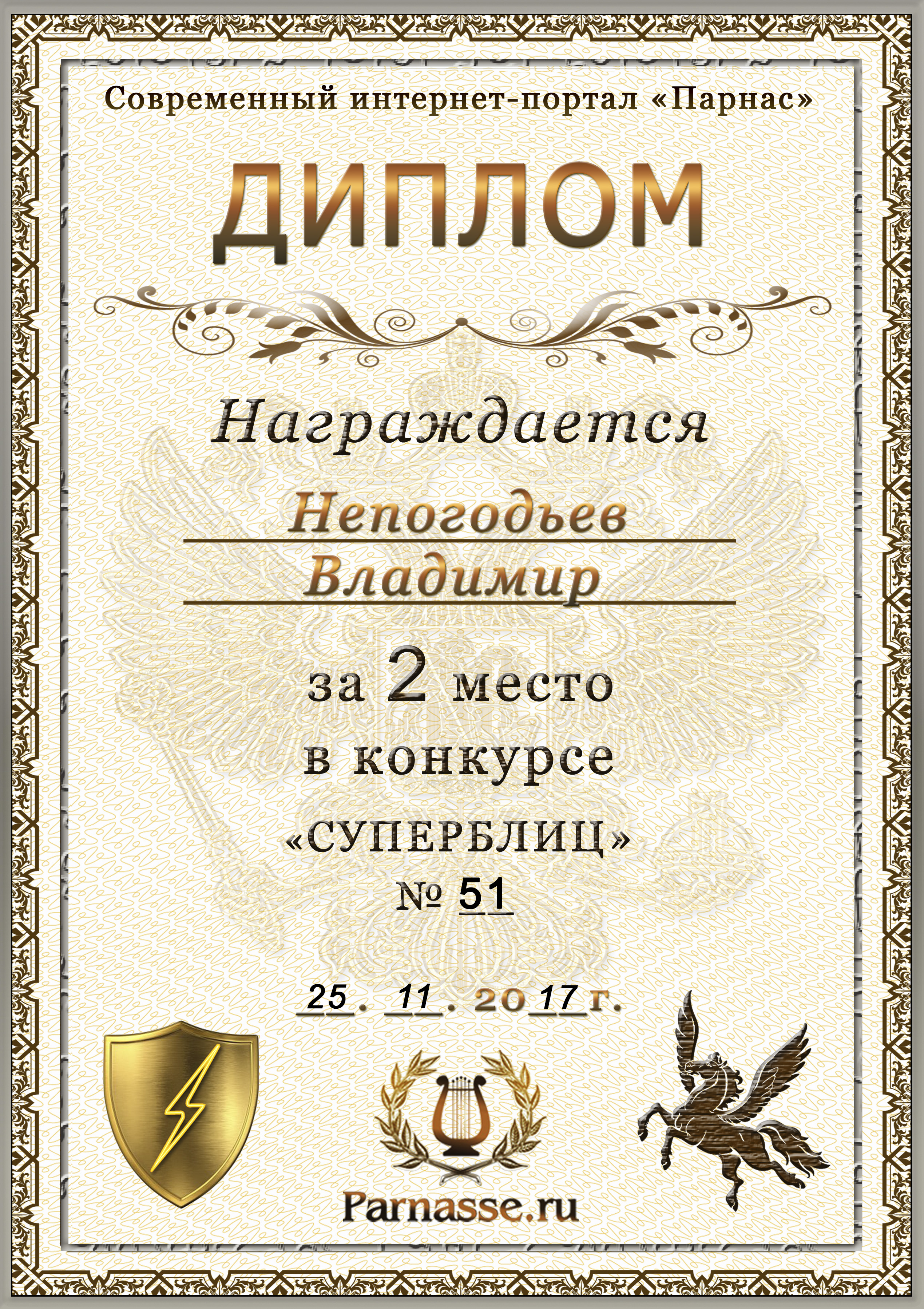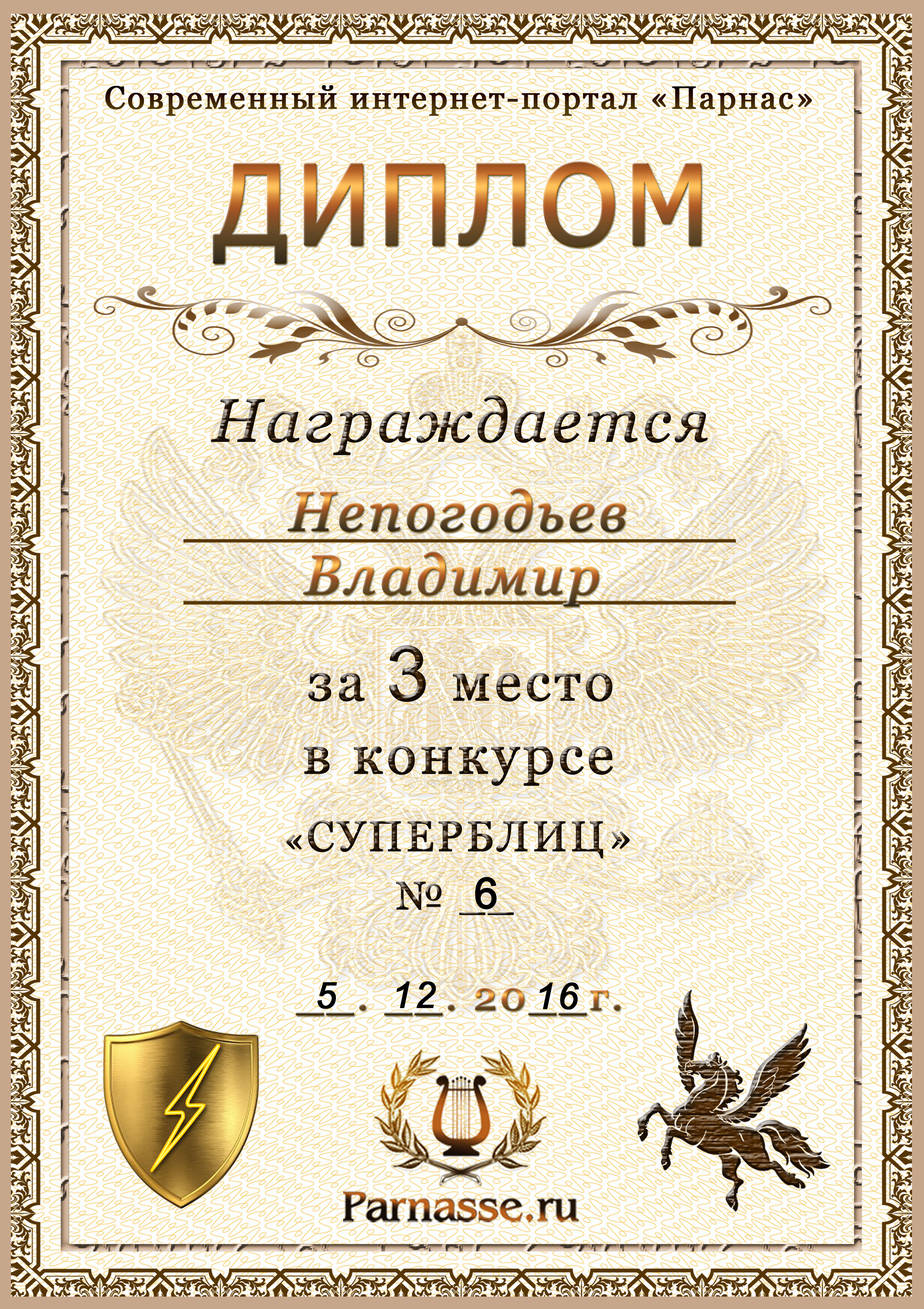 Диплом Победителя за 1 место в праздничном конкурсе "Поздравим Парнас с трёхлетием вместе!"