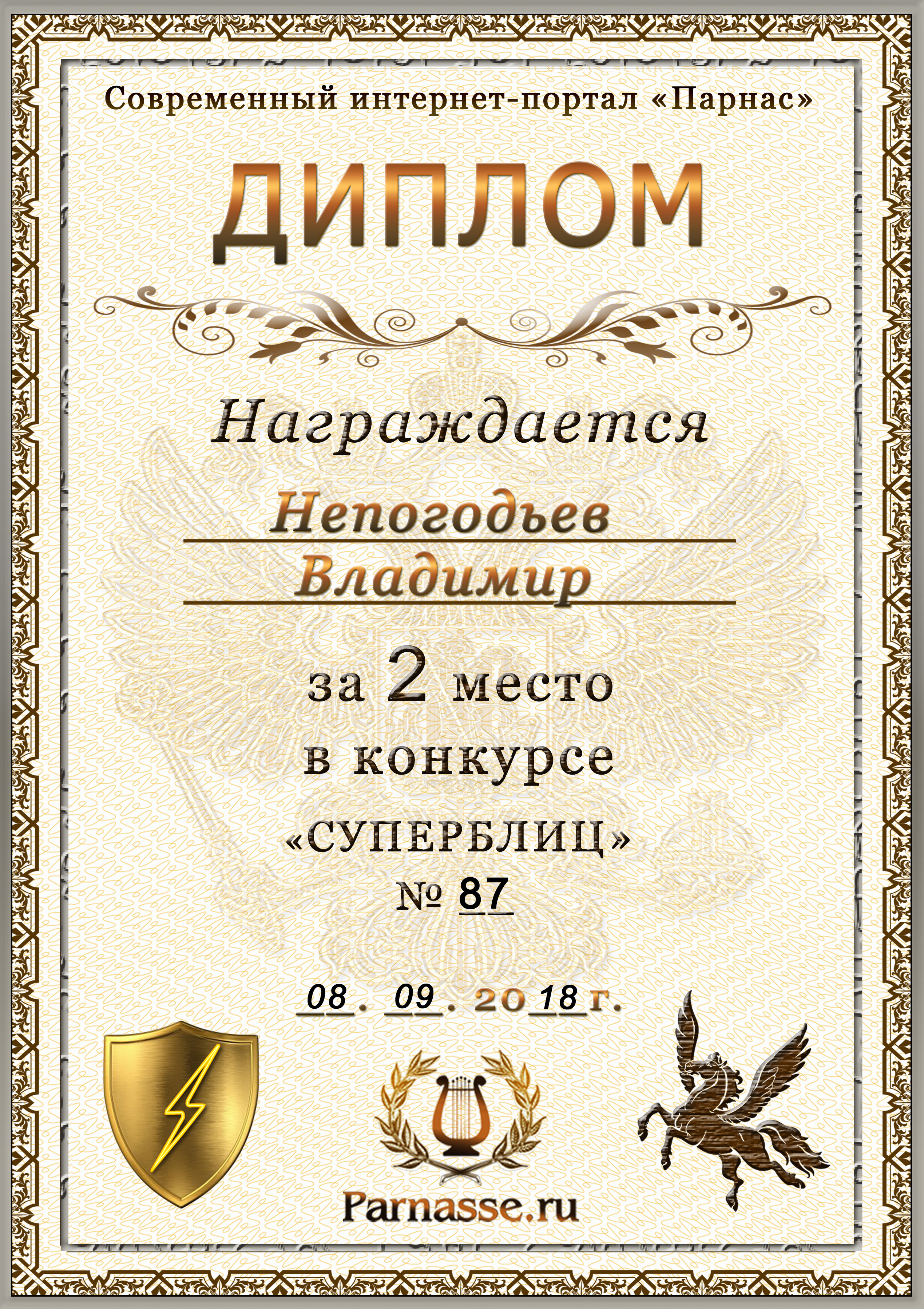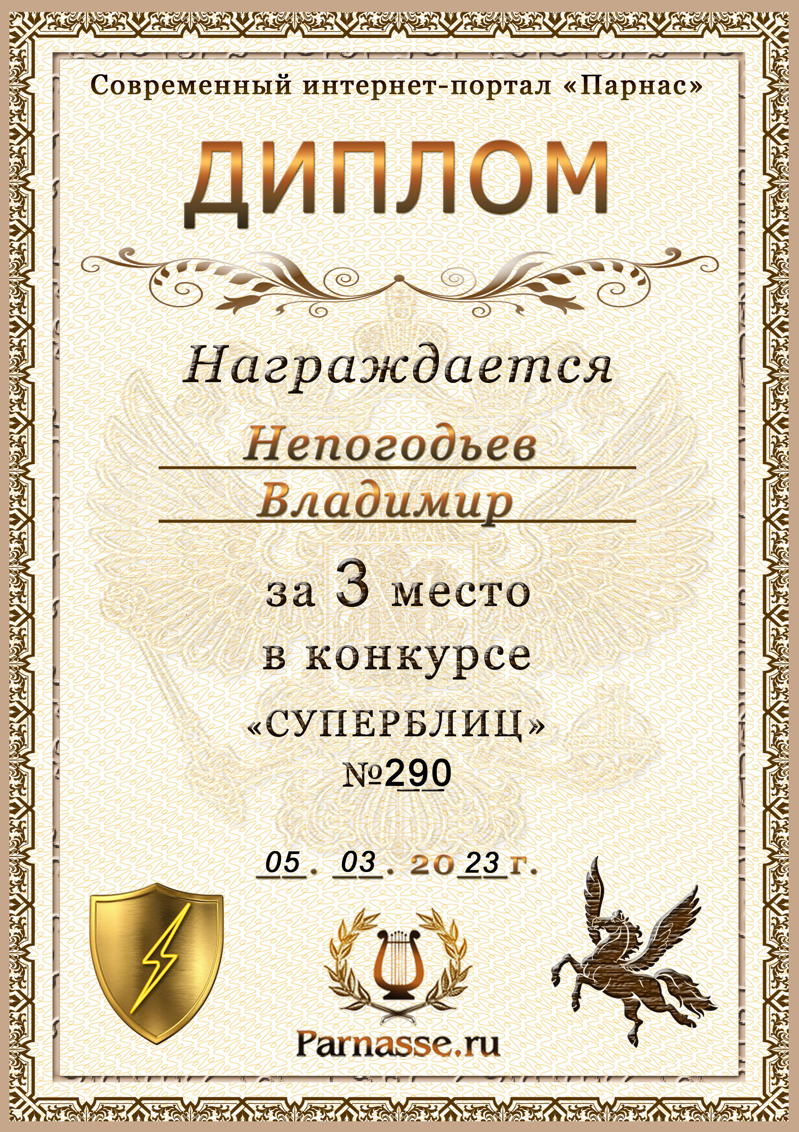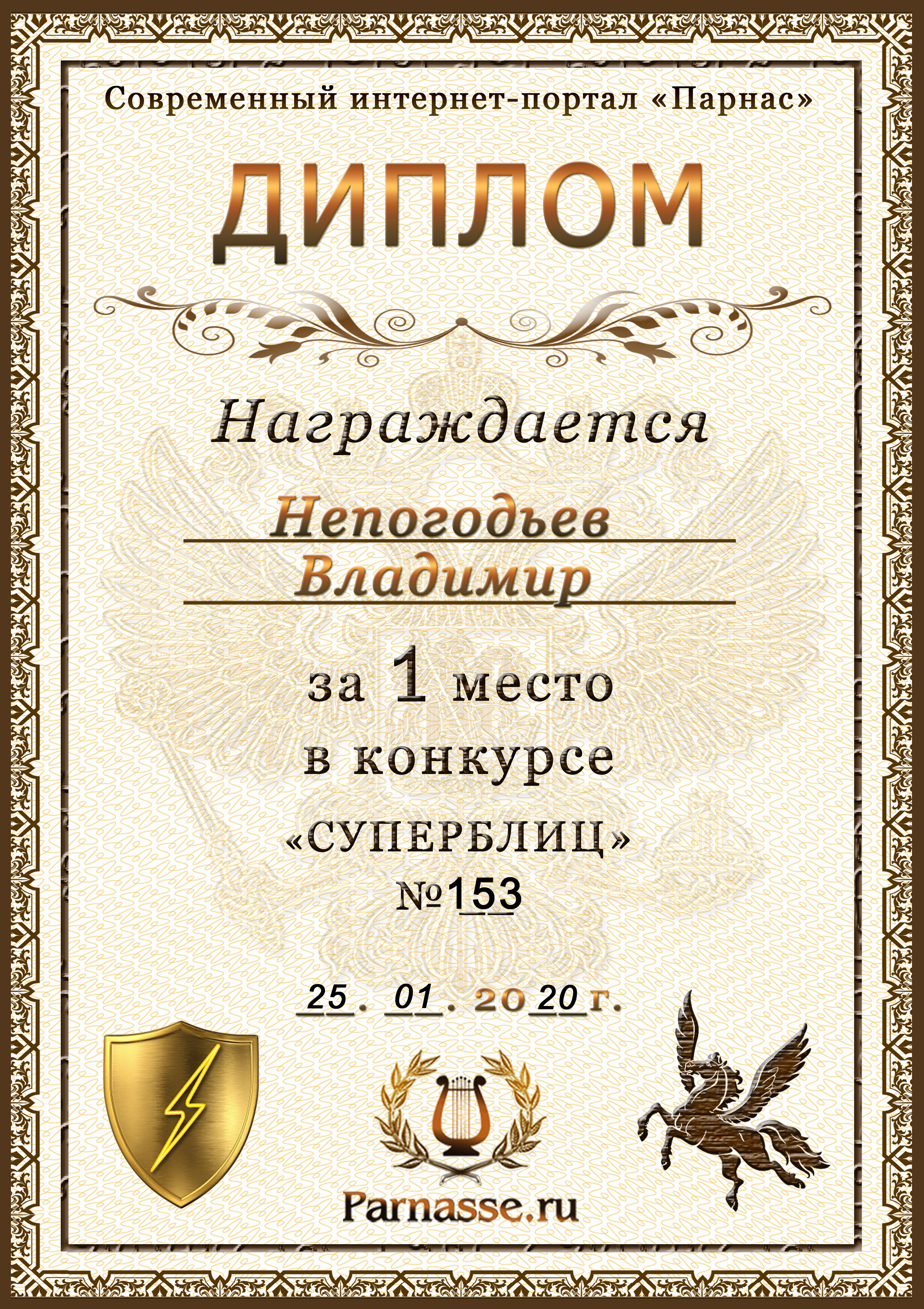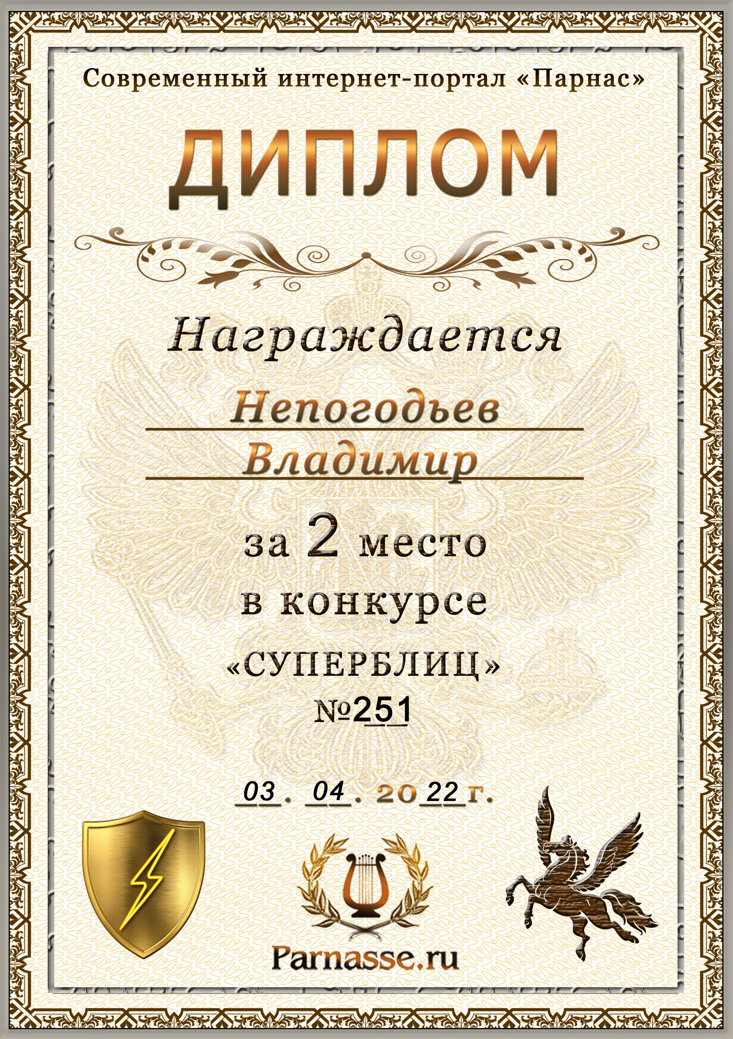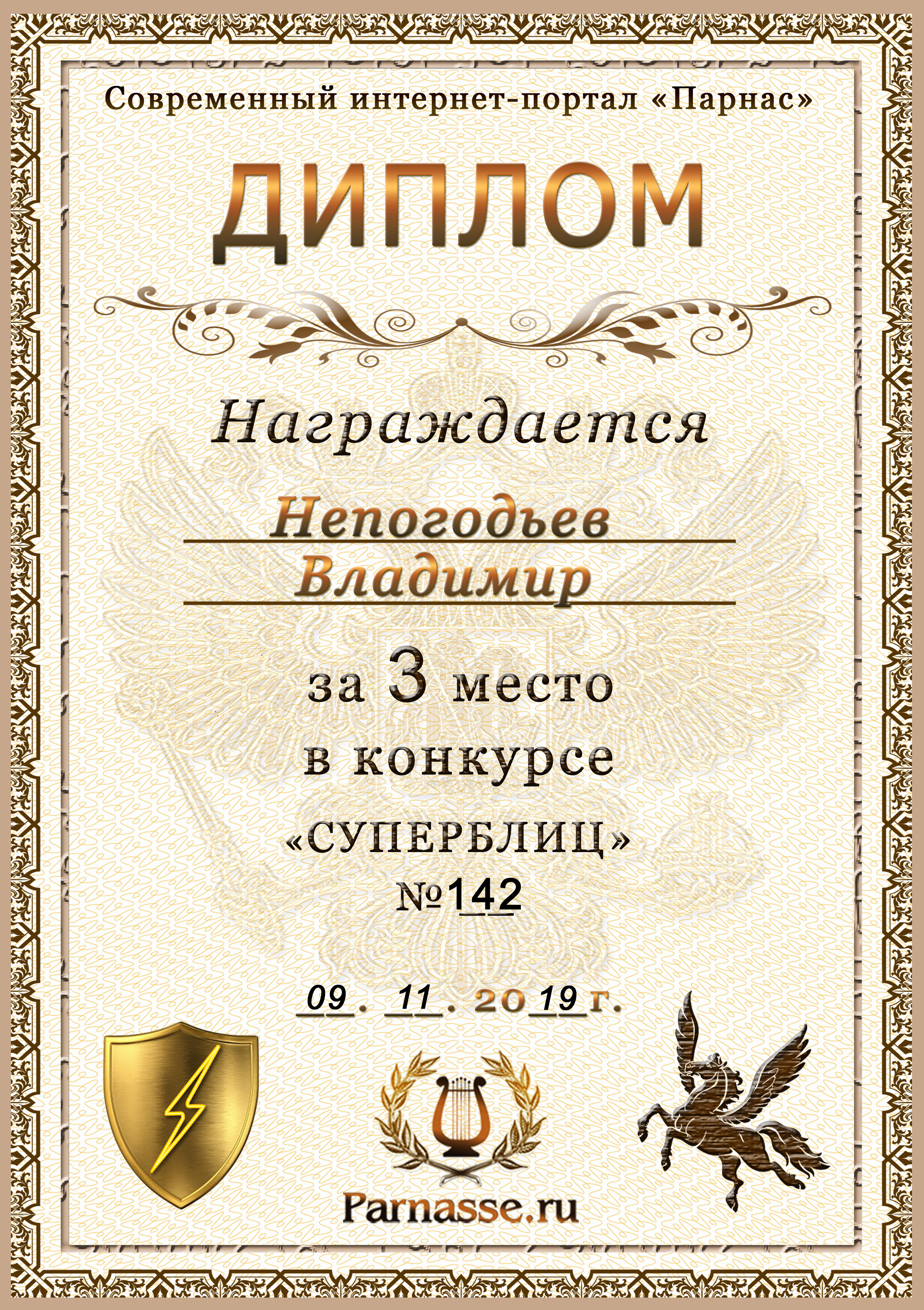 Диплом Победителя за 1 место в праздничном конкурсе "Поздравим Парнас с трёхлетием вместе!"