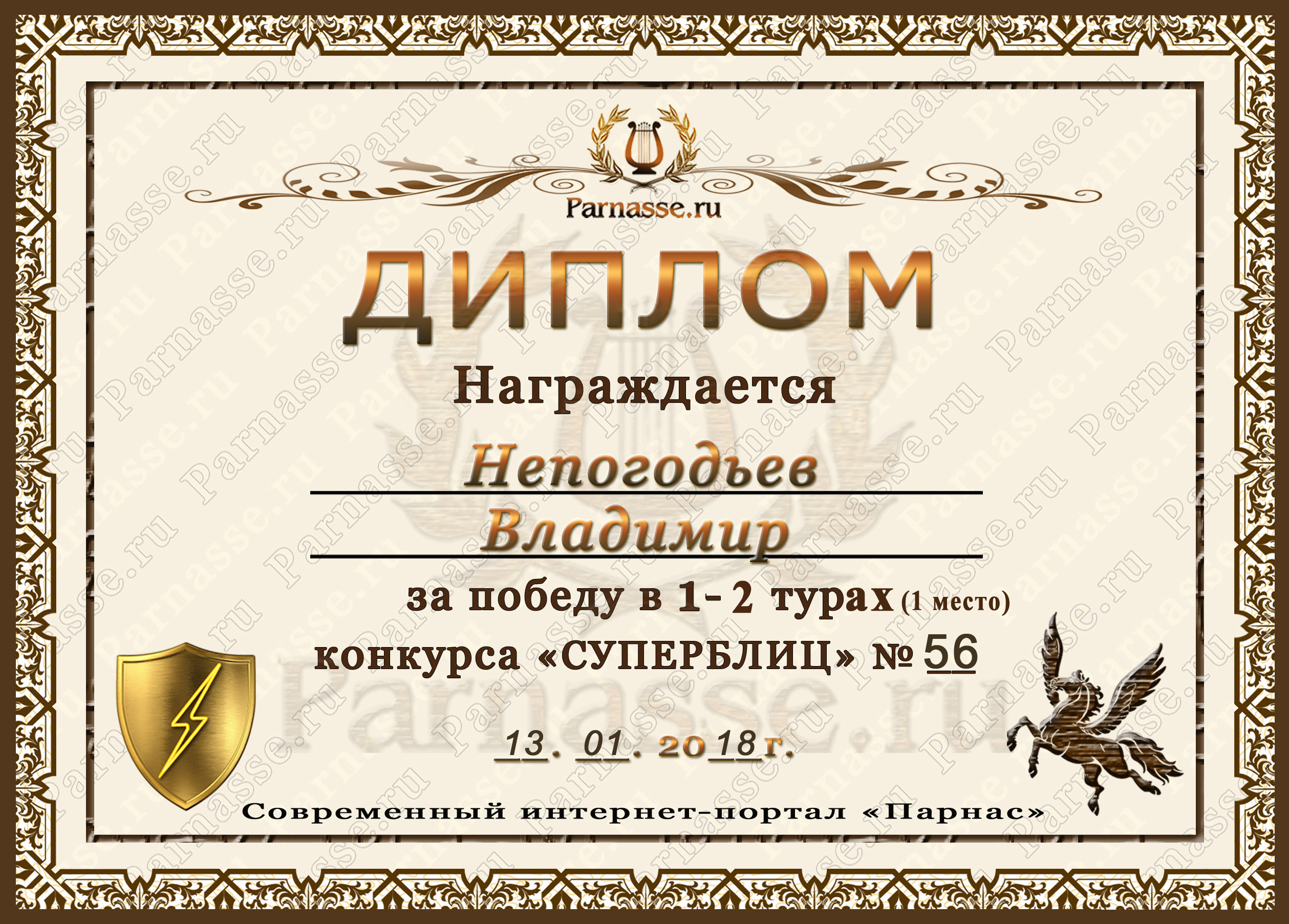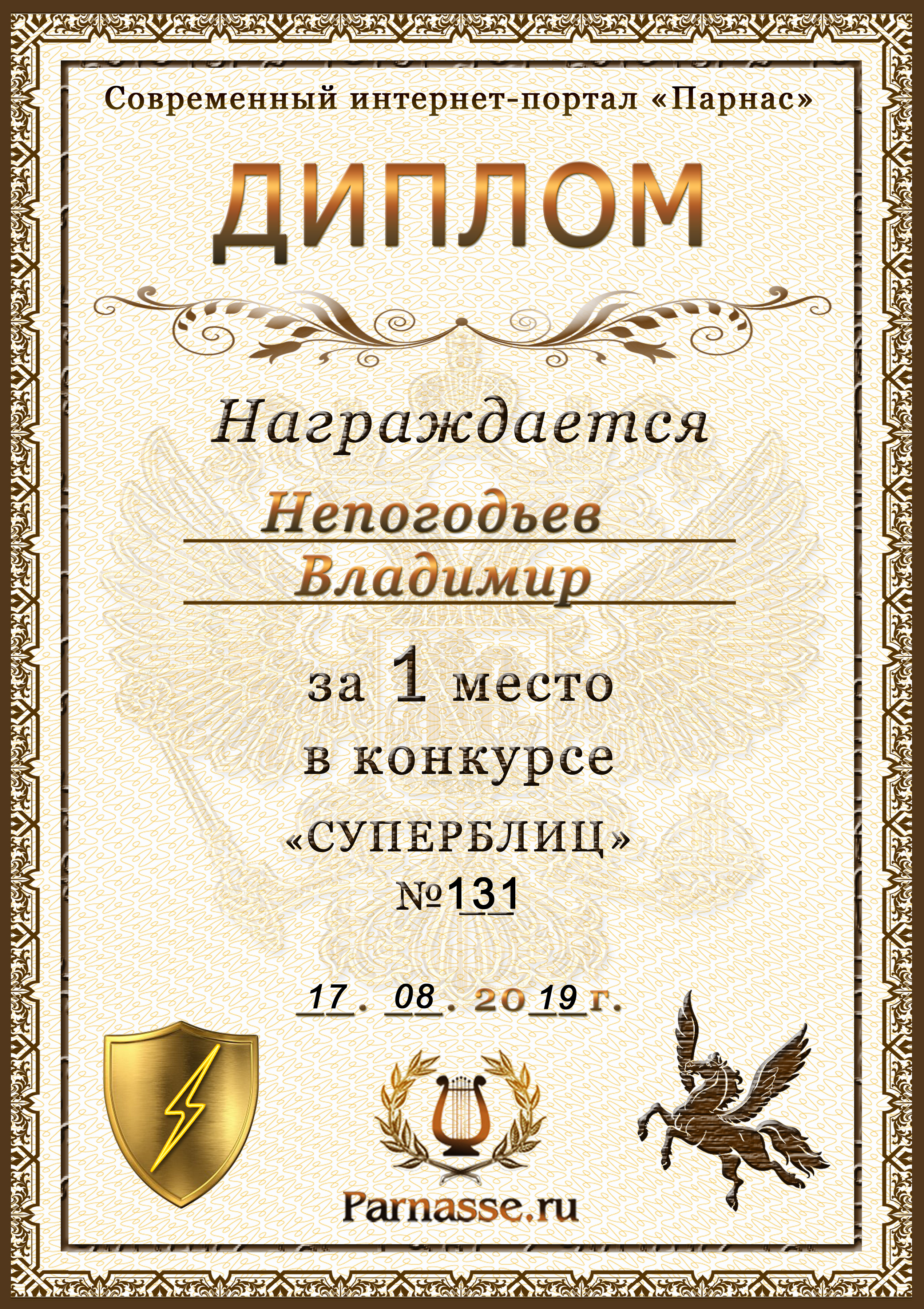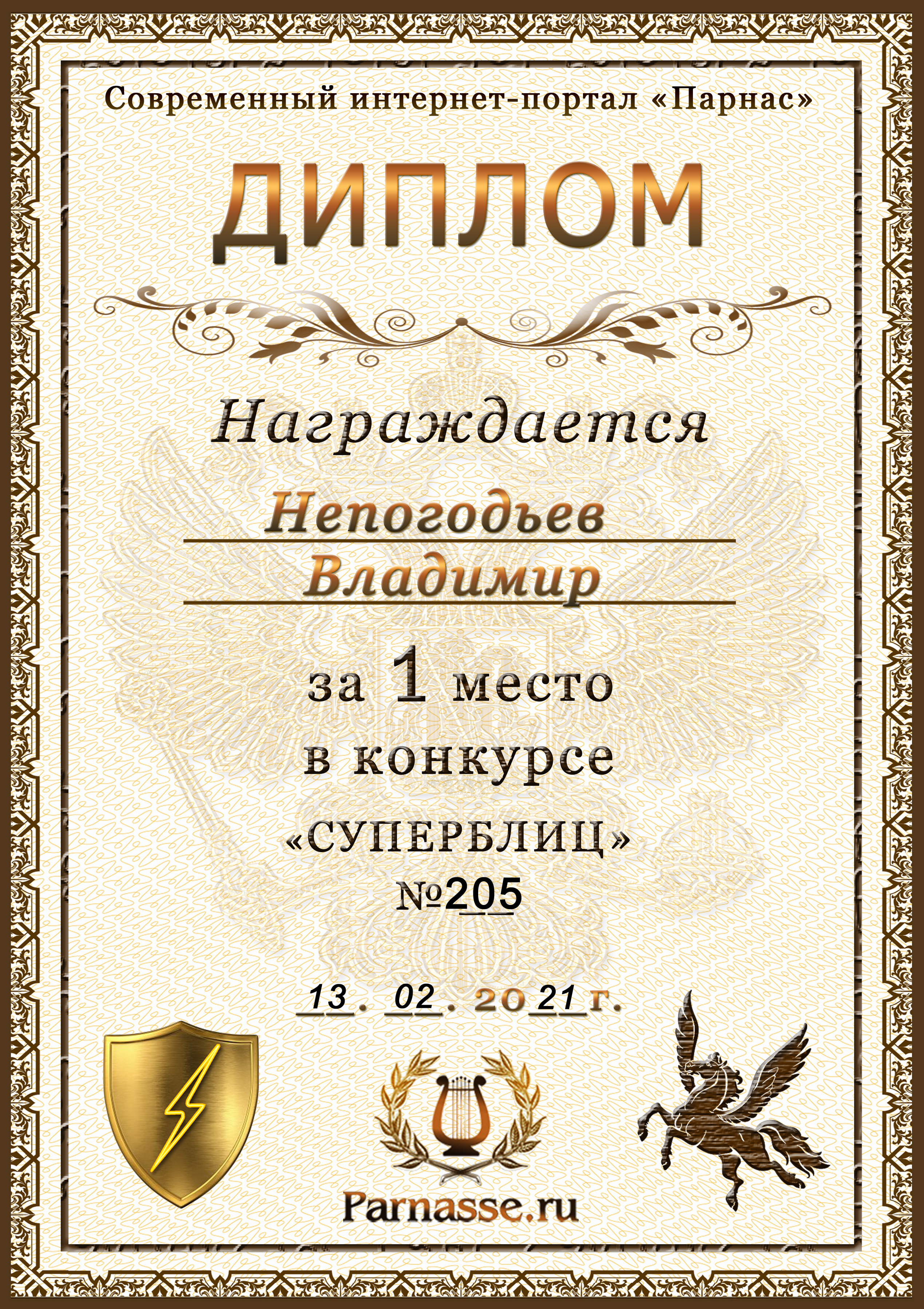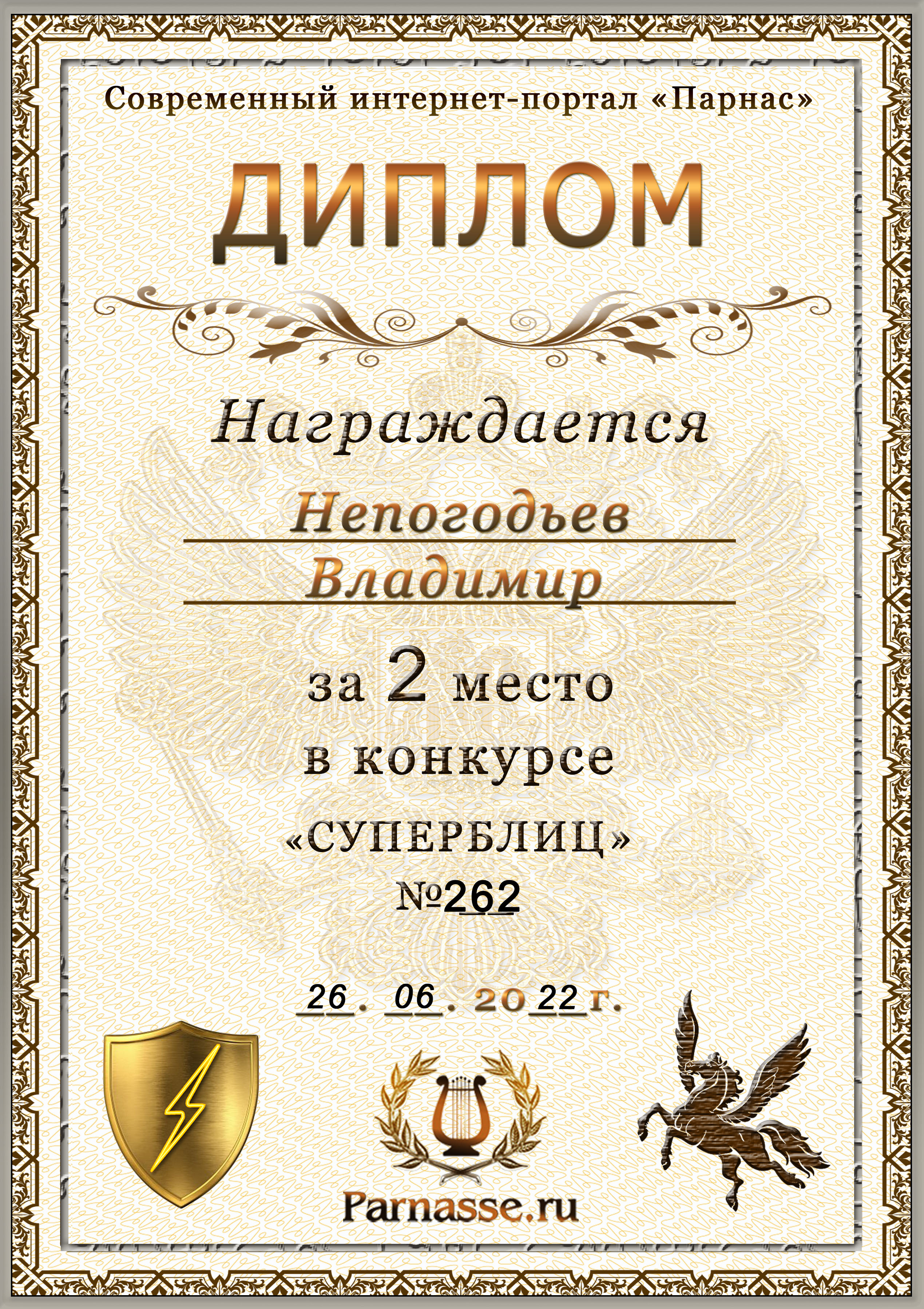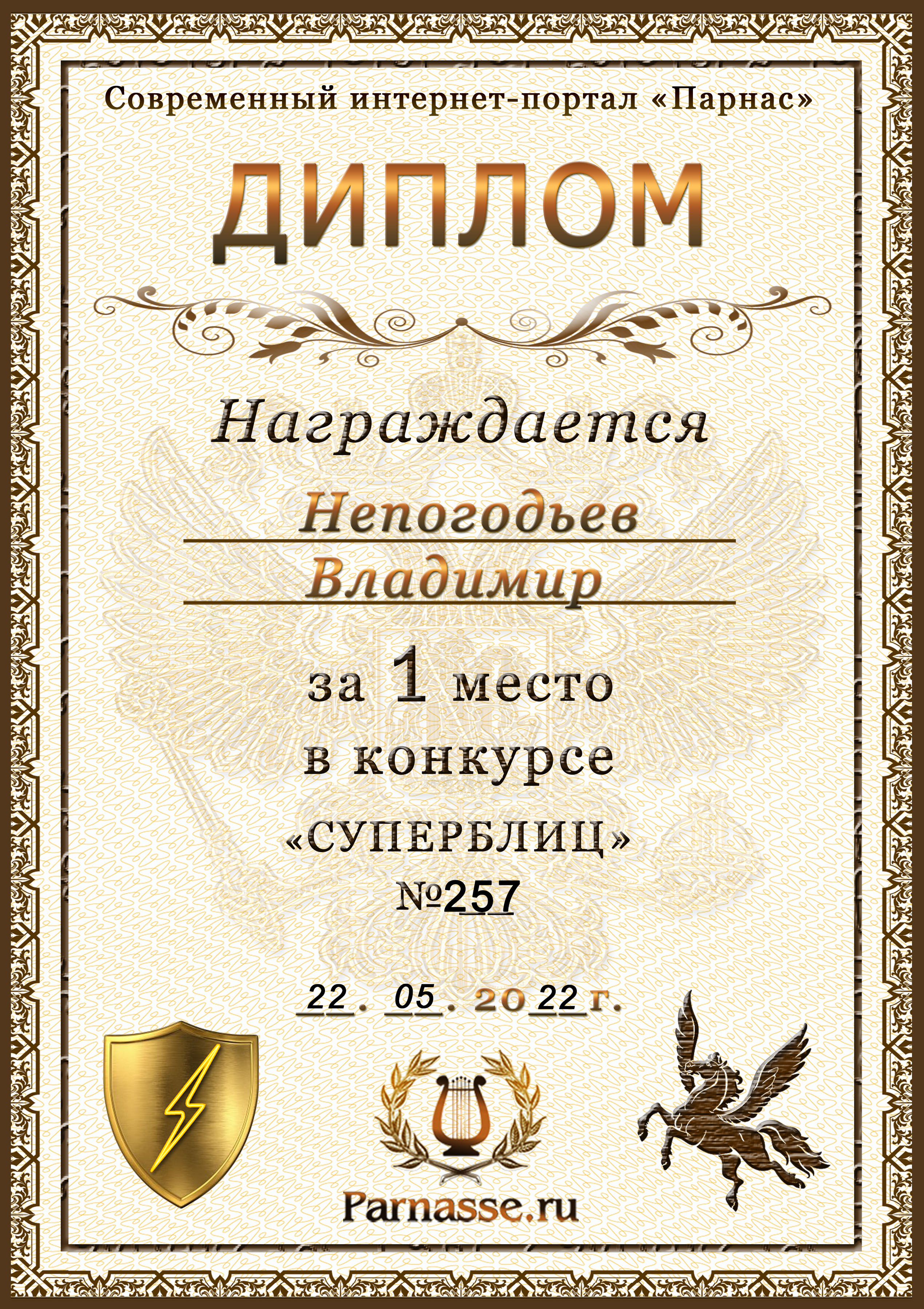Диплом Победителя за 1 место в праздничном конкурсе "Поздравим Парнас с трёхлетием вместе!"