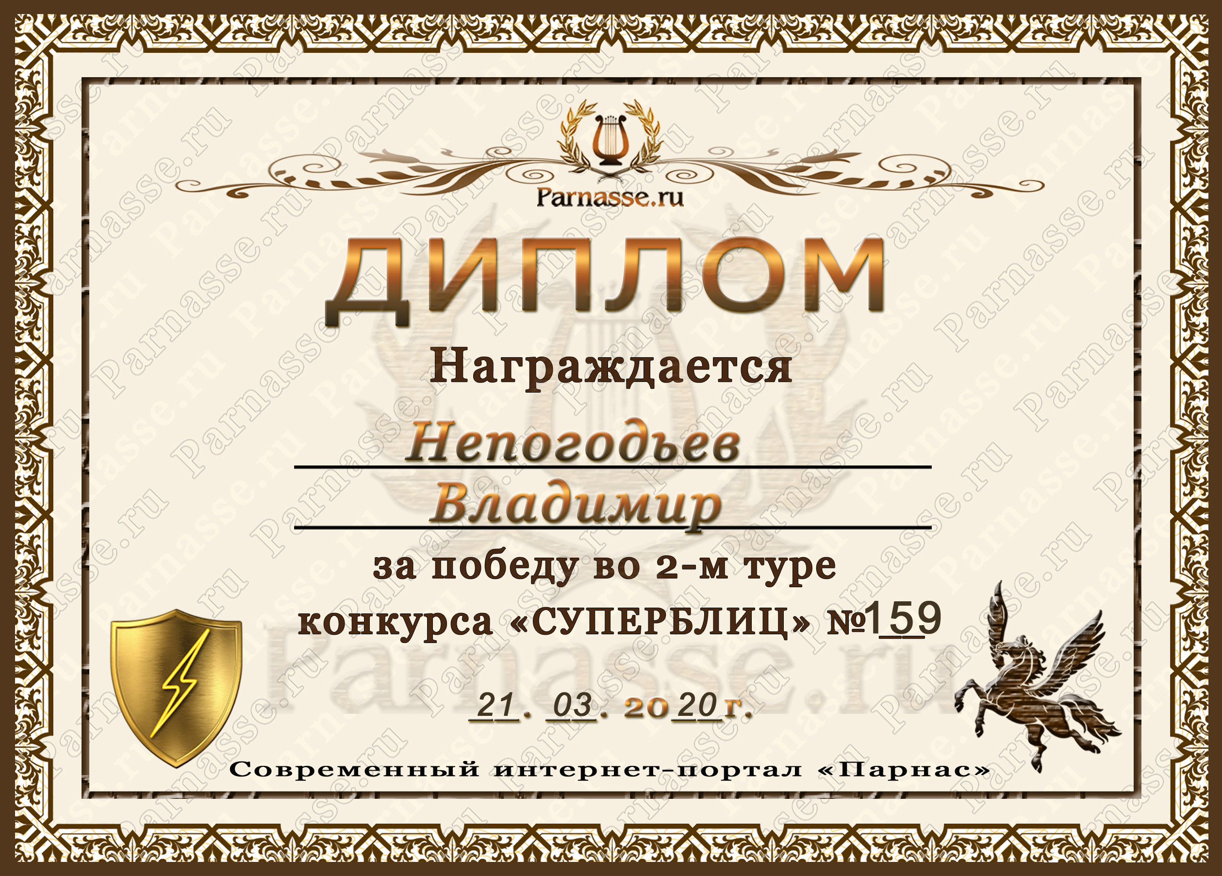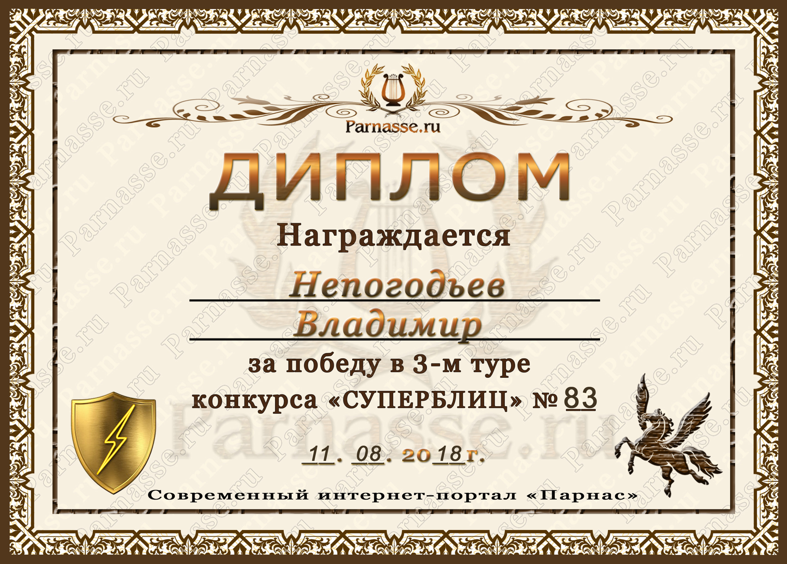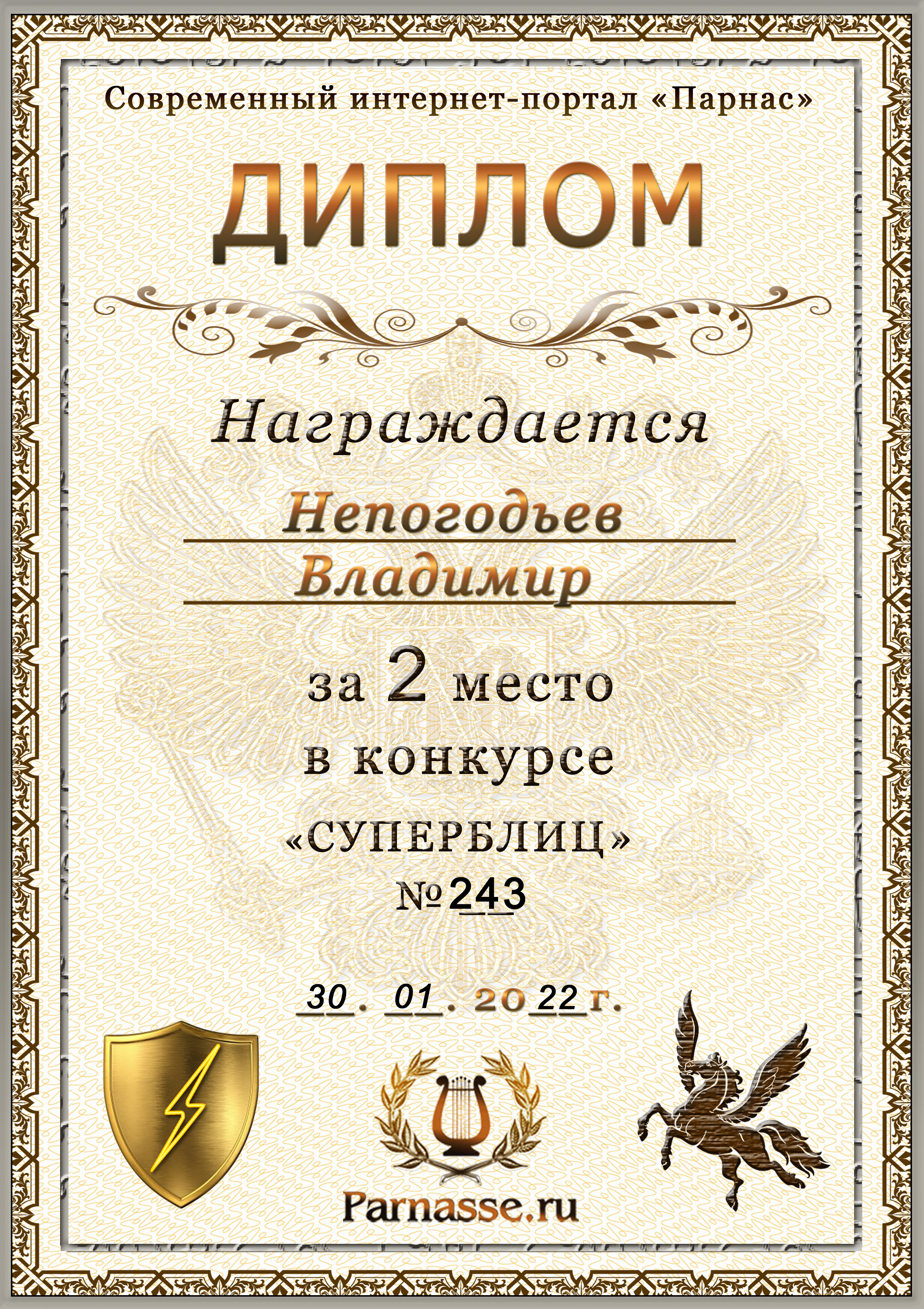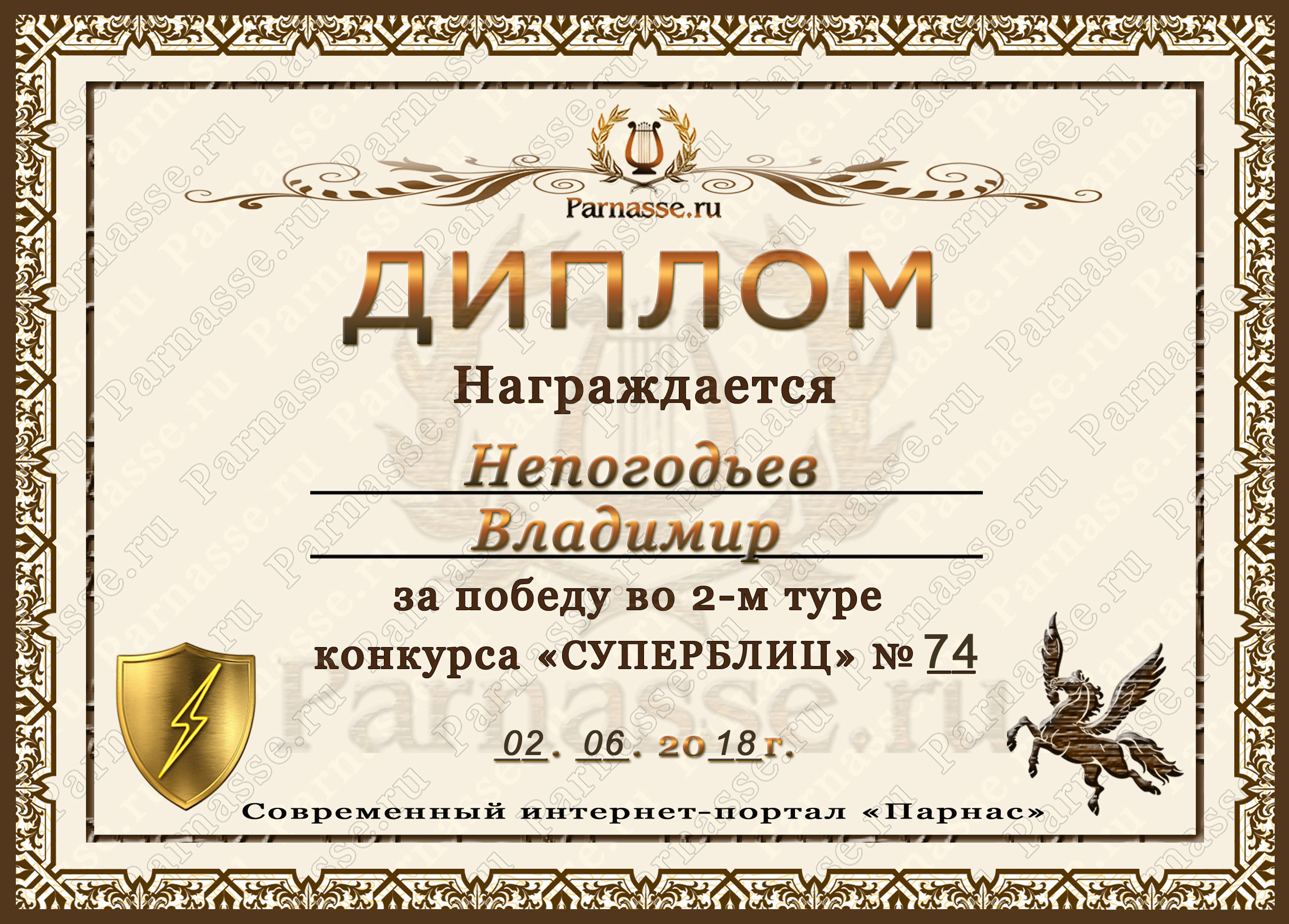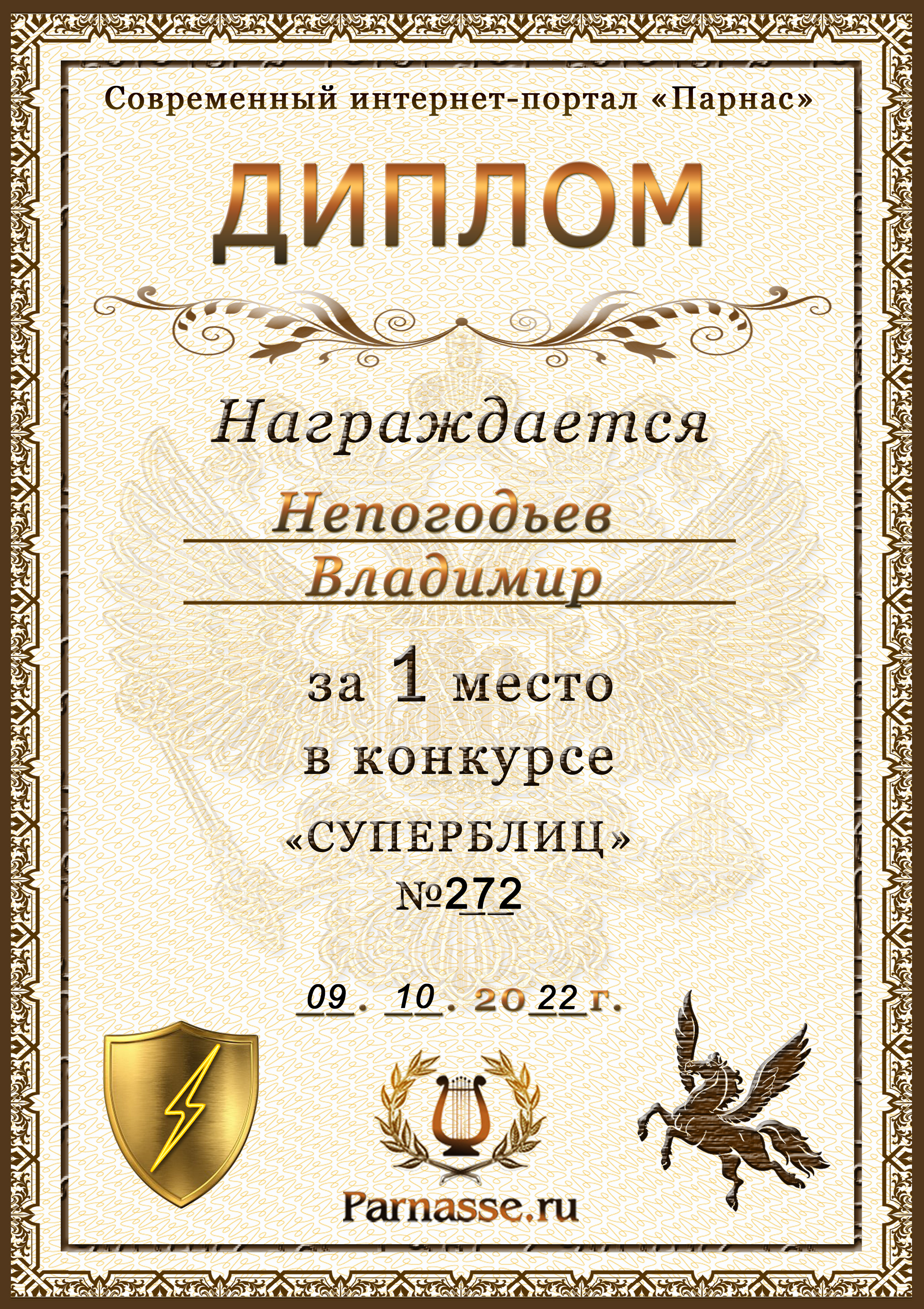 Диплом Победителя за 1 место в праздничном конкурсе "Поздравим Парнас с трёхлетием вместе!"