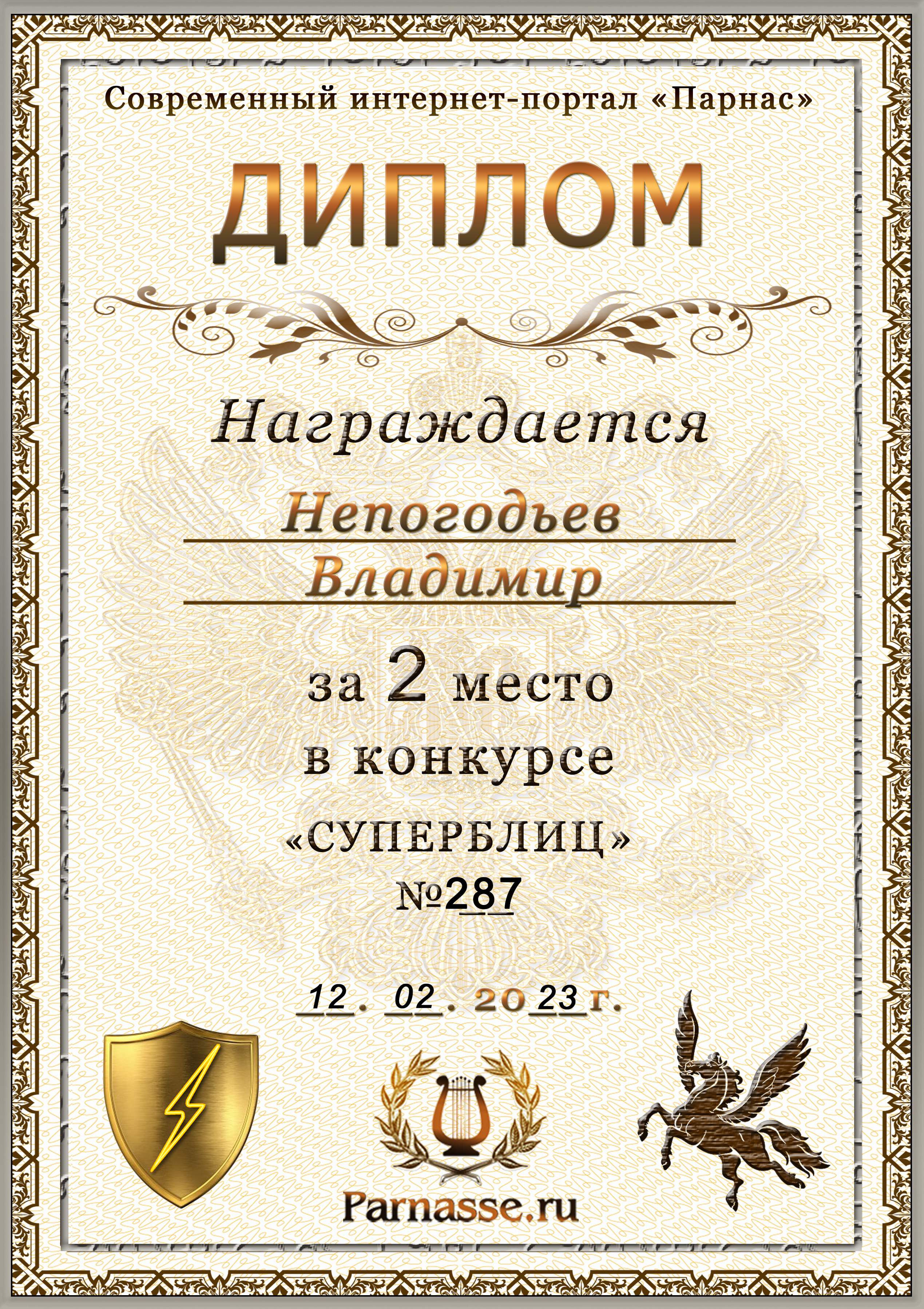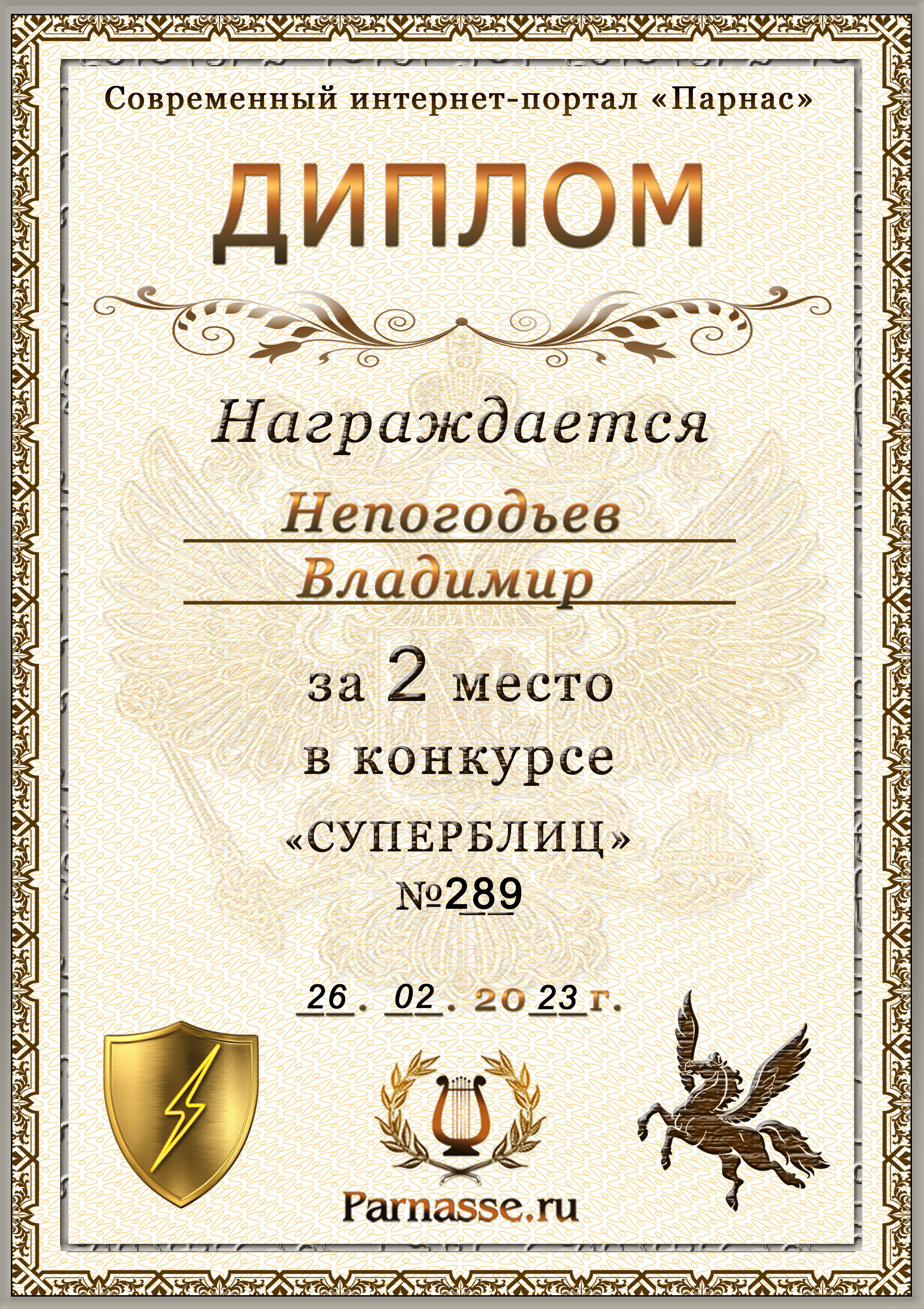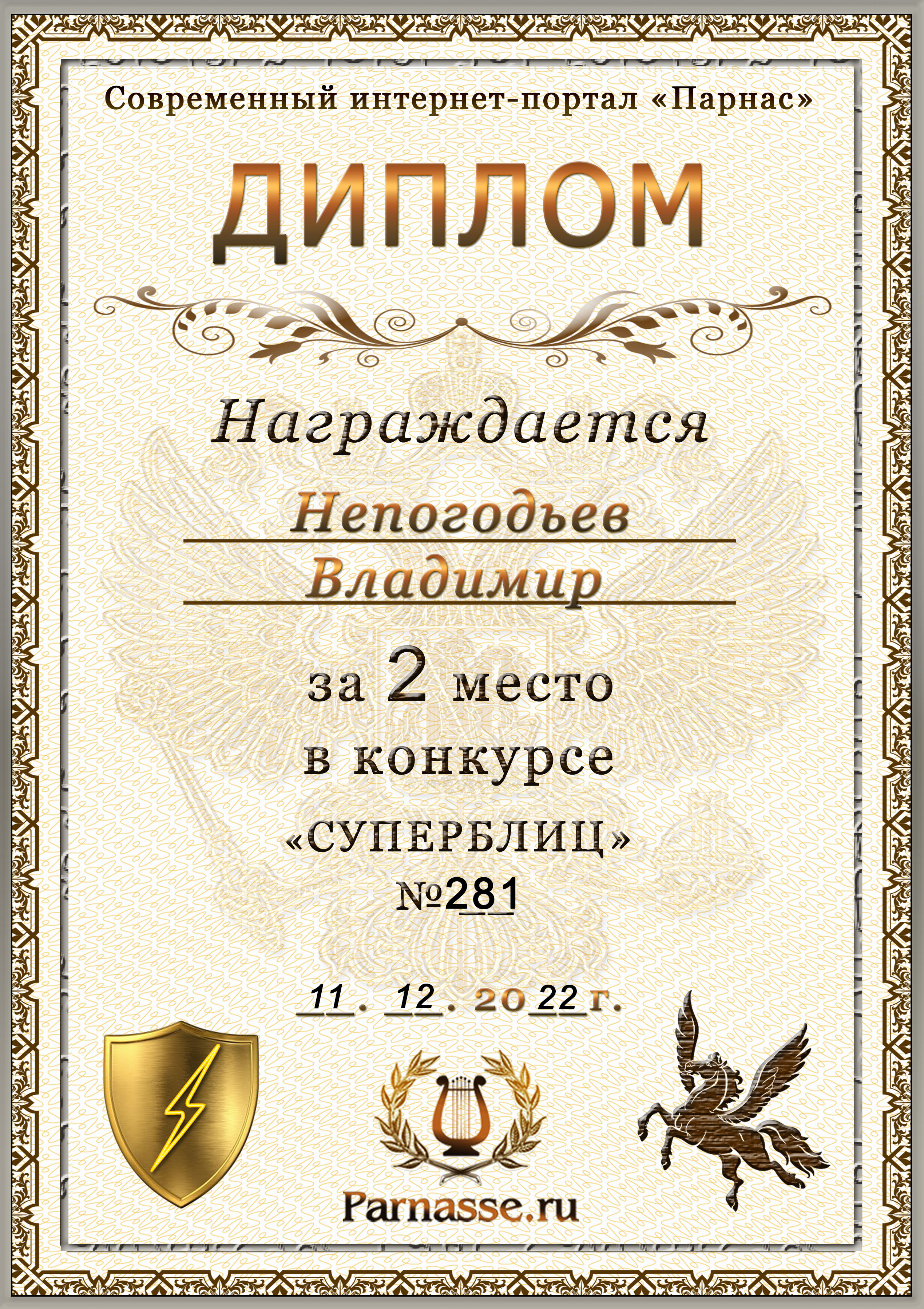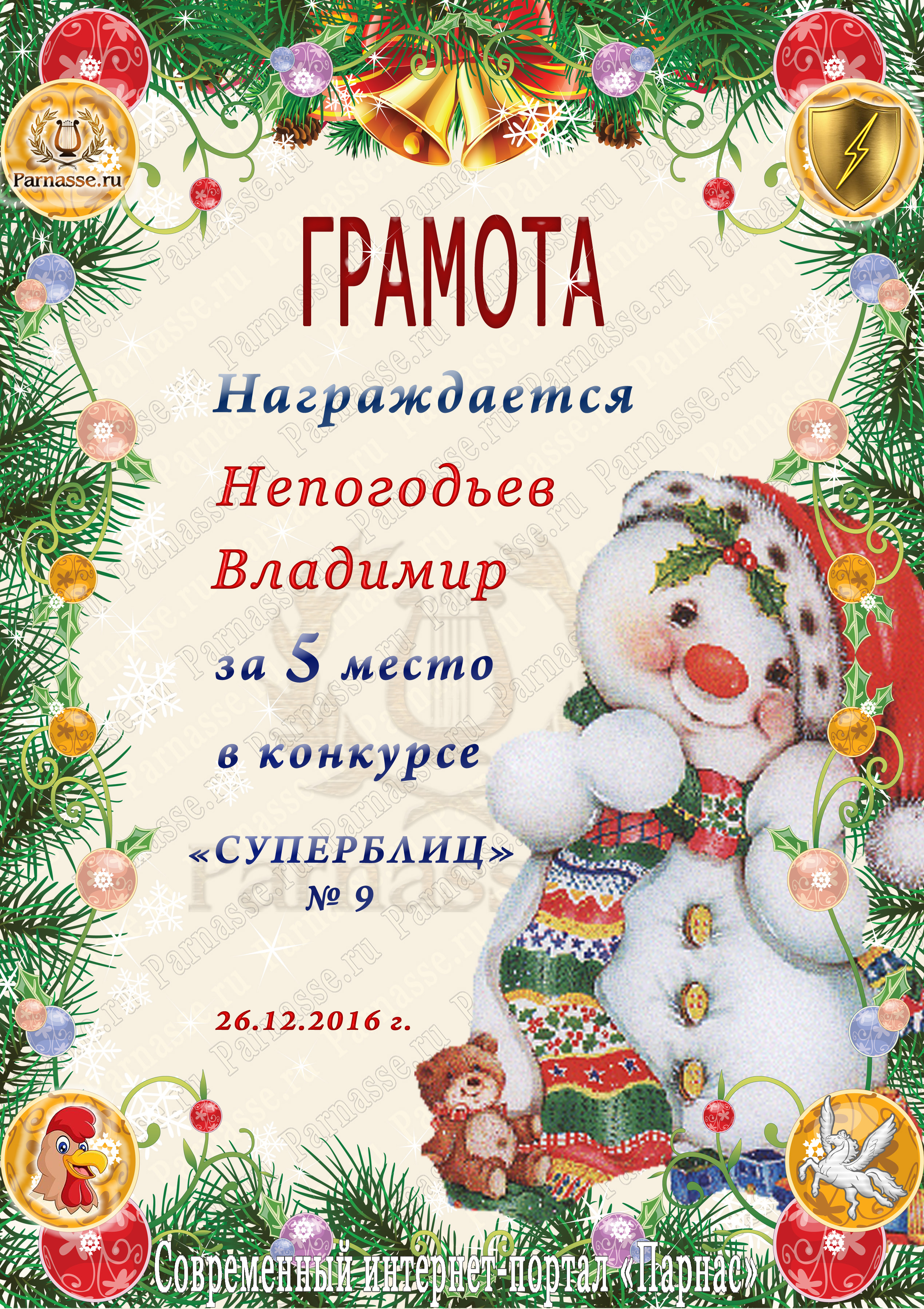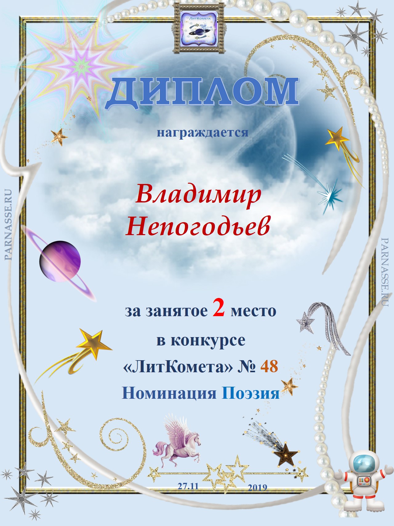 Диплом Победителя за 1 место в праздничном конкурсе "Поздравим Парнас с трёхлетием вместе!"