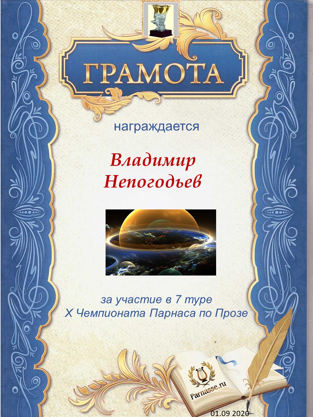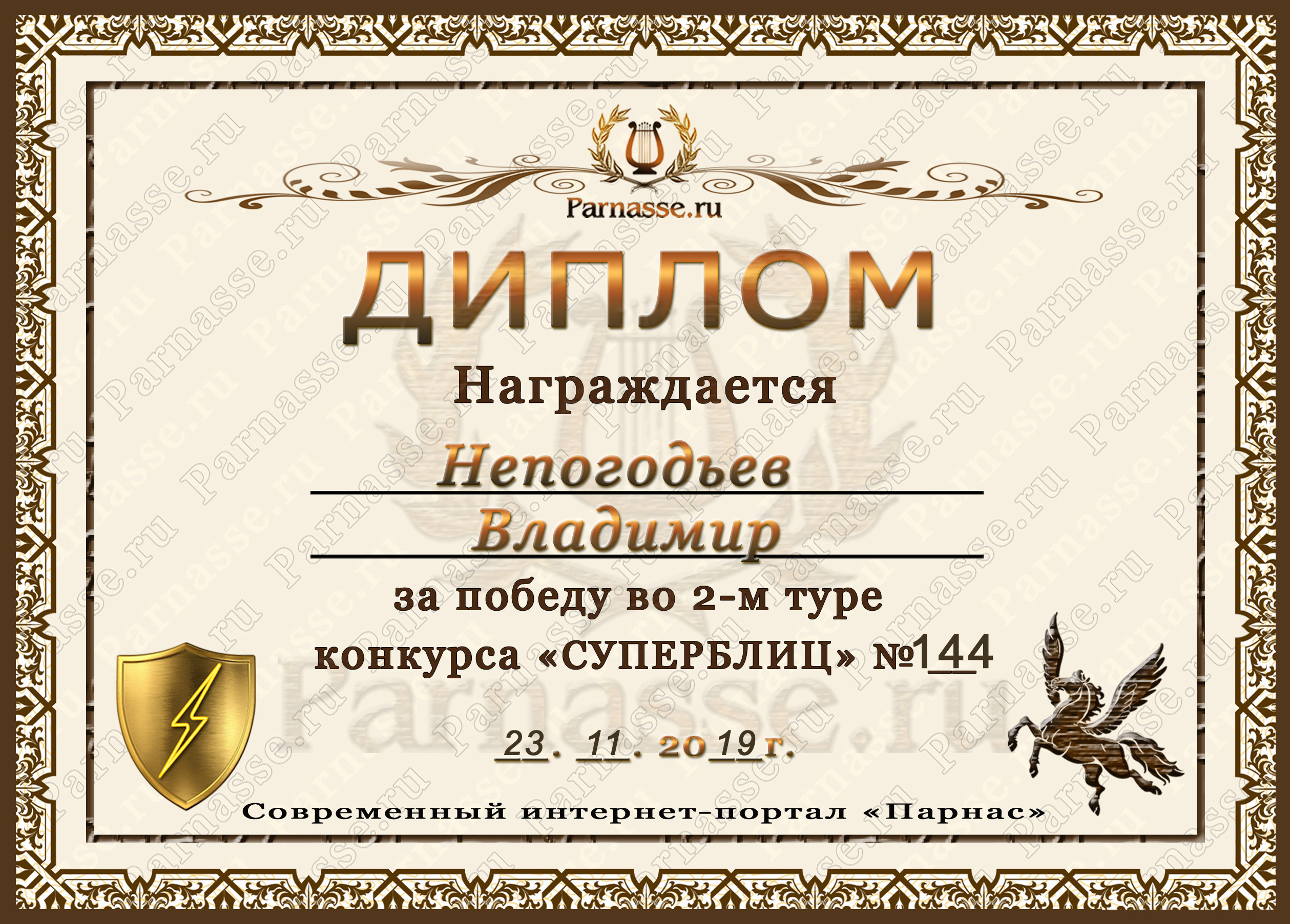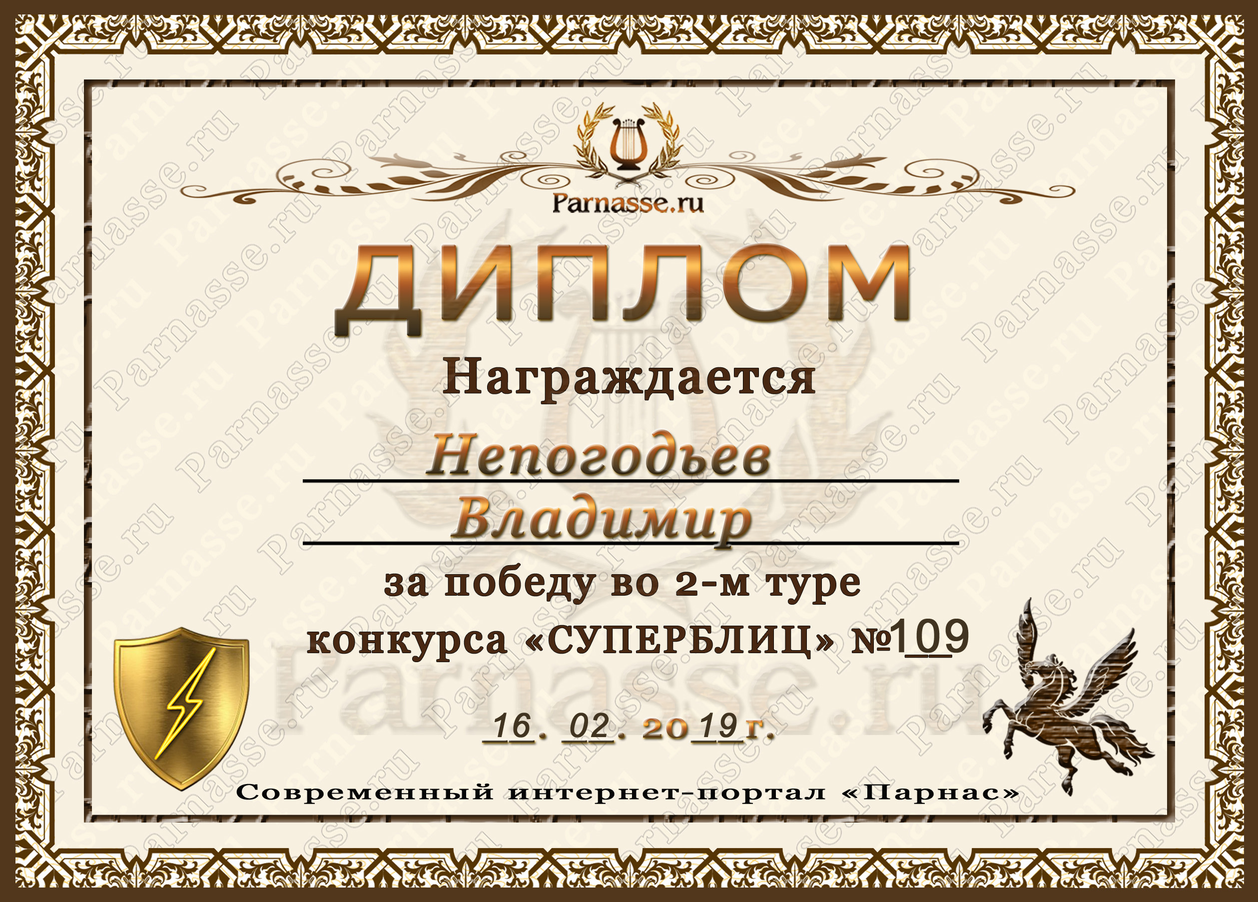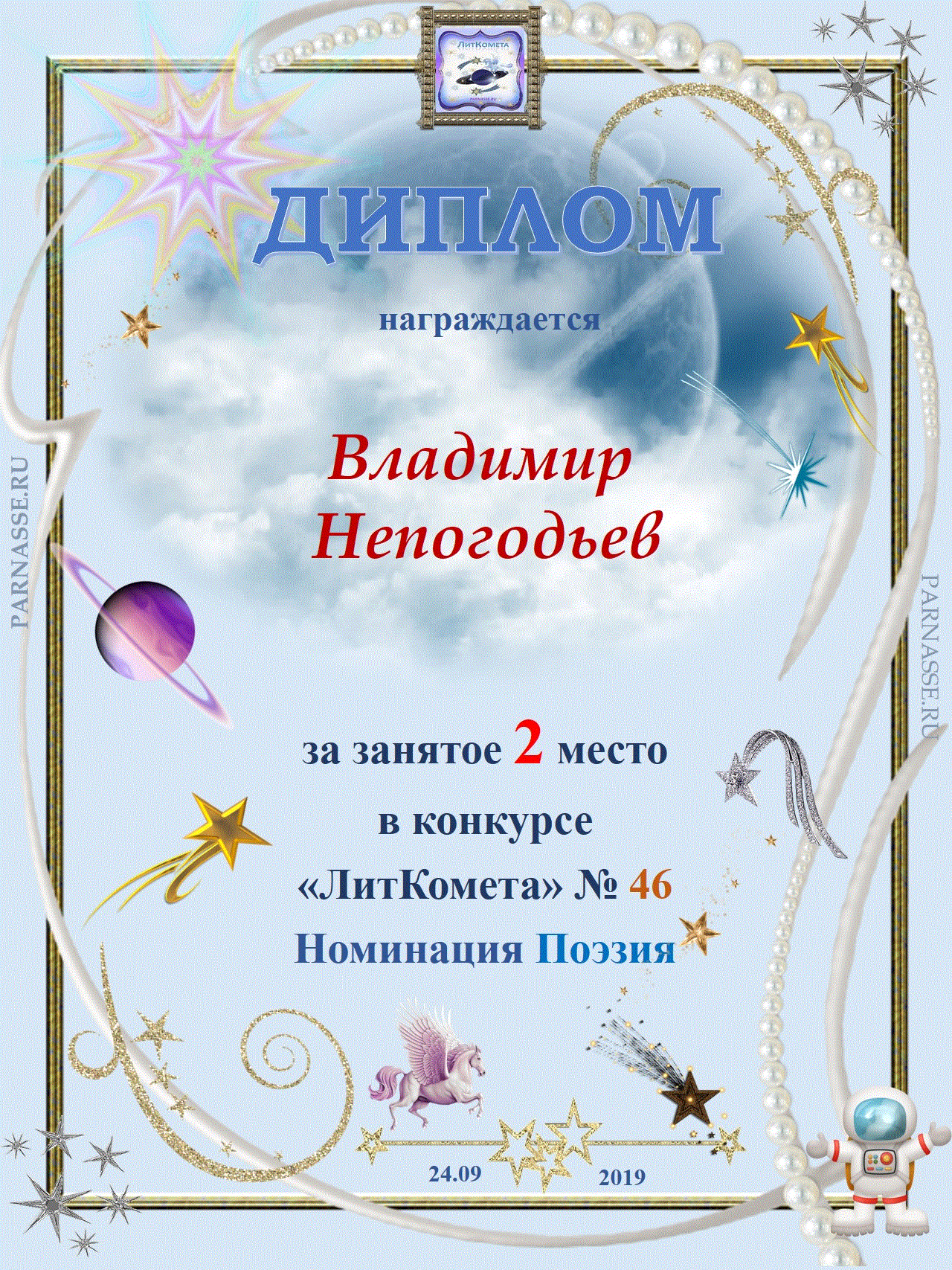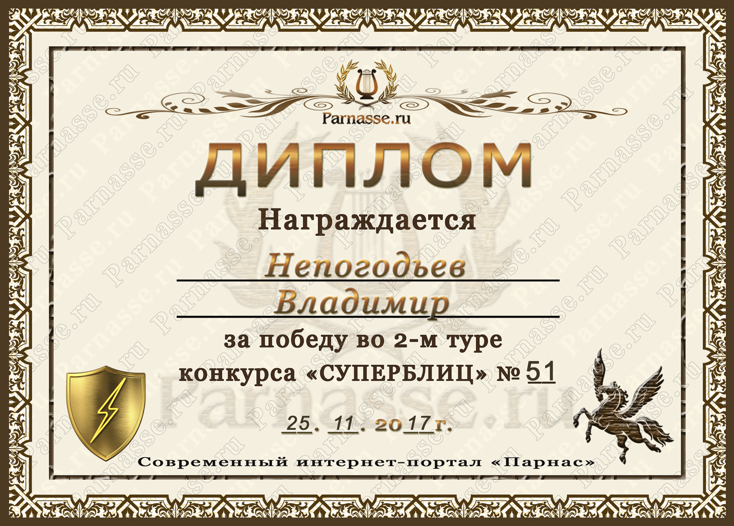 Диплом Победителя за 1 место в праздничном конкурсе "Поздравим Парнас с трёхлетием вместе!"