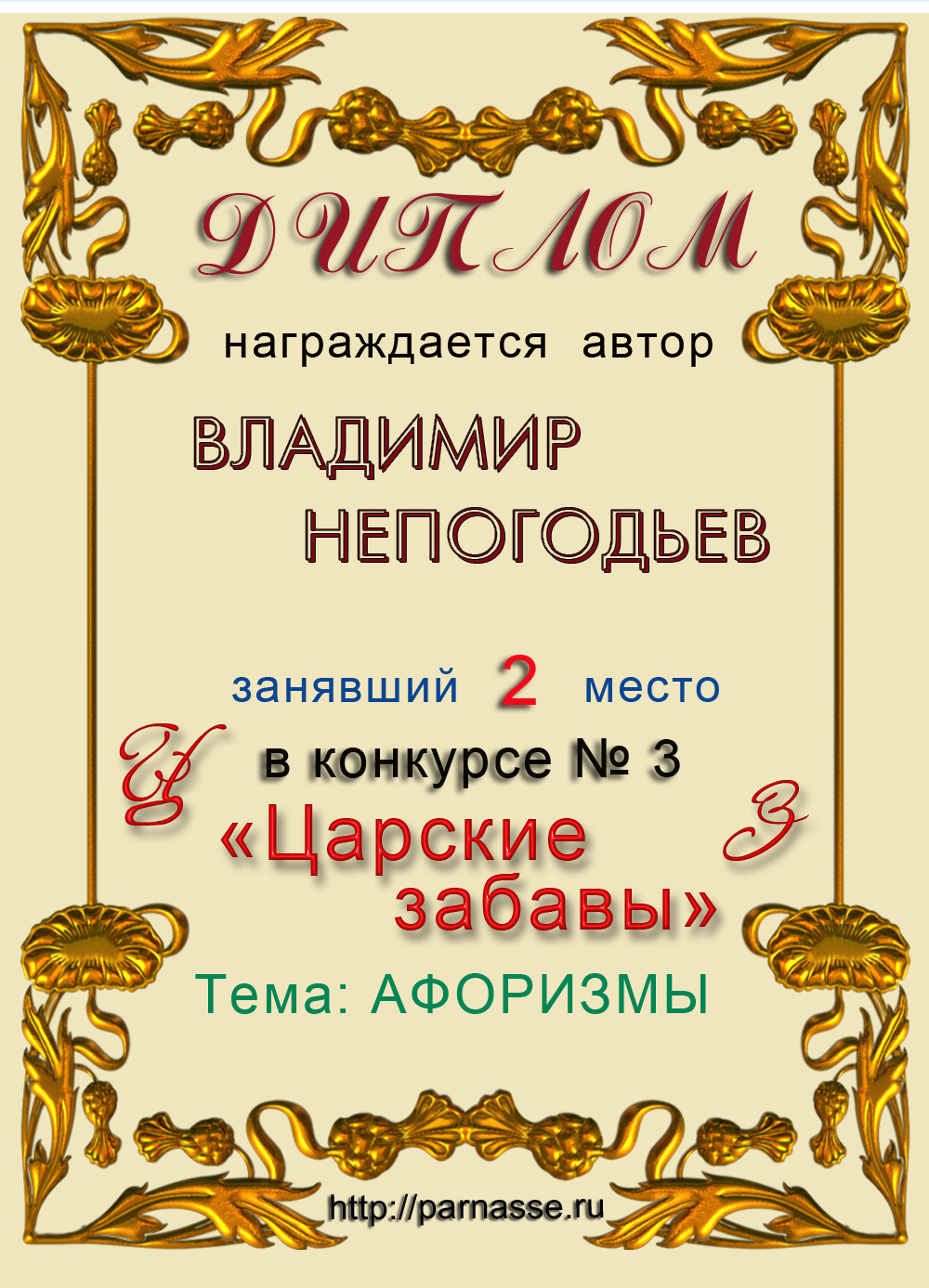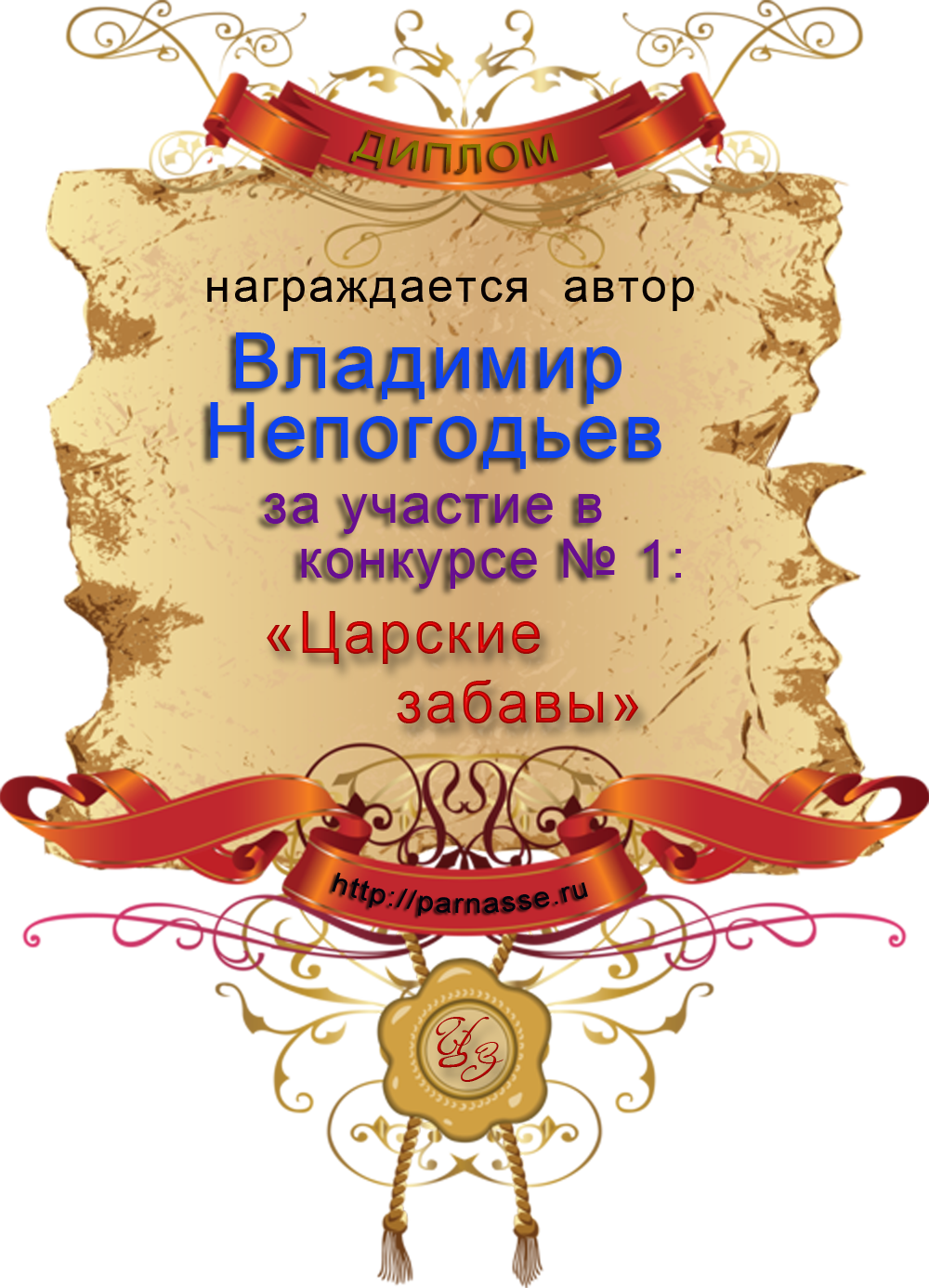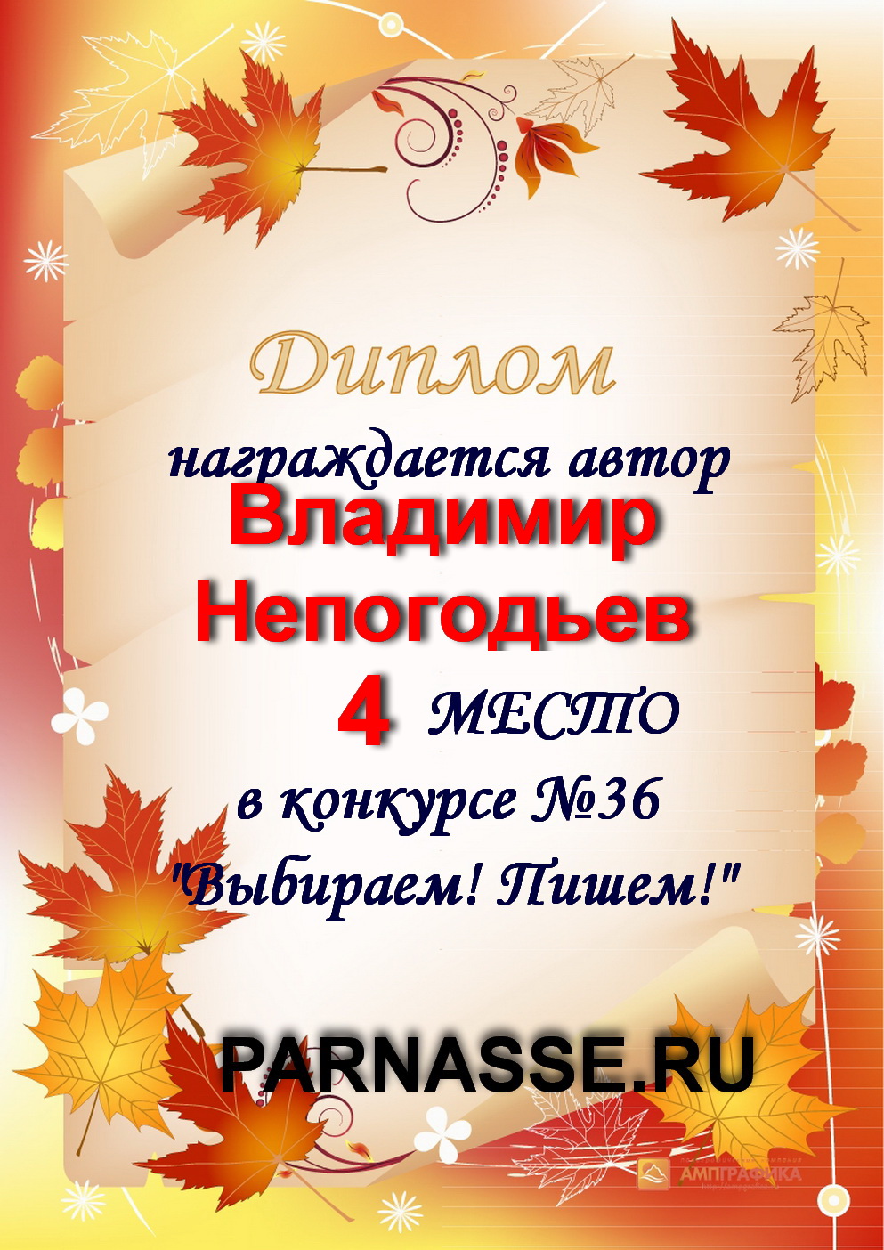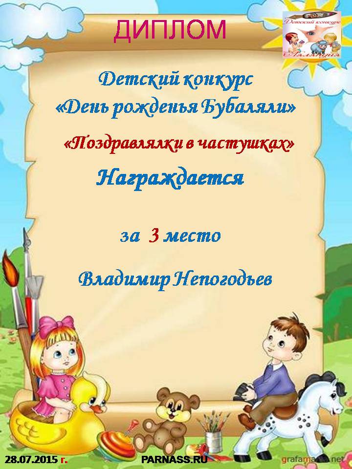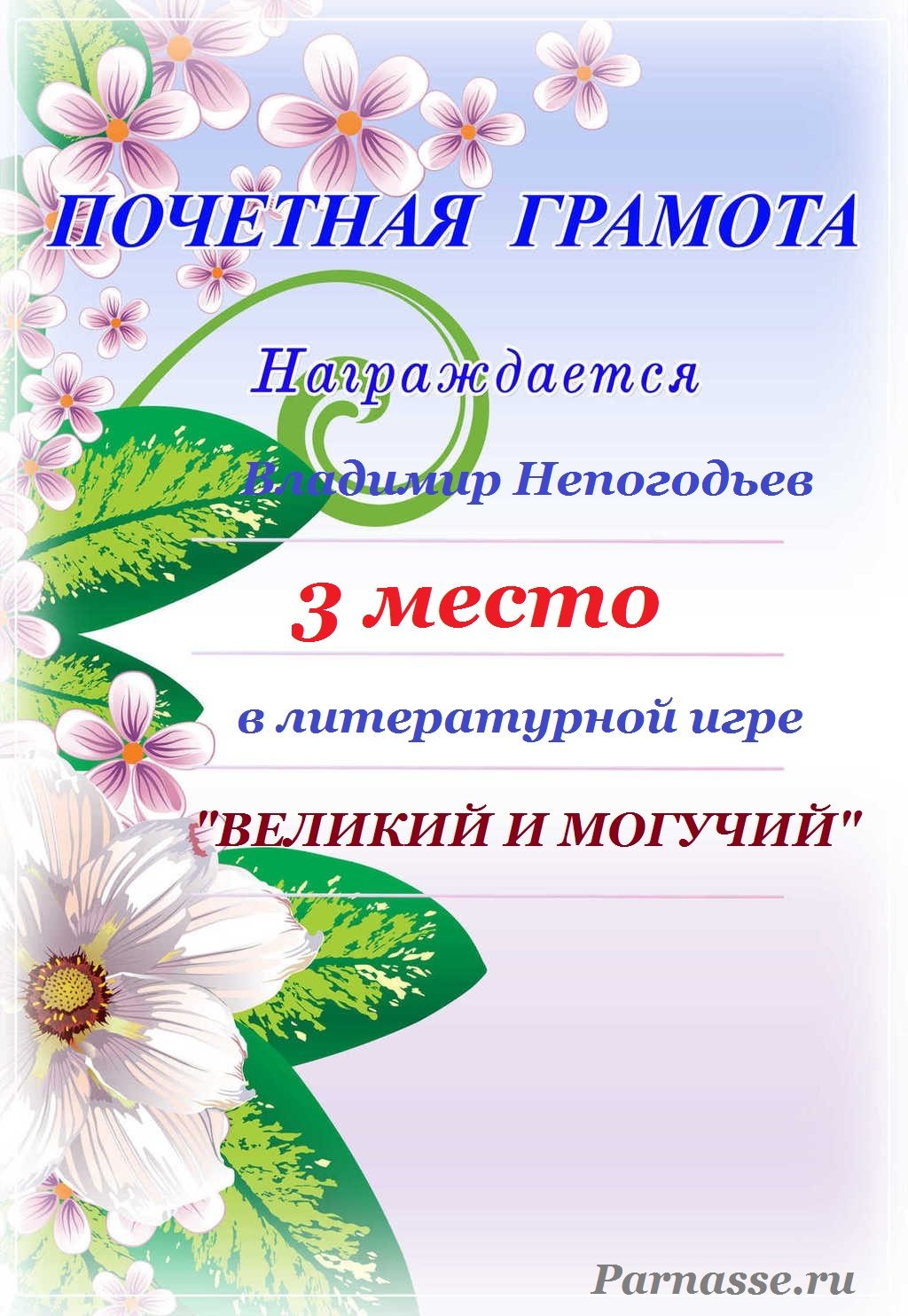Диплом за 1 место в праздничном конкурсе "Поздравим Парнас с трёхлетием вместе!"