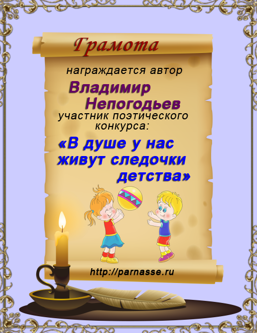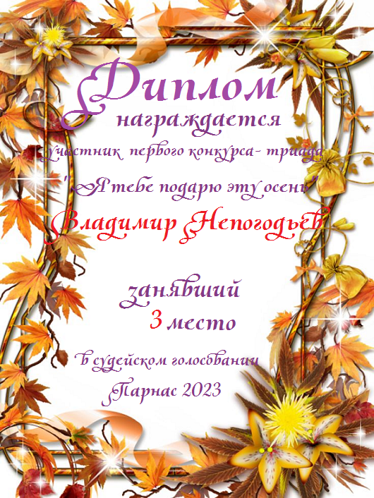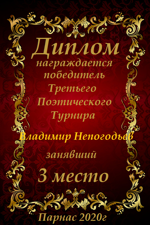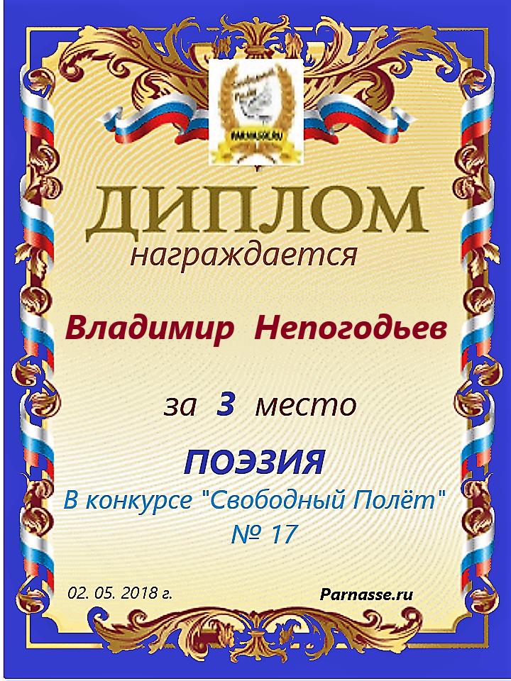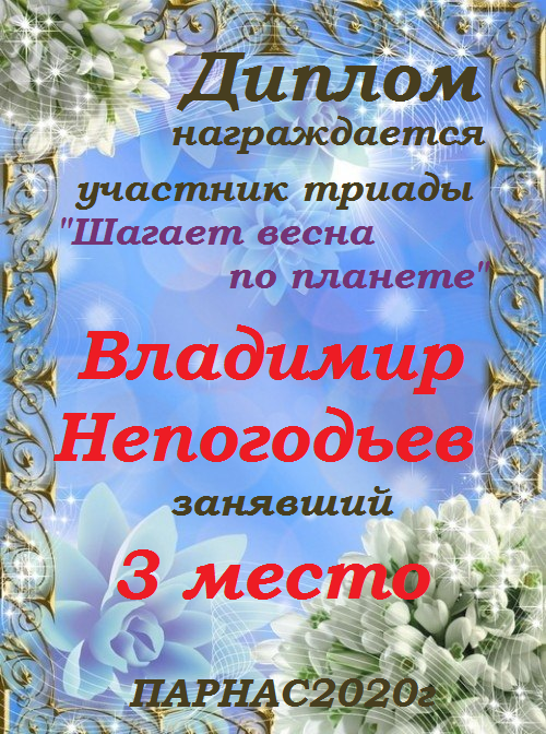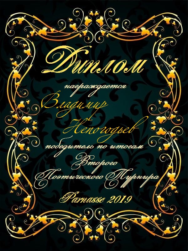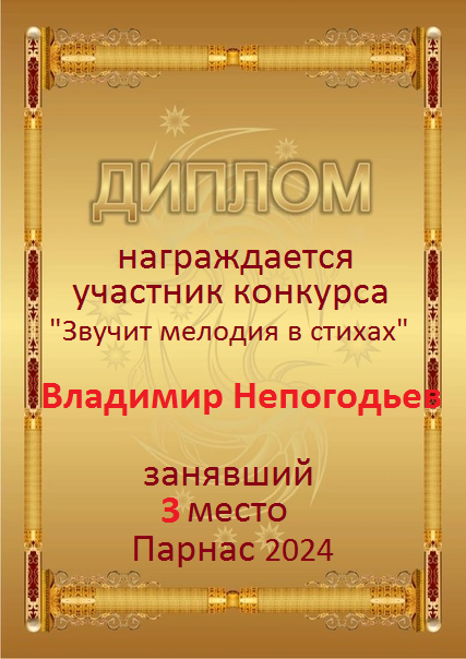 Номинация "Лучшая поздравительная песнь Парнасу". Разрешите Вас поблагодарить за великолепные, преисполненные тепла и добра песни, адресованные в эту замечательную дату нашему любимому сайту. Три года – это не срок, но дата! "Парнас" стал на ноги, но без таких авторов как Вы, это было бы невозможно! Спасибо Вам за все, будьте всегда жизнерадостны, любимы, добры и счастливы, а Ваше прекрасное творчество пусть регулярно радует наш слух и душу! Будьте здоровы!