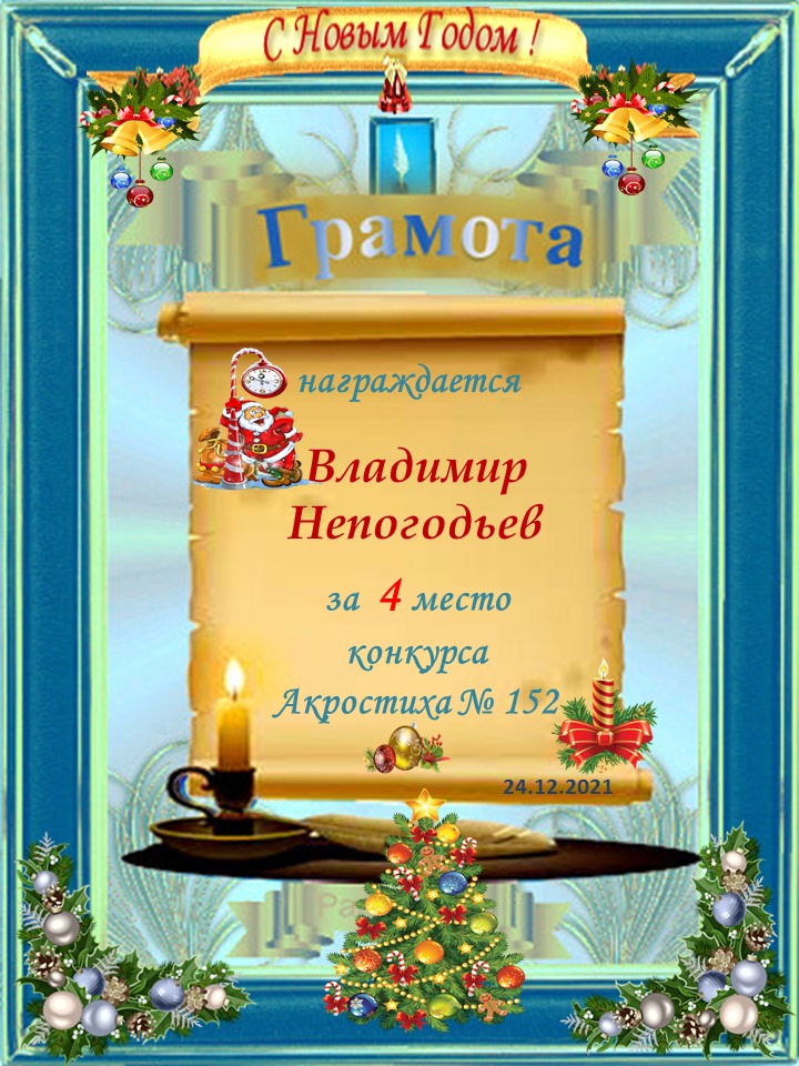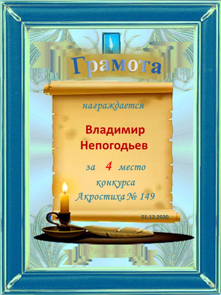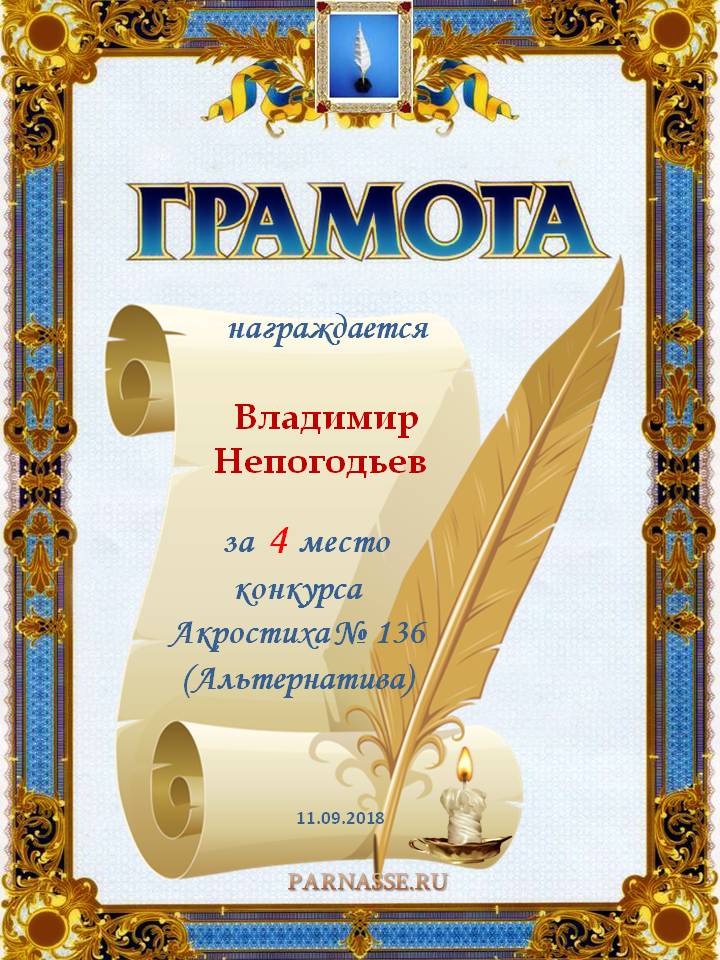 Грамота за 4 место в 129 конкурсе АКРОСТИХА (Альтернатива)! ПОЗДРАВЛЯЮ!