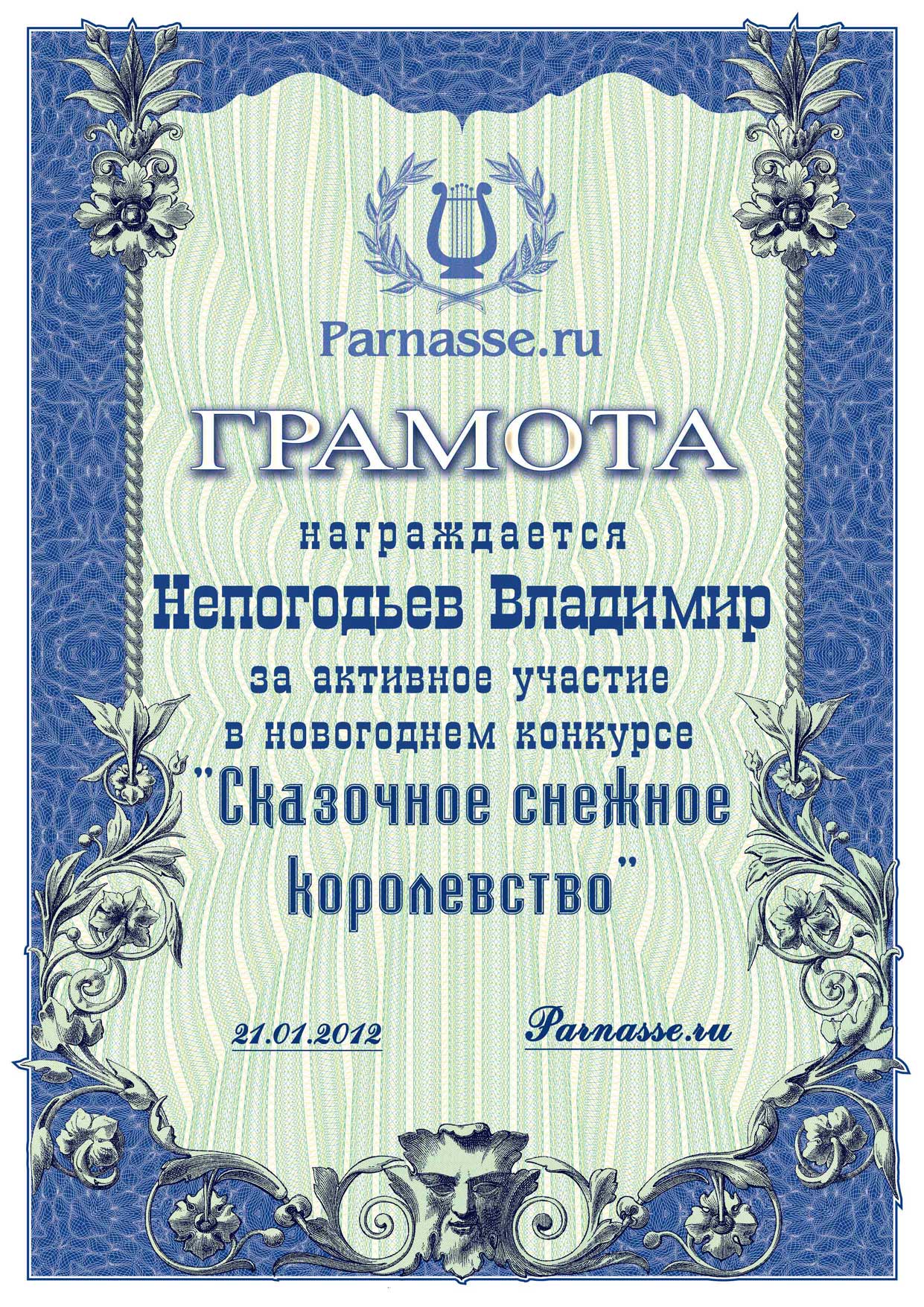 ГРАМОТА за победу в Блиц-Турнире по частушкам от 5.06.2012
