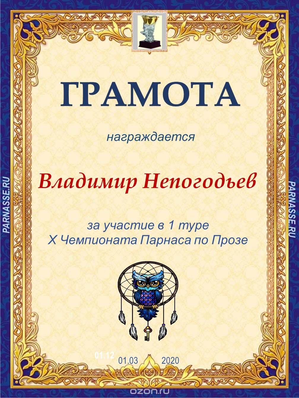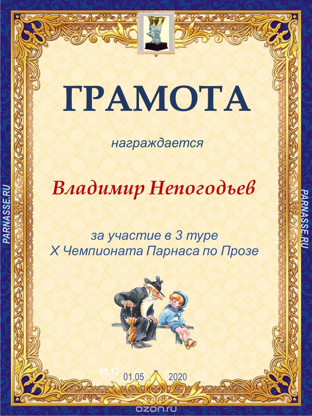 ![]() Медаль за 3 место в 1 туре XV Чемпионата Парнаса по прозе