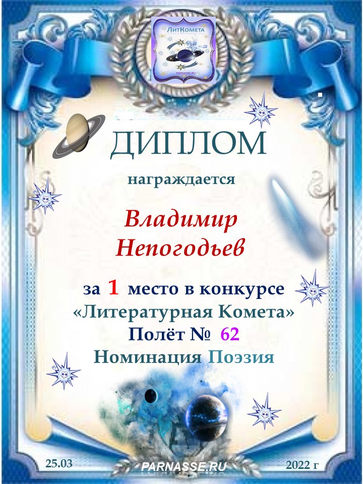 ![]() Медаль за 1 место в конкурсе "ЛитКомета - Полёт № 94" - Номинация Поэзия