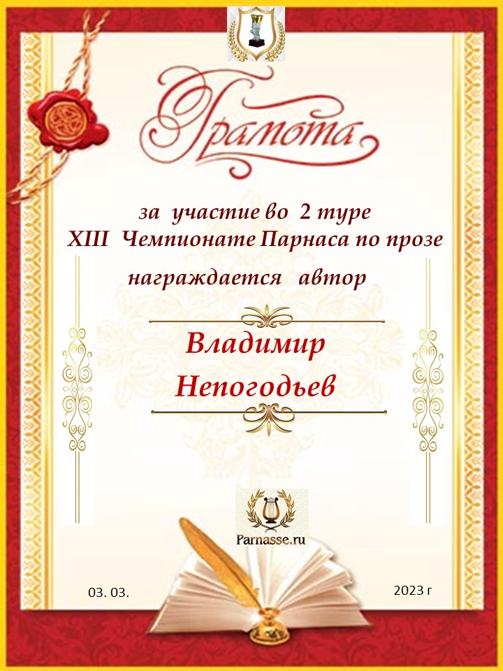 ![]() Медаль автора-участника во 2 туре XV Чемпионата Парнаса по прозе