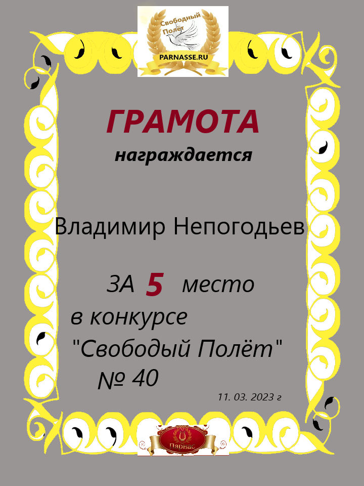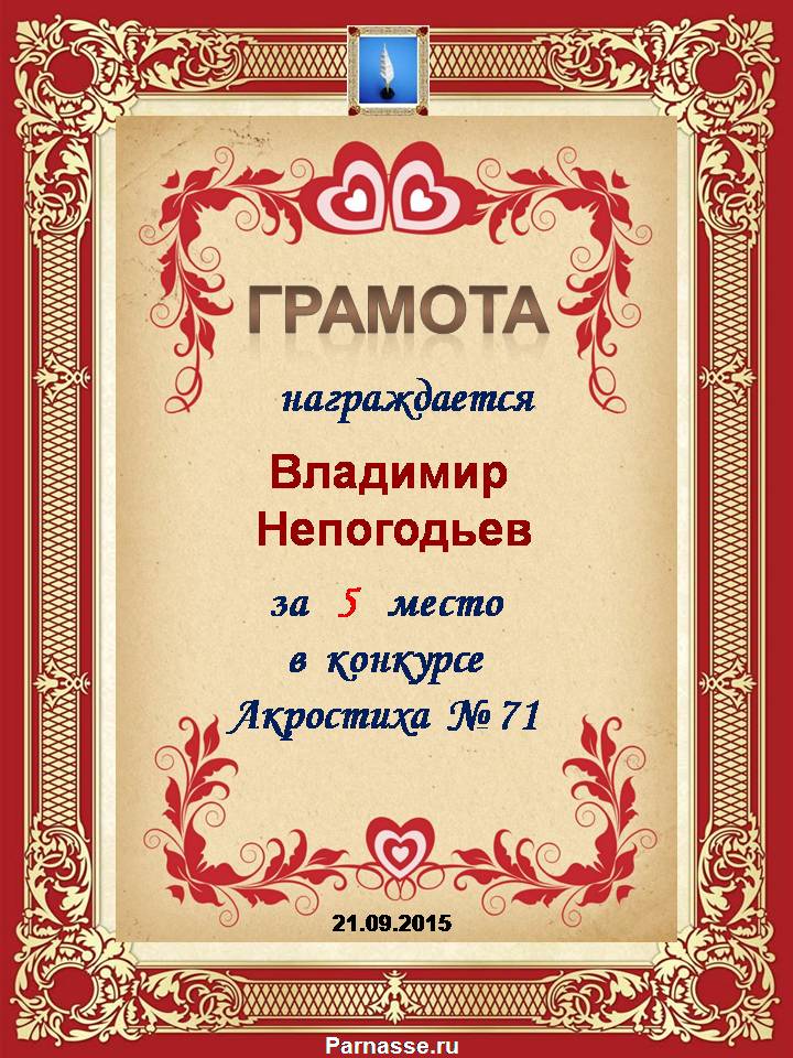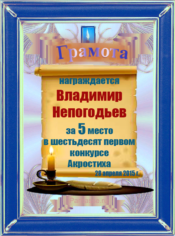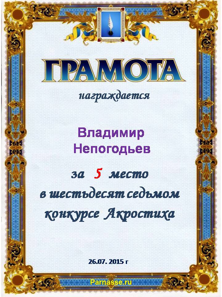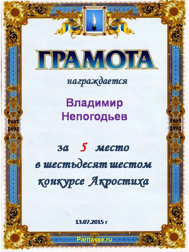 Грамота за 5 место в 105 конкурсе АКРОСТИХА (Альтернатива)! ПОЗДРАВЛЯЮ!