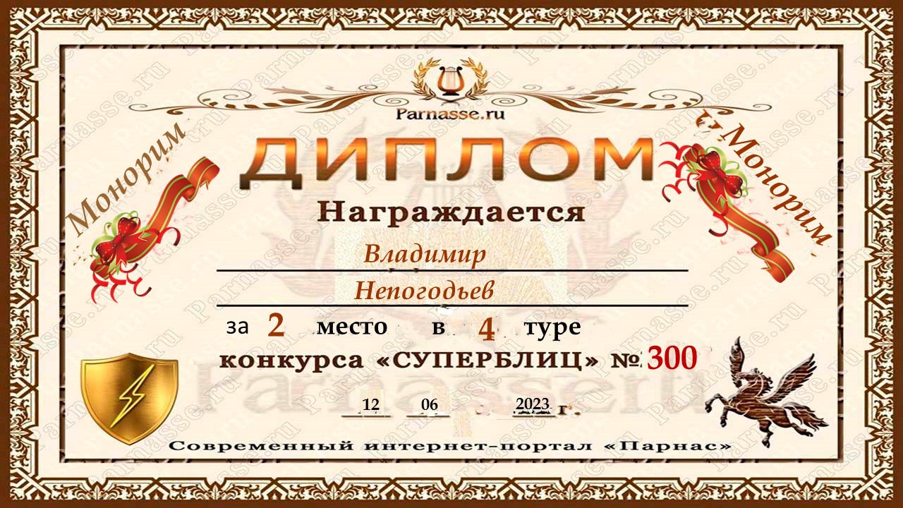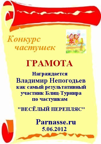 Владимир, поздравляем с Победой в Блиц-Турнире по частушкам, состоявшемся 5.06.2012 !