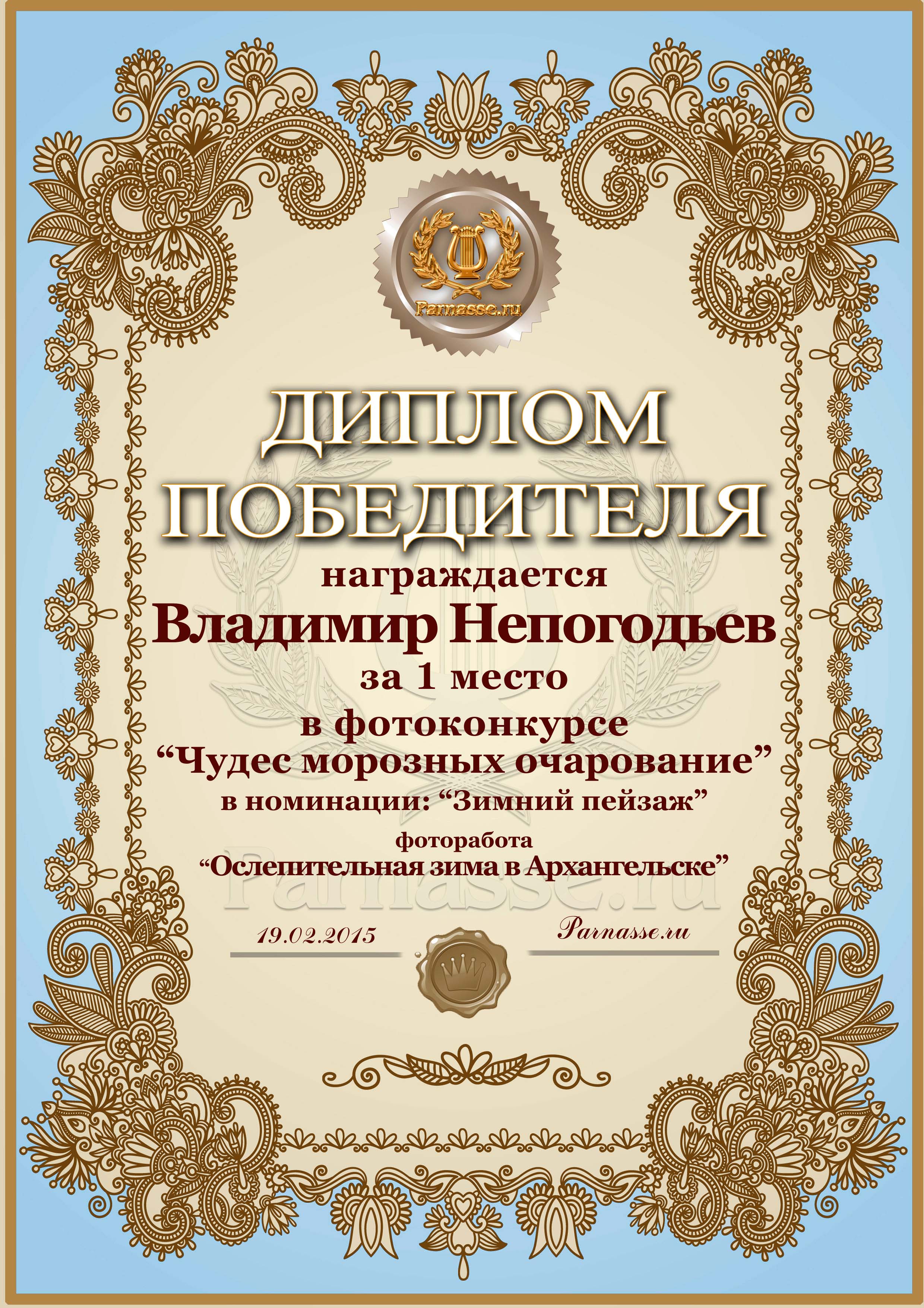 Диплом за 1 место в фотоконкурсе "Чудес морозных очарование"