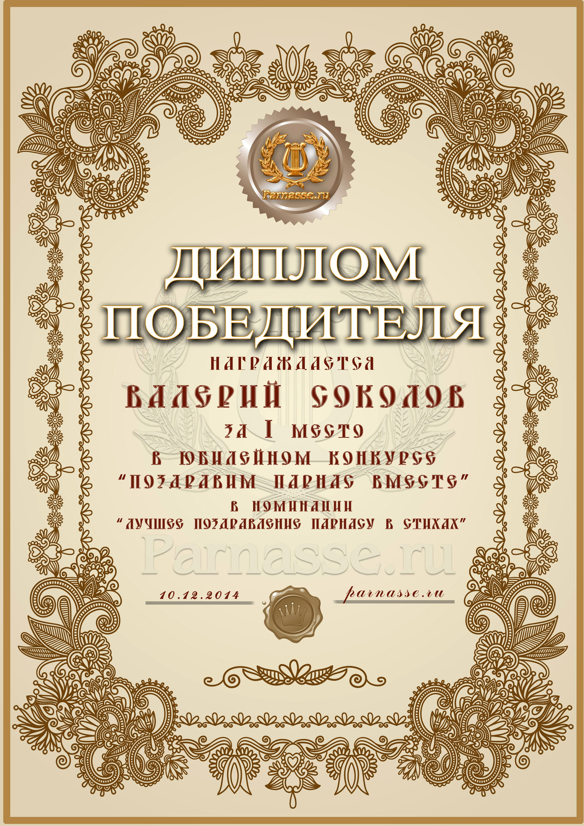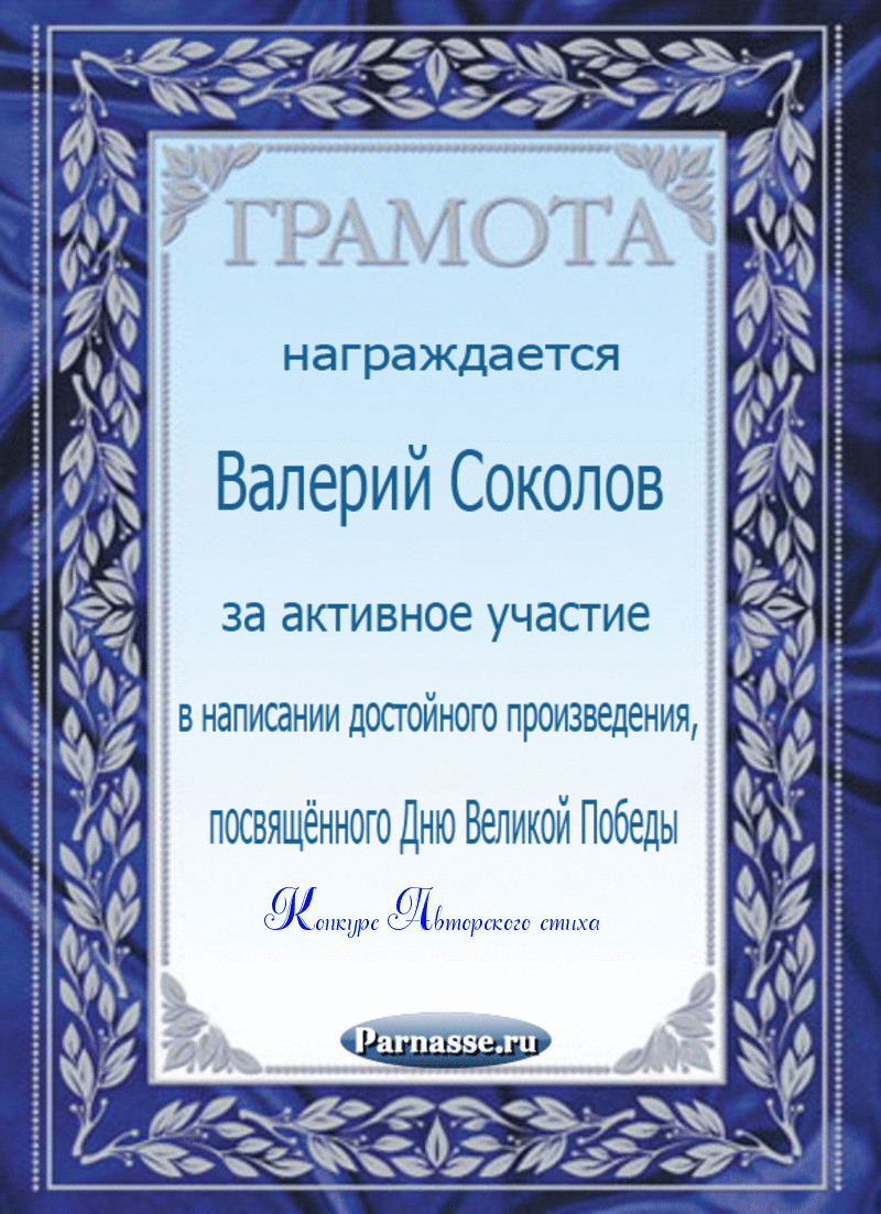 Первое место в праздничном конкурсе "ПОЗДРАВИМ ПАРНАС ВМЕСТЕ!", в номинации "Лучшее стихотворное поздравление Парнасу". Позвольте от всей души выразить Вам благодарность за прекрасные поэтические слова поддержки, самые тёплые пожелания нашему Парнасу и пожелать Вам новых побед на литературном поприще, успехов в жизни и всех Ваших начинаниях! Будьте счастливы, здоровы, пусть удача не покидает Вас ни на минуту и от всей души СПАСИБО! Оставайтесь с нами и мы будем вновь и вновь встречать Дни рождения "Парнаса" в одной дружной, душевной компании! Произведение "Сайт «Парнас», люблю тебя!"