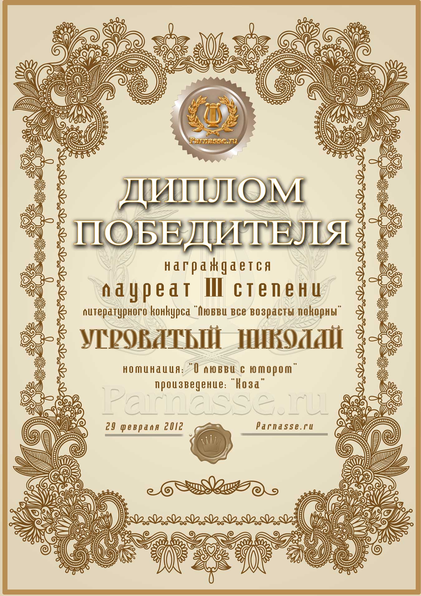 Диплом лауреата III степени лит.конкурса "Любви все возрасты покорны"