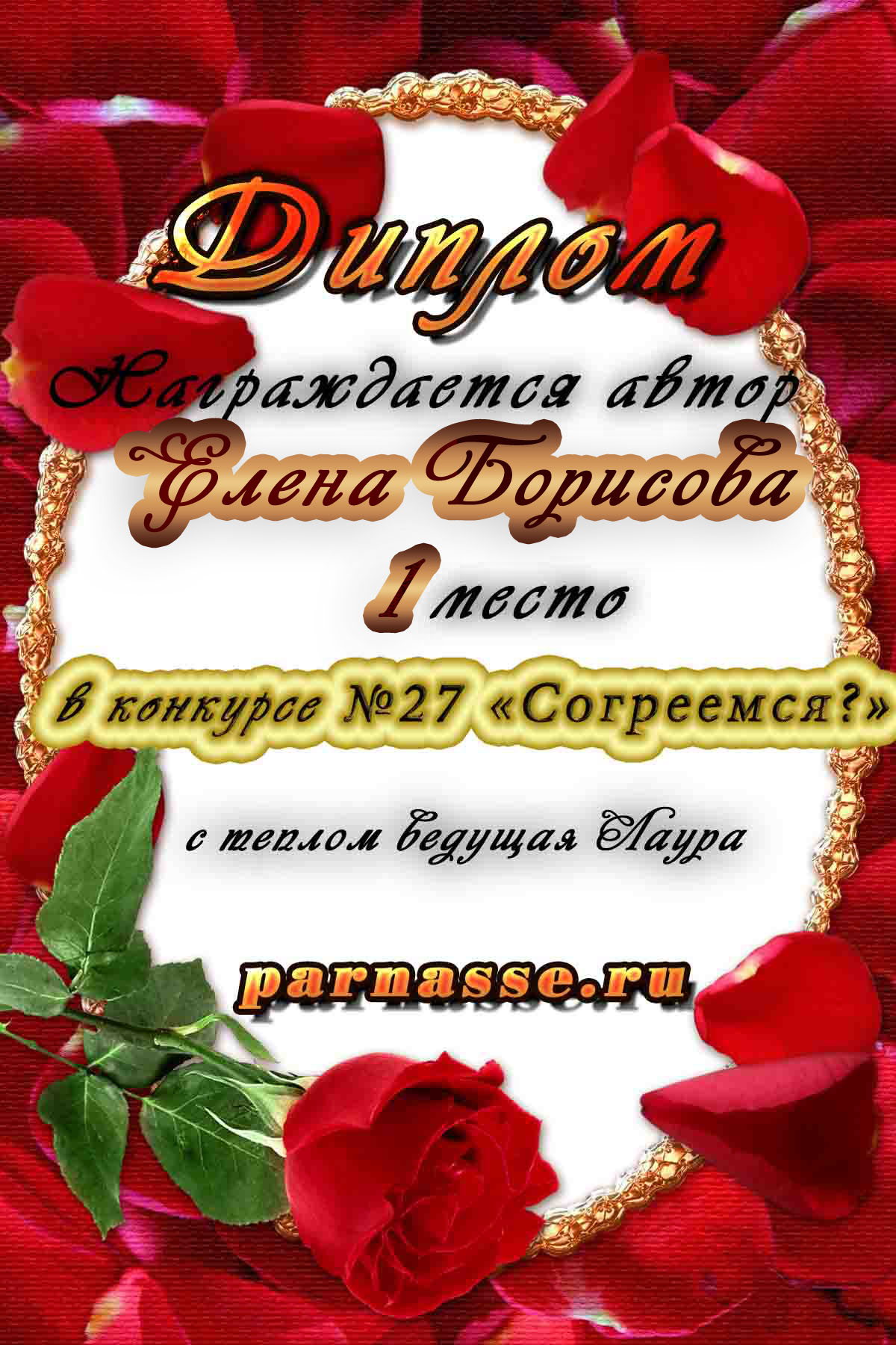 Диплом за 1 место в праздничном конкурсе "Поздравим Парнас с трёхлетием вместе!"