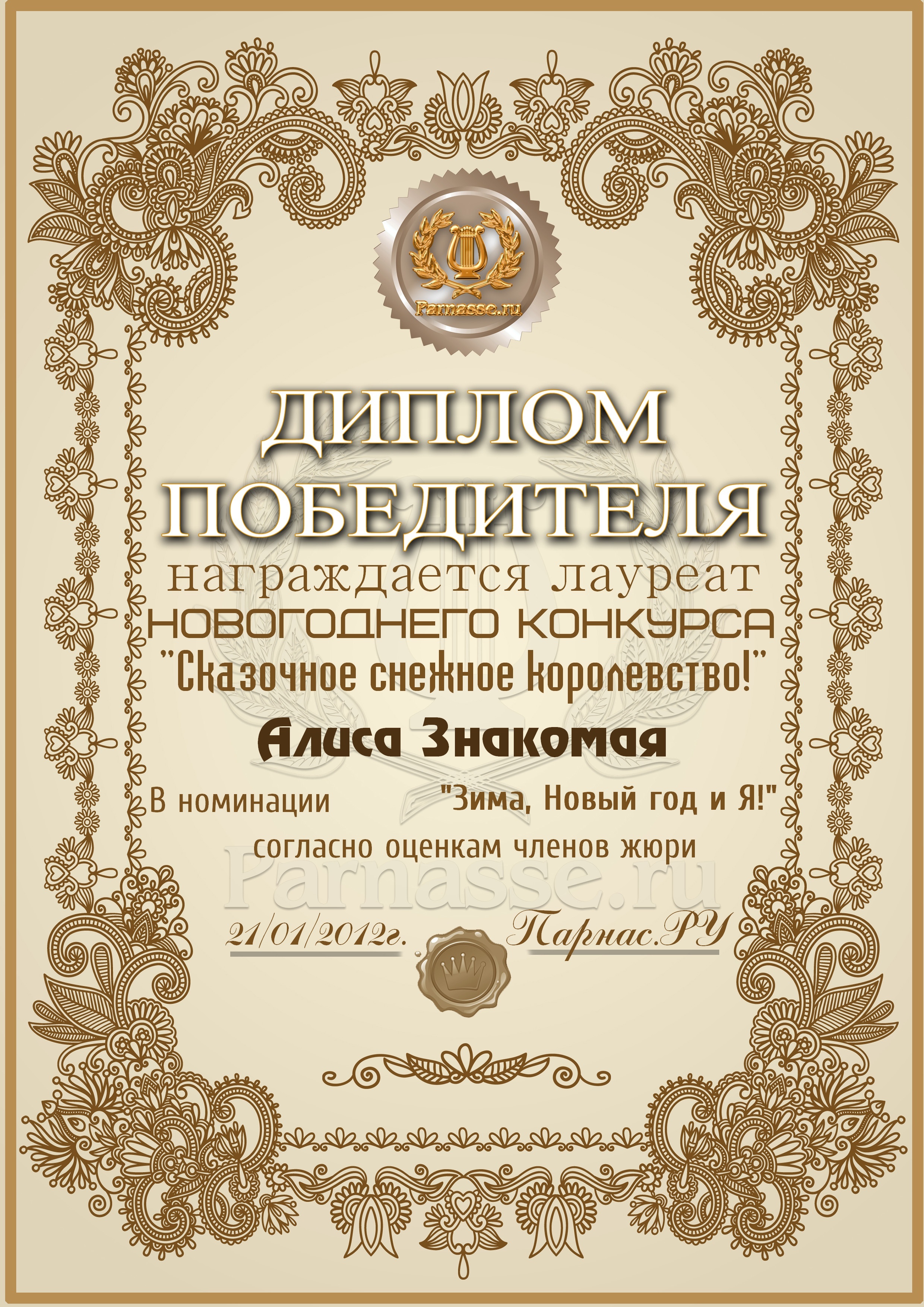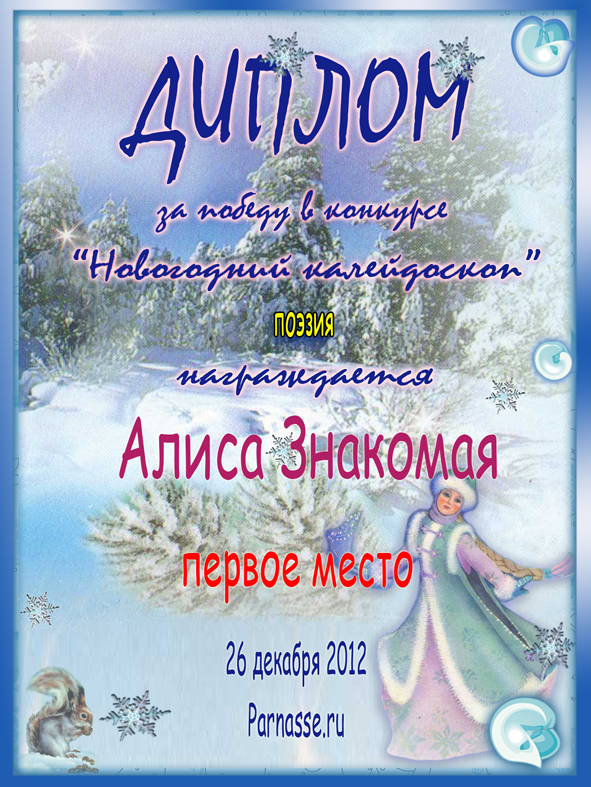 Лауреату новогоднего конкурса "Сказочное снежное королевство!" за первое место в номинации "Зима, Новый год и Я!" согласно оценкам членов жюри.