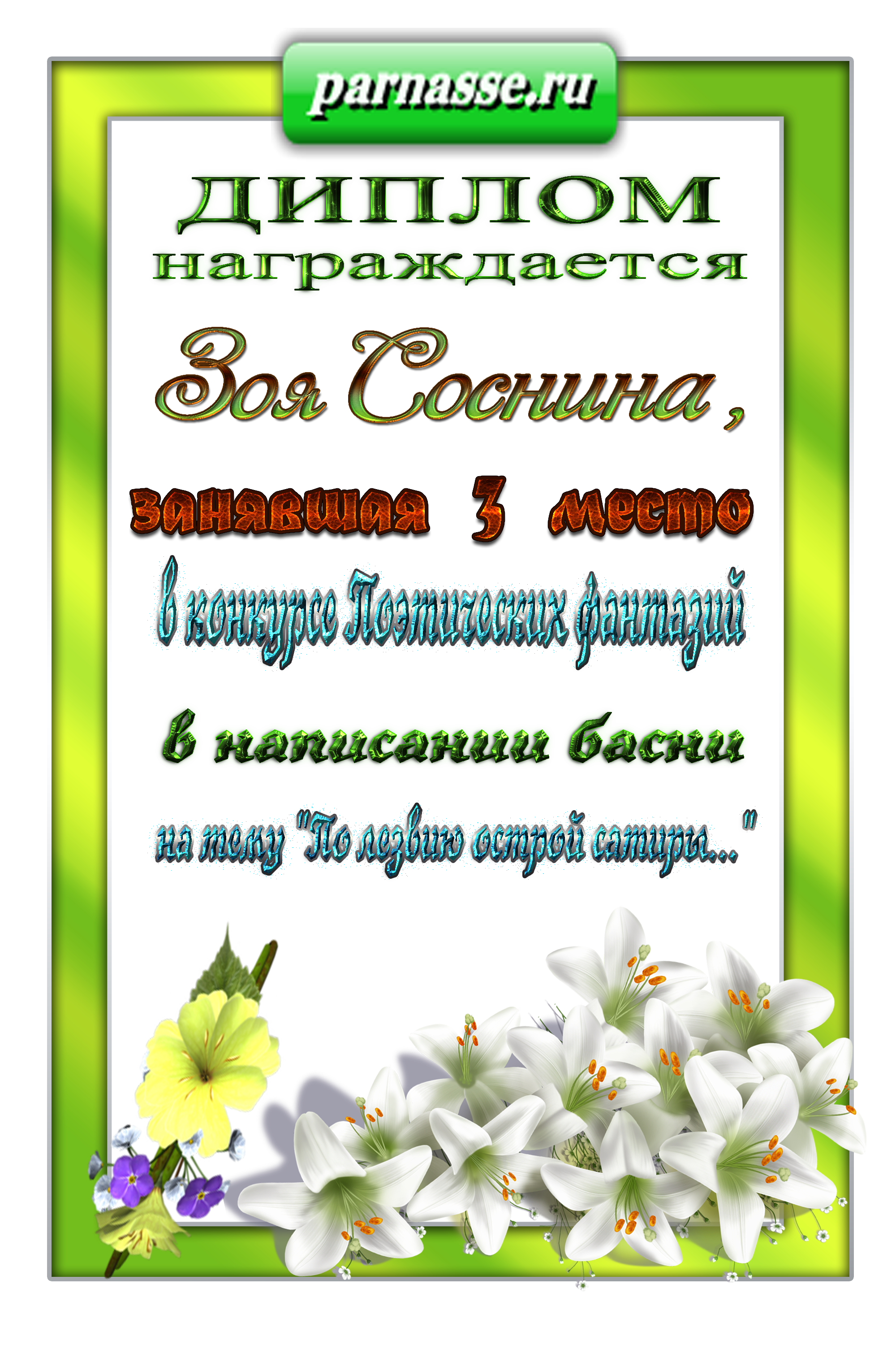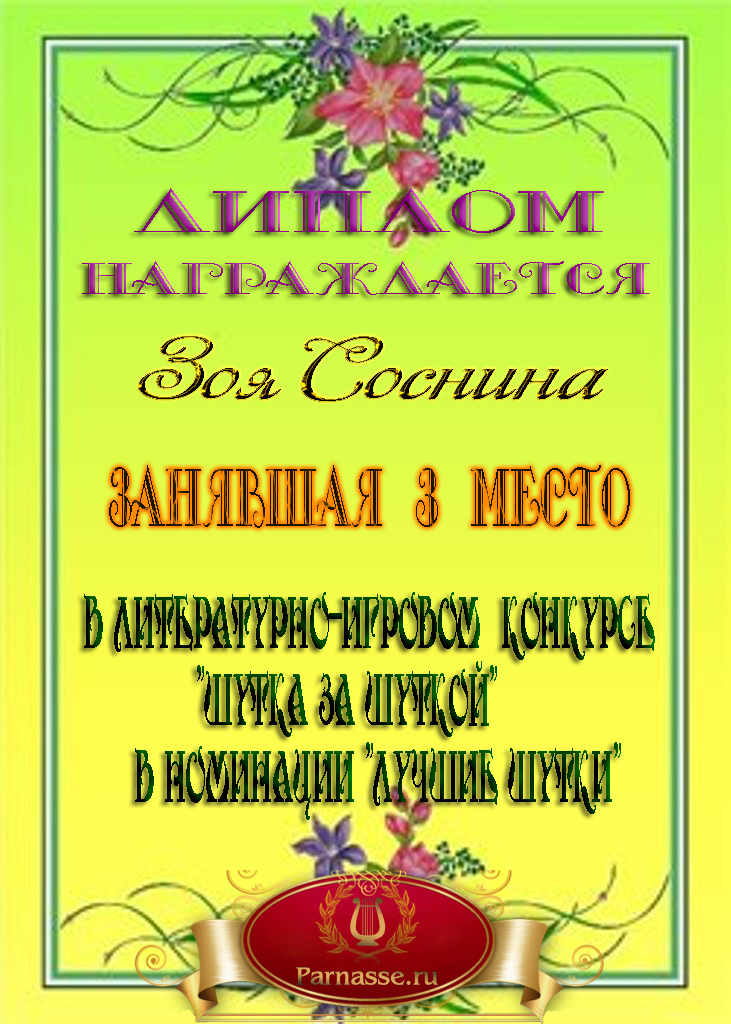 ТРЕТЬЕ место в музыкально – литературном конкурсе «Моё весёлое лето. Июнь». Номинация «Лучшие июньские поздравления». Произведение "Судьба и к Вам была неравнодушна". Поздравляем!