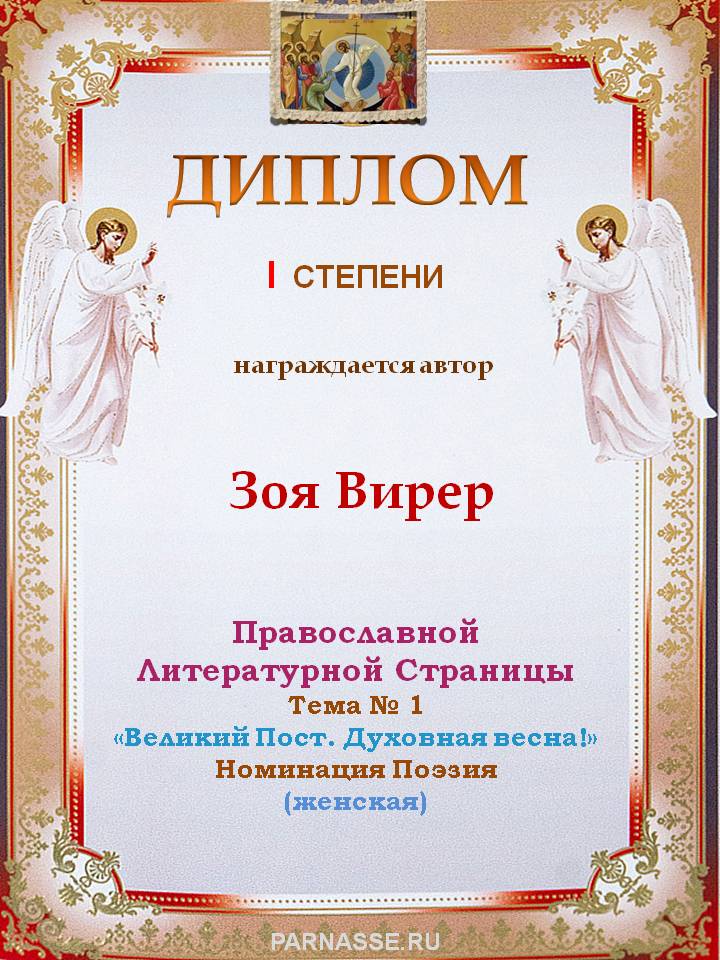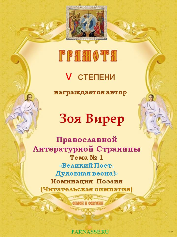 За 5-е место на Православной Литературной Странице, Тема № 1 "Великий Пост. Духовная весна!" Номинация Поэзия. Читательская симпатия.