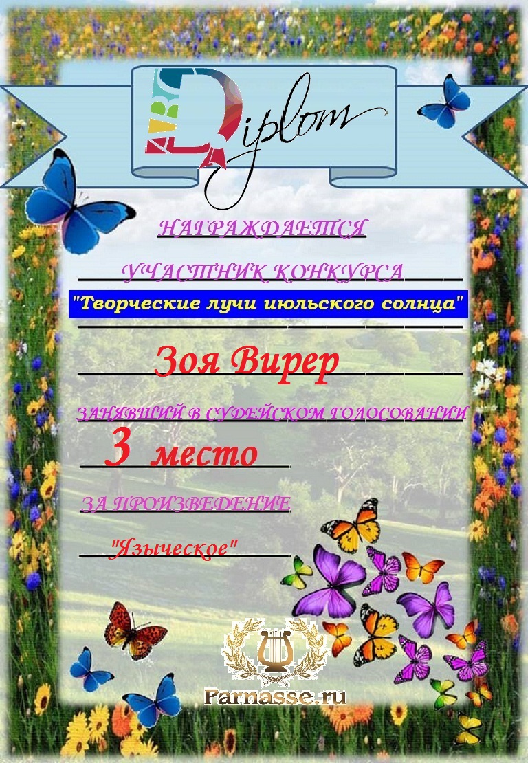 Третье место в ЛитКонкурсе "Творческие лучи июльского солнца", в поэтической номинации "Жара поэту не помеха". Судейское голосование. Поздравляем с прекрасной победой! Спасибо за активное участие! Ждем Ваши великолепные, изумительные стихи на новых ЛитКонкурсах.. Желаем много радости, счастья и море положительных эмоций!