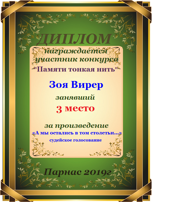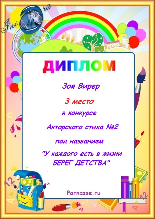 Диплом за 3 место в конкурсе авторского стиха №2 под названием "У каждого есть в жизни Берег Детства".
