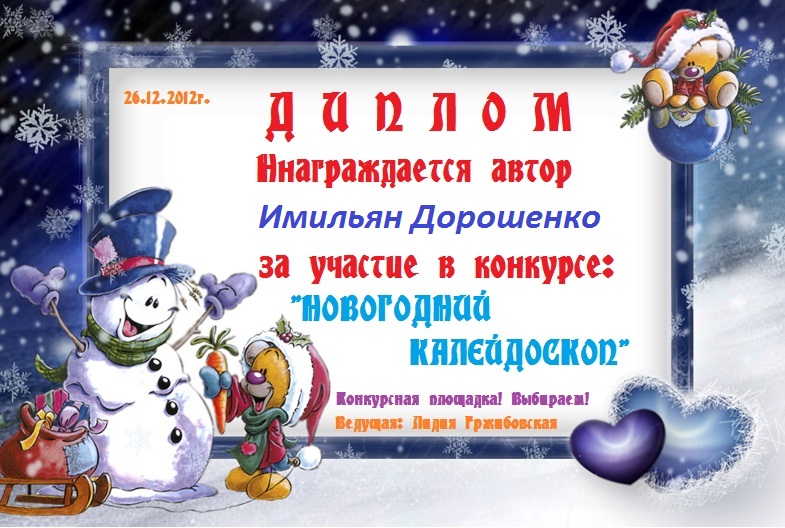Третье место в музыкально-литературном конкурсе «ЗИМНЯЯ СКАЗКА», в номинации «А за городом зима, зима, зима»! Произведение «МАСКАРАД ПРОВОЖАЕМ ОСЕНЬ»! Поздравляем с блестящей победой в конкурсе, Имильян!